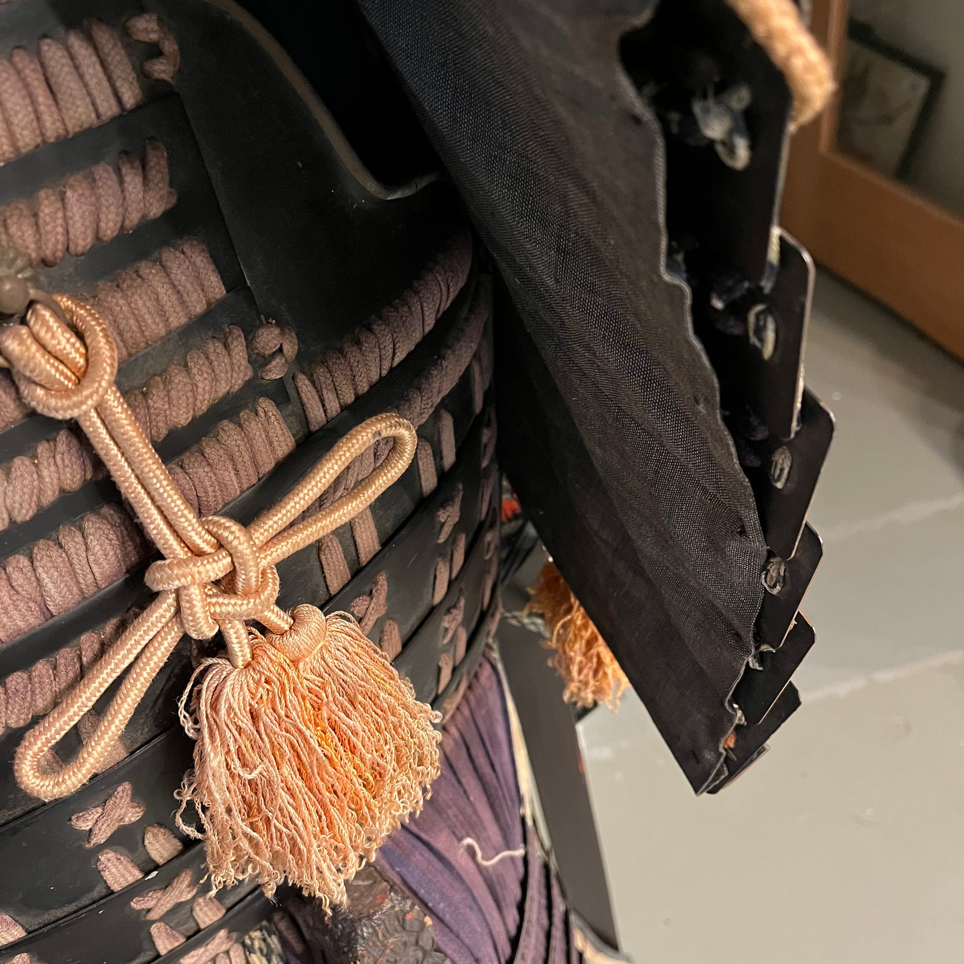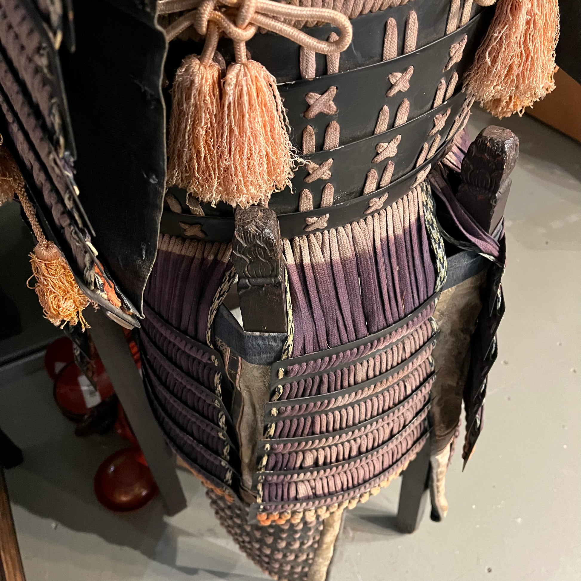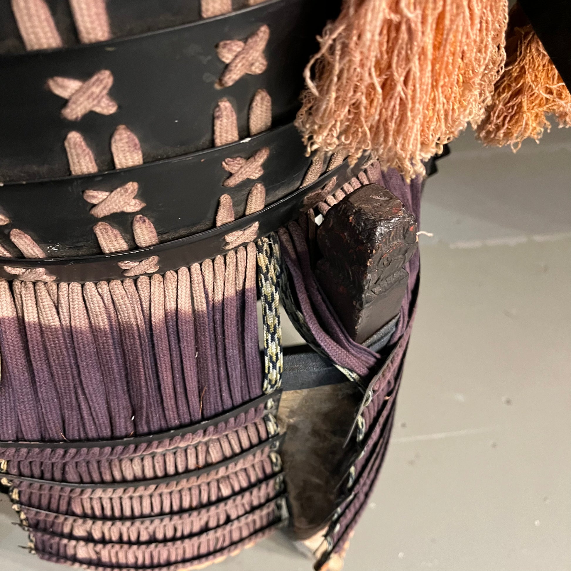 This armor is made of steal plating held together with silk cords. It includes the body, helmet, shoulder parts and thigh covers. While not complete with all parts (gauntlets, foot covers, etc.) it certainly makes an impressive statement piece. Likely used for ceremonial purposes or pageantry in the 19th century. The whole set was made with great care for details that Japanese arts are known for. It has not be well maintained in recent decades and has condition issues that can be seen in the photos such as fading and frayed cords.