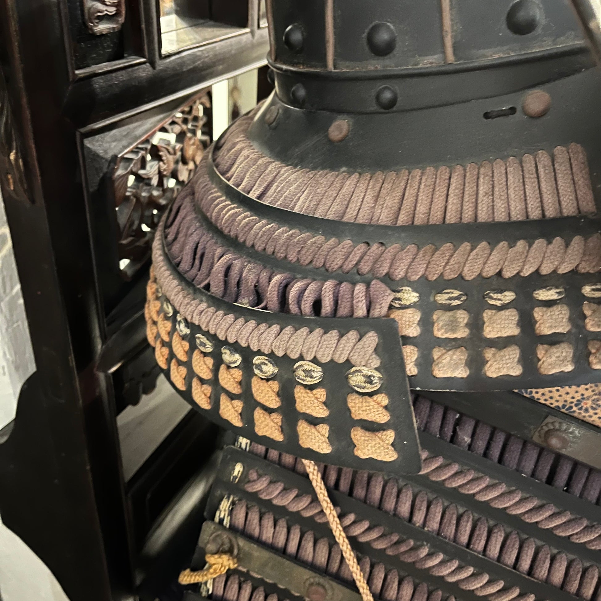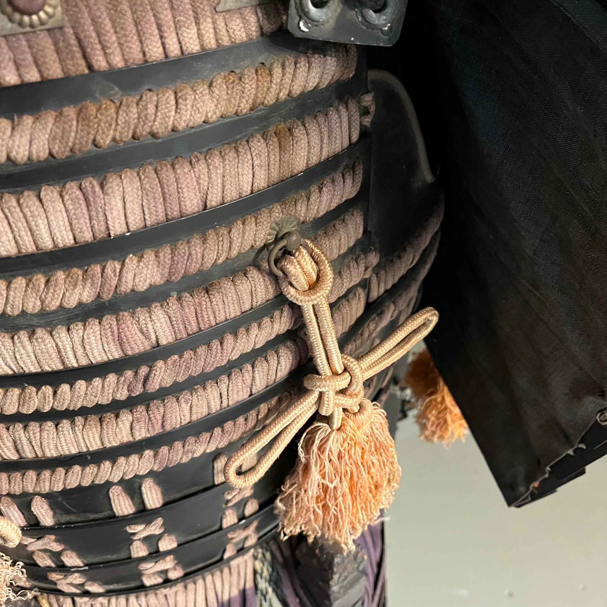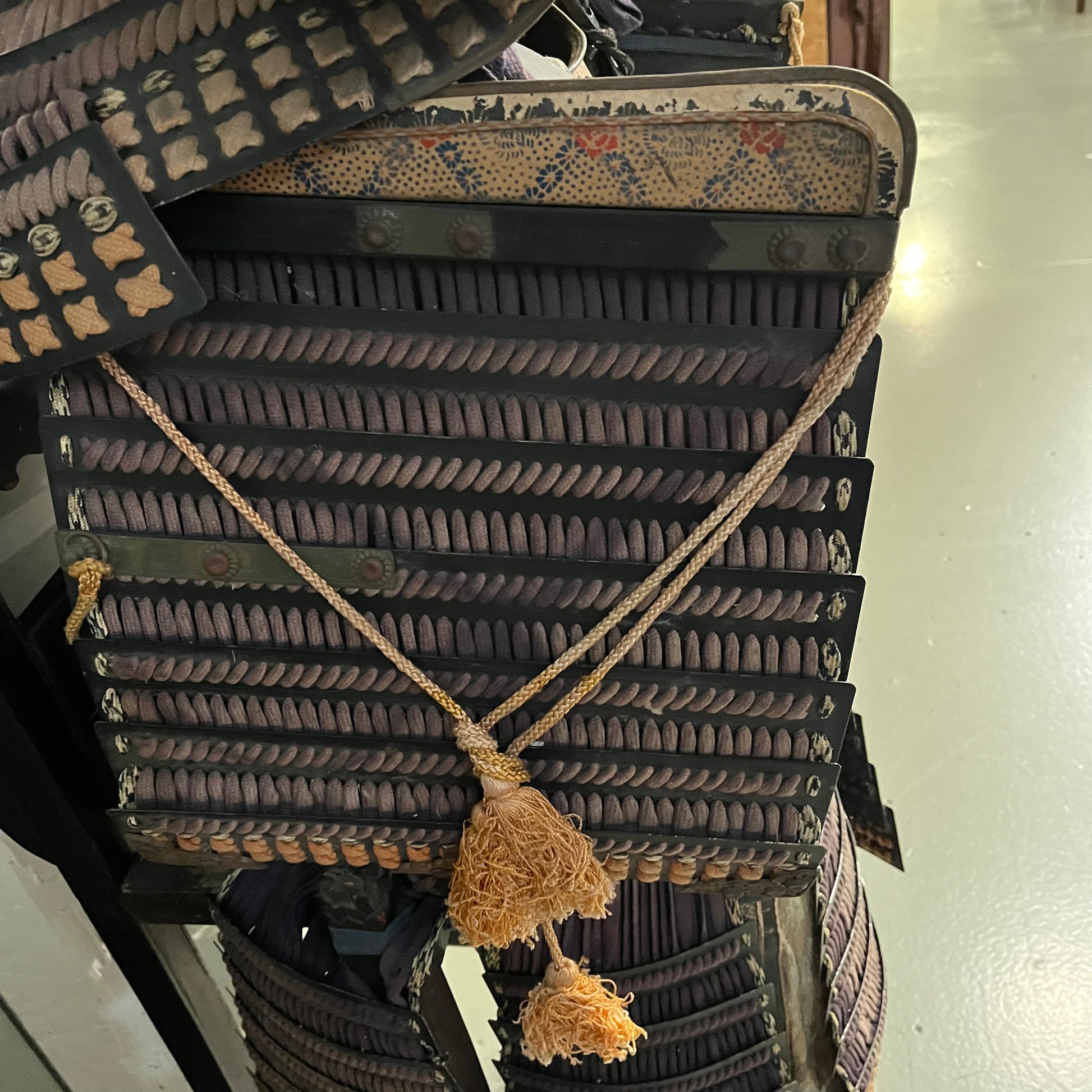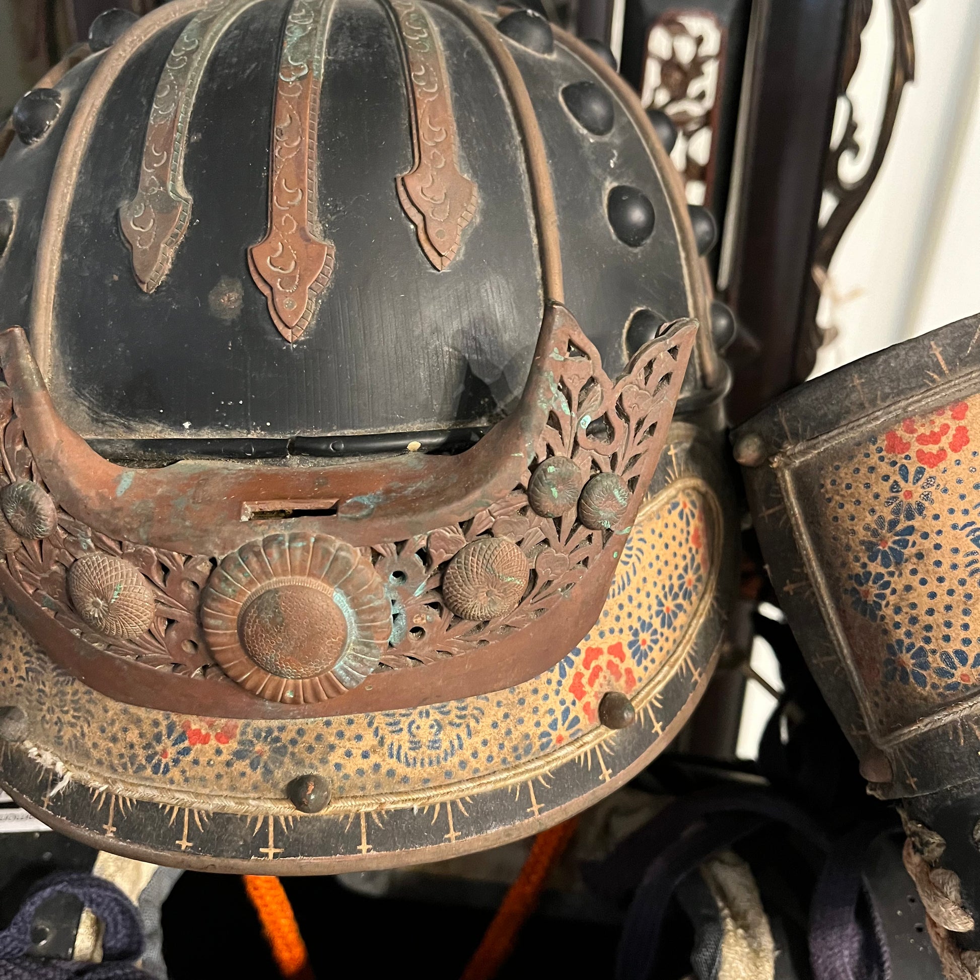 This armor is made of steal plating held together with silk cords. It includes the body, helmet, shoulder parts and thigh covers. While not complete with all parts (gauntlets, foot covers, etc.) it certainly makes an impressive statement piece. Likely used for ceremonial purposes or pageantry in the 19th century. The whole set was made with great care for details that Japanese arts are known for. It has not be well maintained in recent decades and has condition issues that can be seen in the photos such as fading and frayed cords.