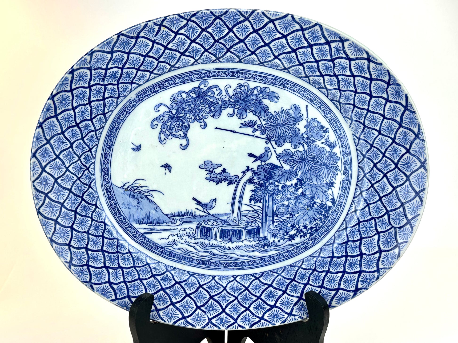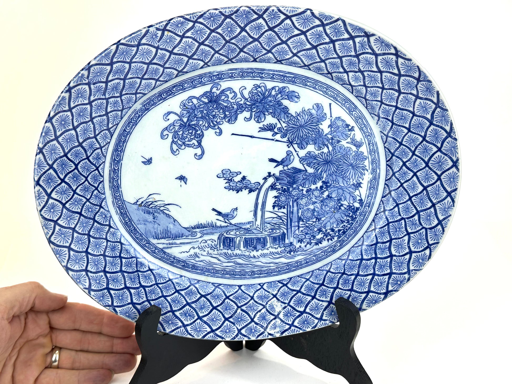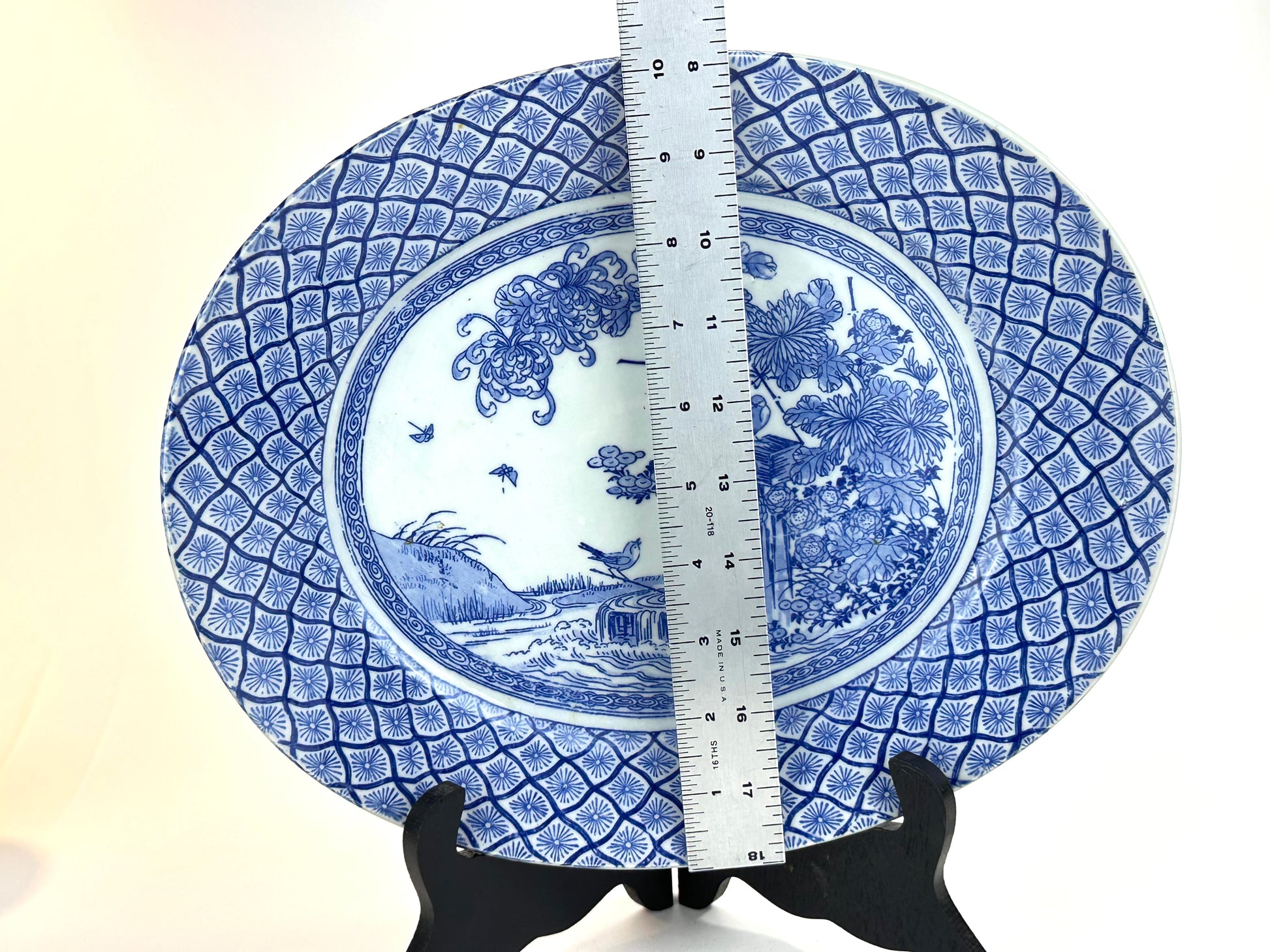 Antique Japanese Meiji Period c1890's Blue & White Porcelain Landscape Plate 12"W