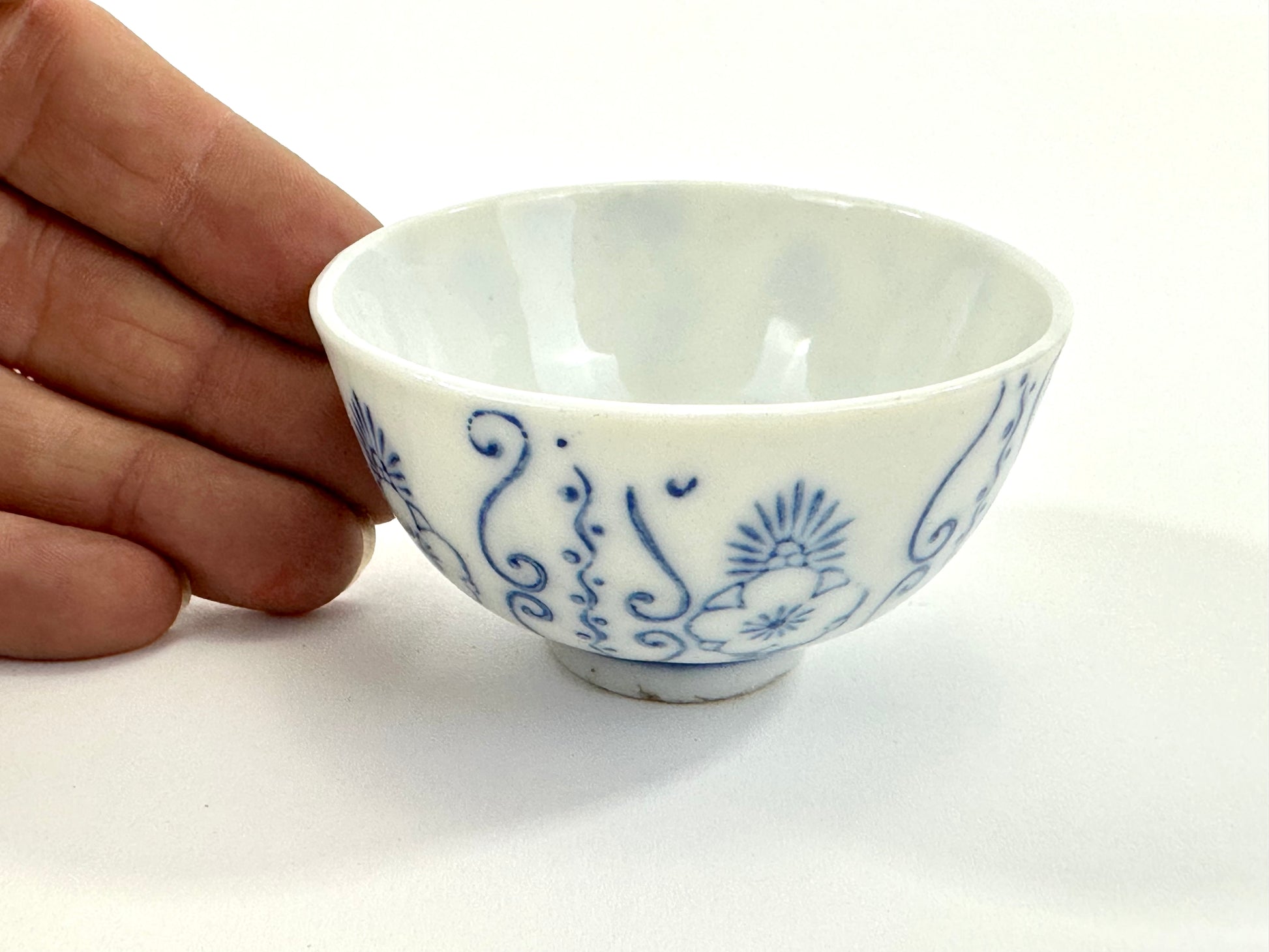 Antique Japanese Porcelain Cup with Blue Floral Pattern, 3" Diameter