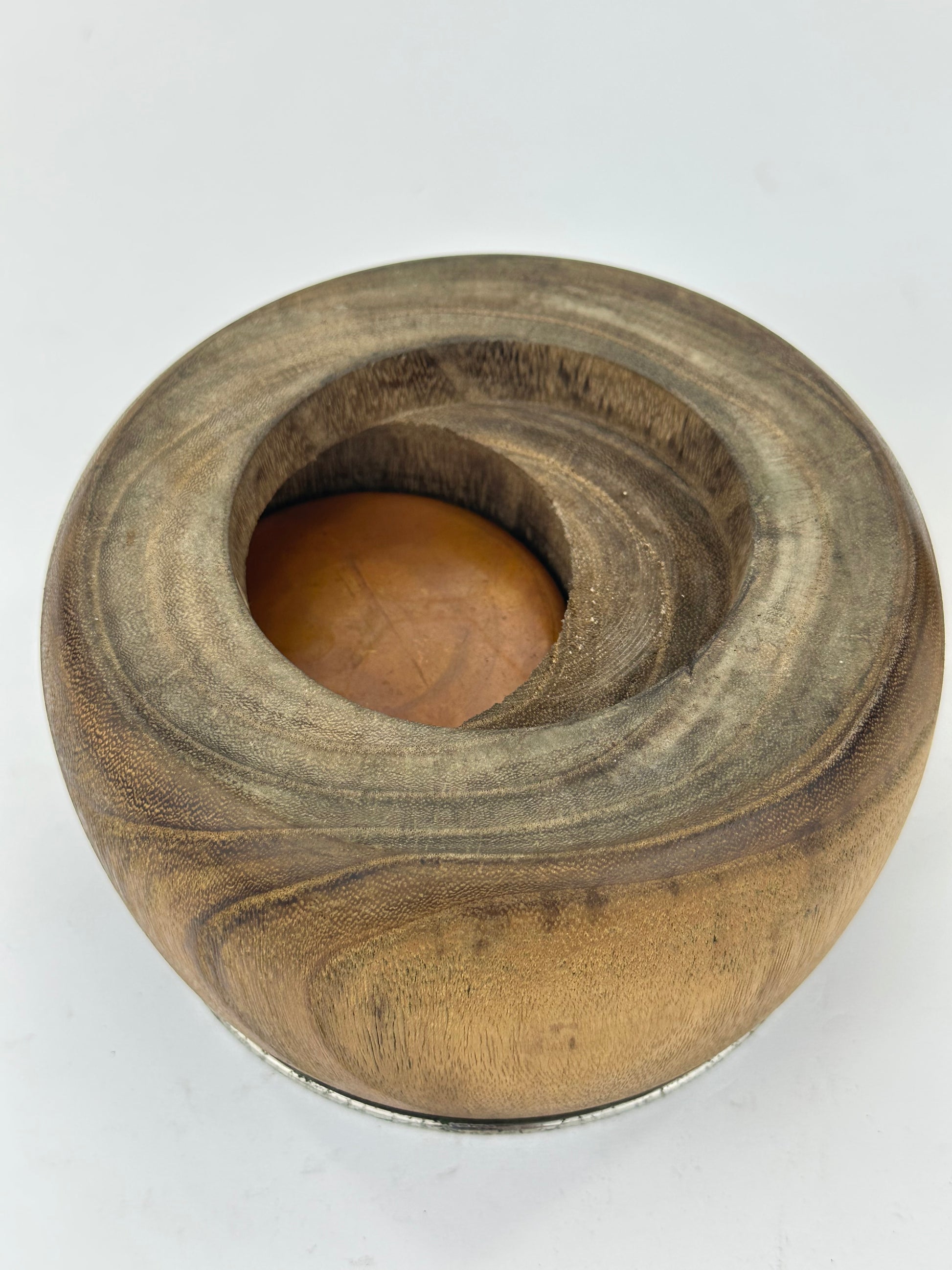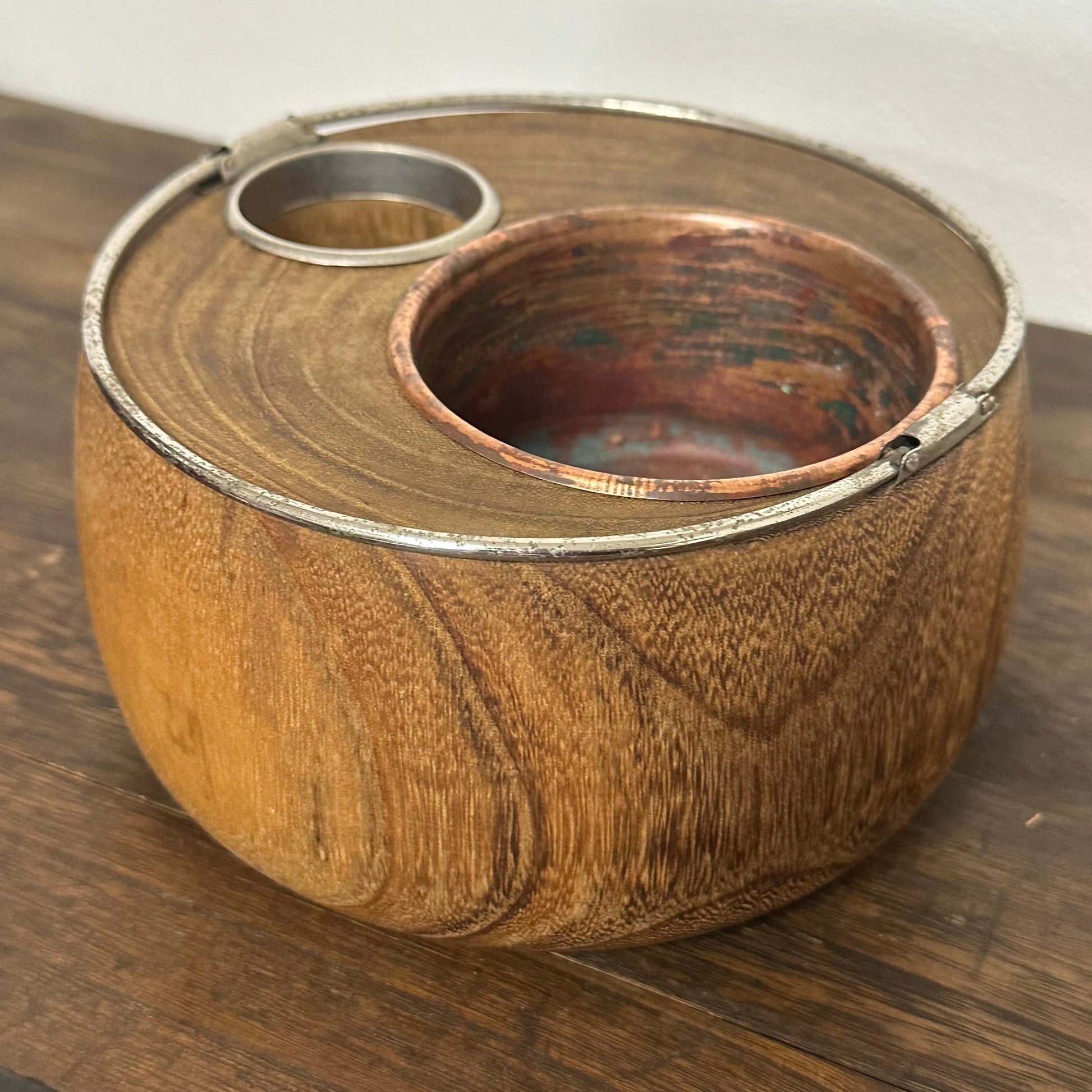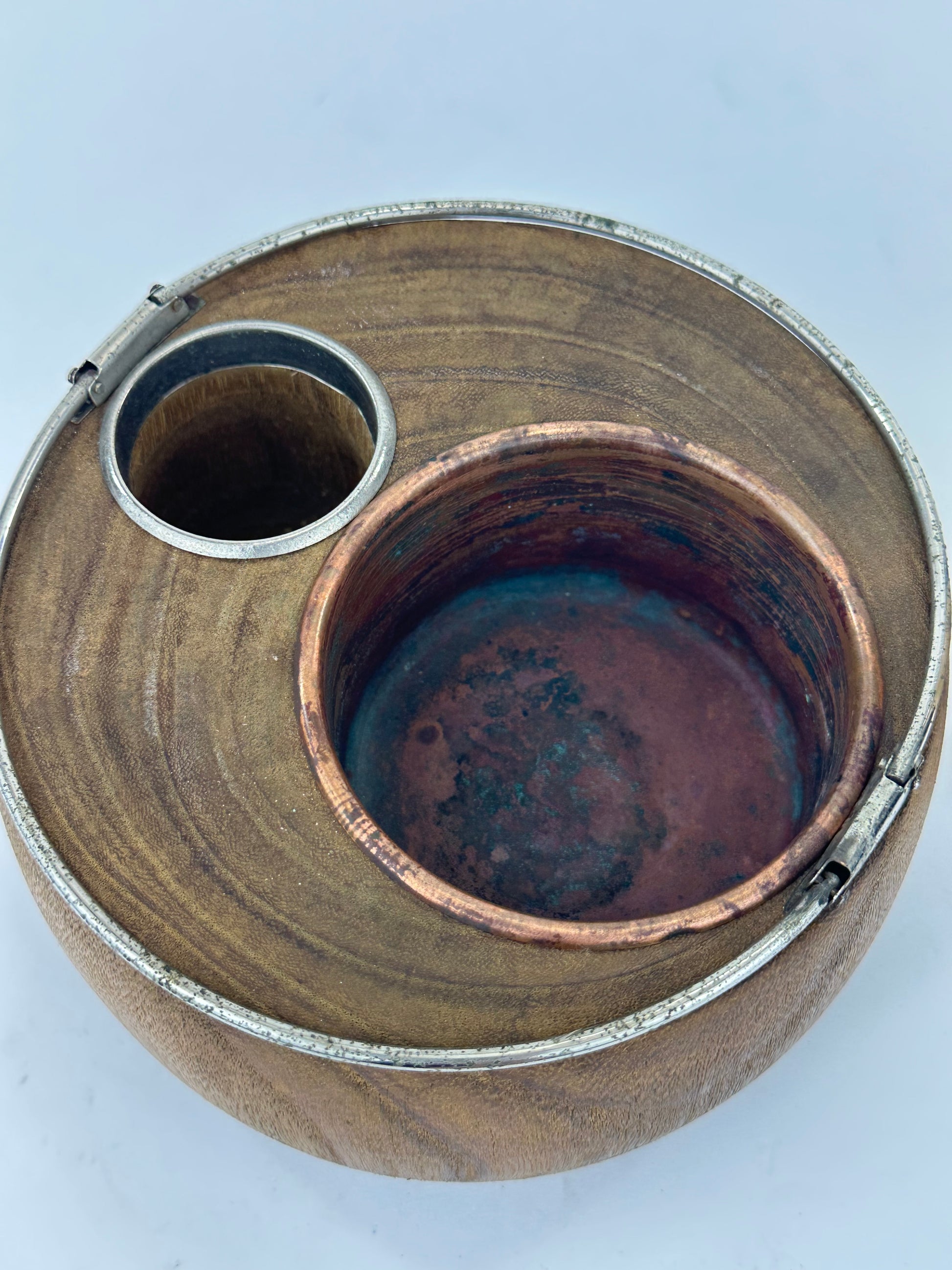 A beautifully crafted Japanese tabakobon (煙草盆) smoking set once used in the traditional kiseru pipe-smoking ritual. The circular wood body features a silver-metal alloy rim, a removable copper-lined fire bowl (hiire / 火入) for charcoal, and a bamboo haifuki (灰吹) tube that fits into the smaller opening. A folding metal carry handle completes the set, allowing this to be carried room-to-room in the home.