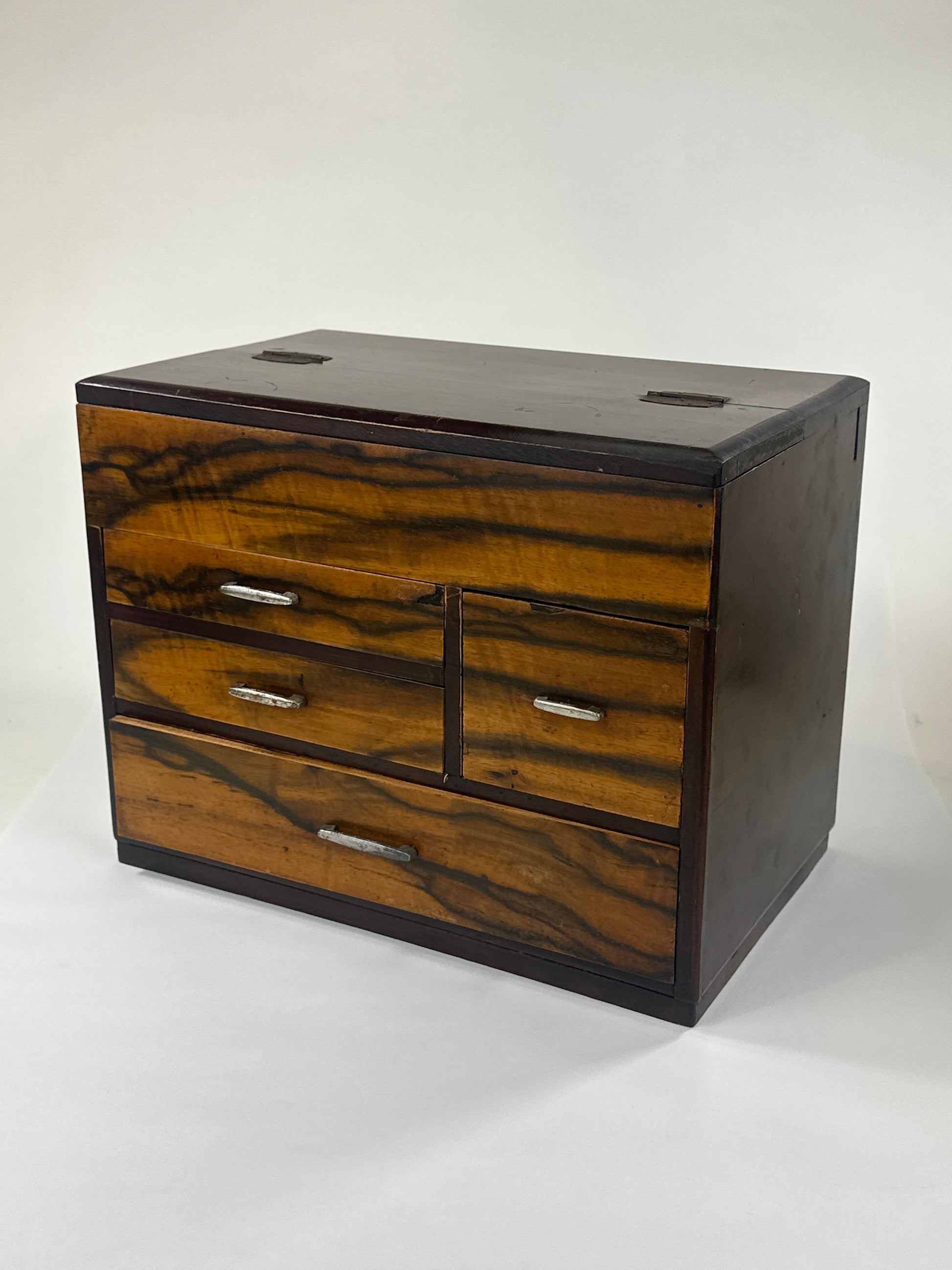 This chest has been well used yet well loved, with the exception of a few minor signs of past use, it remains in very fine condition throughout. All drawers run smoothly top lidded section swings open and closed with ease. Please enjoy viewing the enlarged photos of this chest. This chest measures 10" wide by 6" deep by 7 1/2" high (25 x 15 x 19 cm). Very solidly built, a great piece of Japanese history and makes a great jewelry box or a classic desk top organizer today.