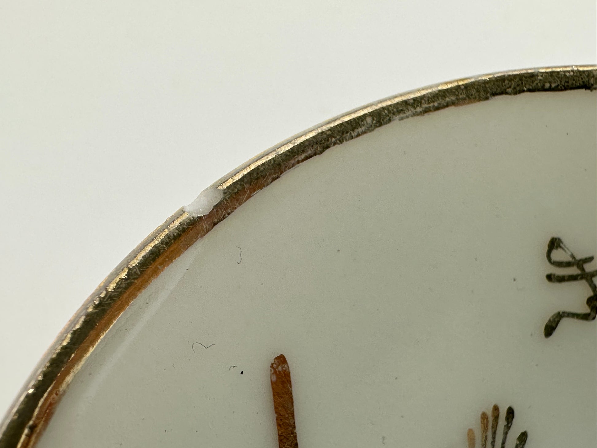 Good antique condition. Age-appropriate wear throughout, including light surface scratches, kiln grit to the foot, minor firing imperfections, and rubbing to gilt details. No major chips or cracks observed unless otherwise noted.