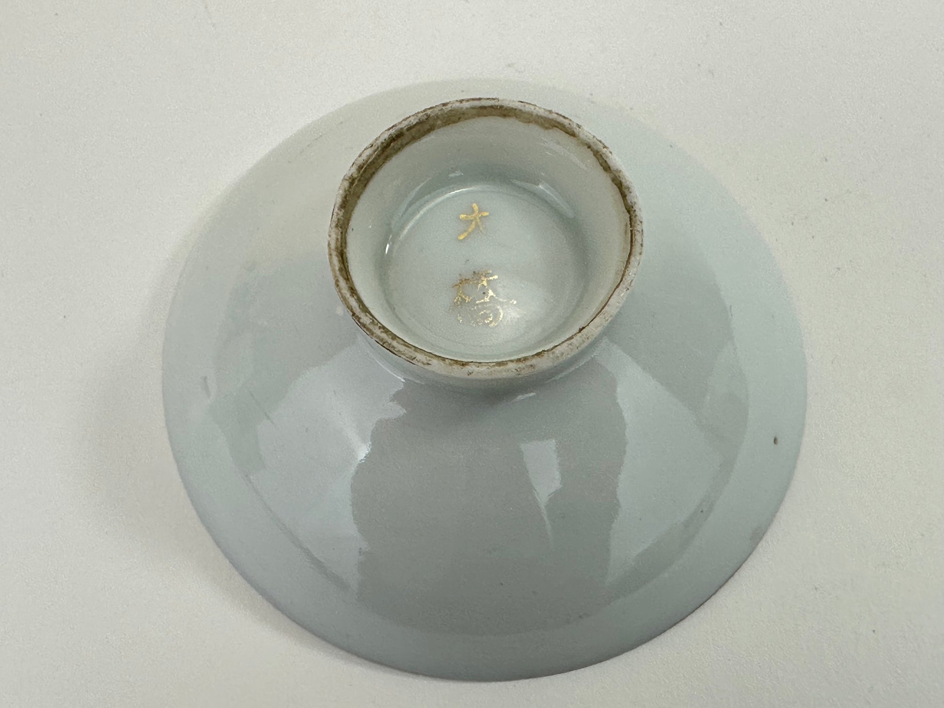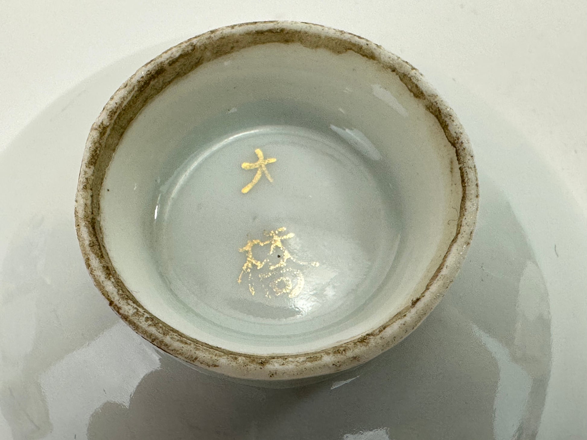 The exterior is minimally decorated, allowing the focus to remain on the interior image when the cup is in use. The foot shows expected kiln grit, firing marks, and wear consistent with age and use. Form, glaze tone, and decorative style align with sake cups produced for both personal and ceremonial use during the Meiji period.