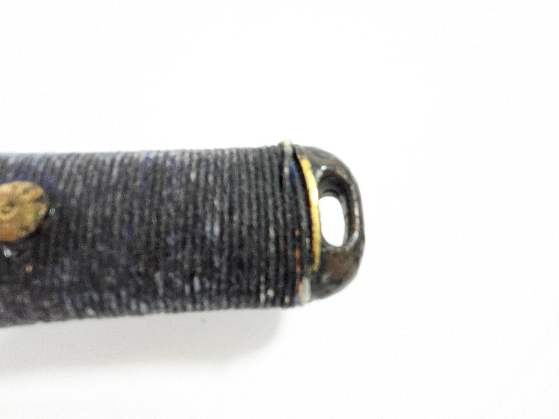 Tsuka: Indigo-dyed cord wrap, samegawa base, gilt chrysanthemum menuki
