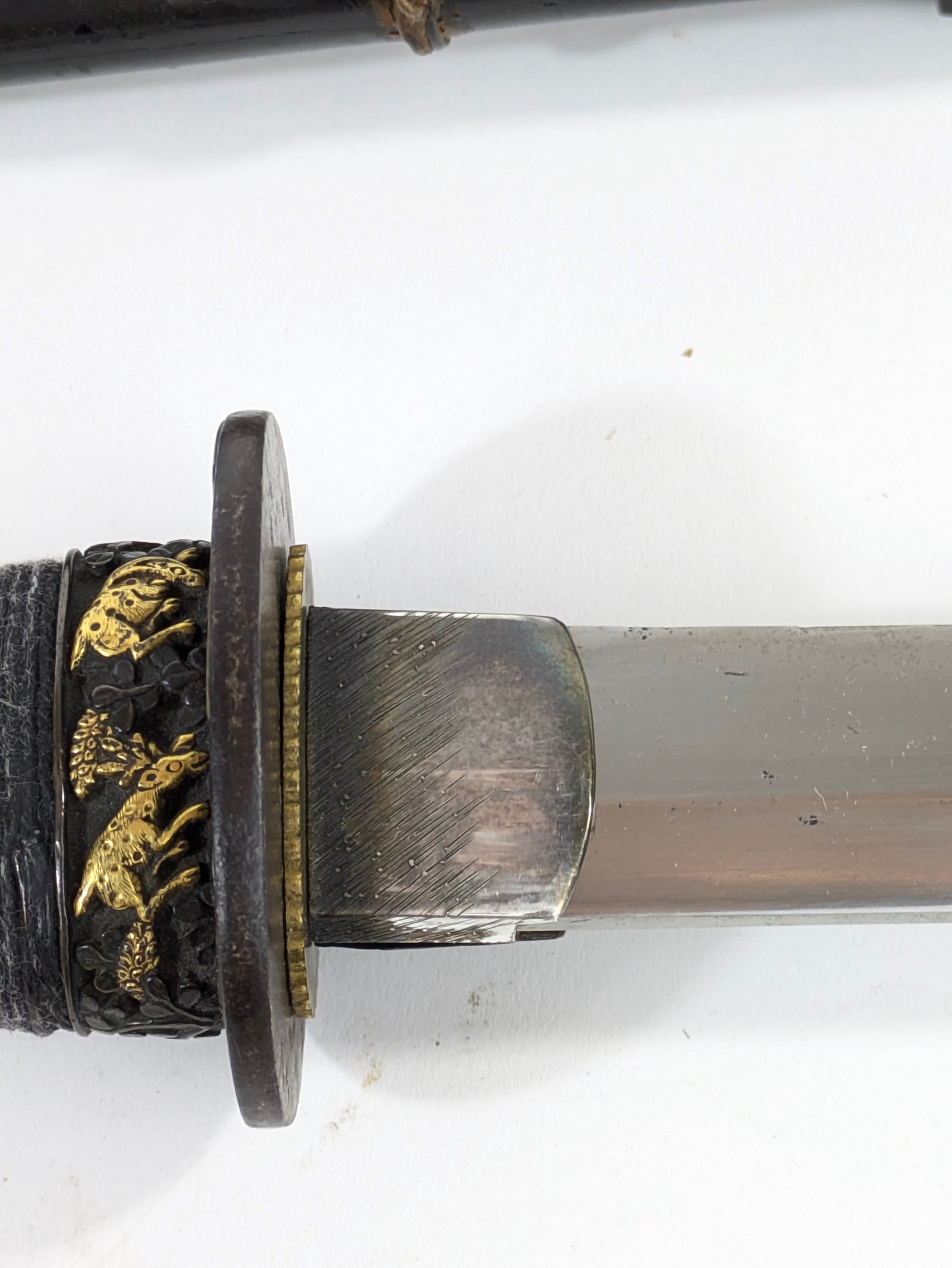 The fuchi-kashira (hilt fittings) depict deer among pine boughs in finely carved gilt metal — an auspicious motif celebrating the harmony of nature and long life. The tsuka (handle) is bound in indigo-dyed cord over ray skin (samegawa) and fitted with a gilt chrysanthemum menuki, emblem of renewal and Imperial lineage. The iron tsuba is mokko-gata in form and bears an engraved arrowhead (yanone), representing vigilance and martial virtue.