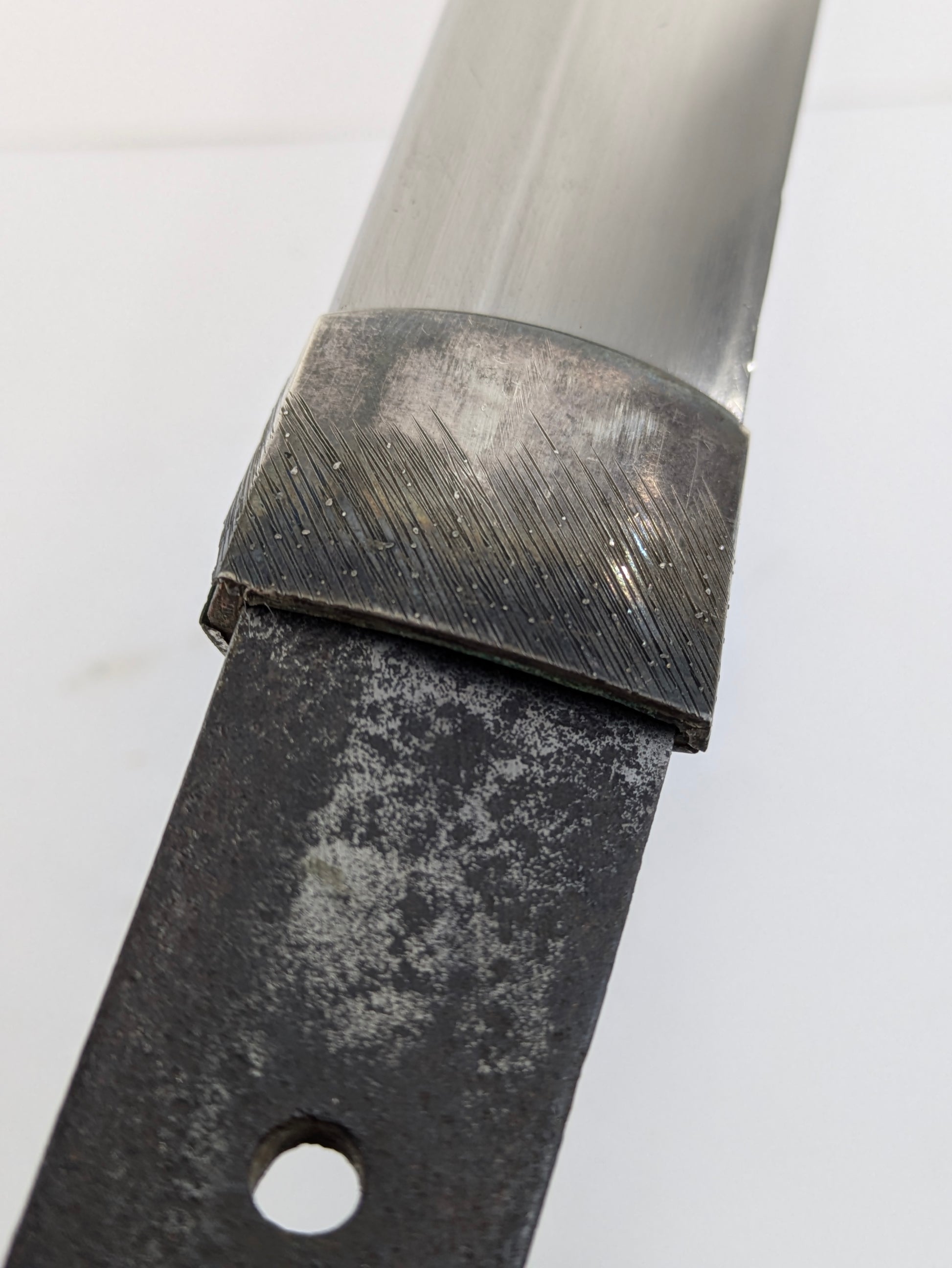 The blade is hand-forged in the hira-zukuri form with a straight suguha hamon and visible hada grain. The nakago is unsigned (mumei) and shows two mekugi-ana, suggesting remounting across generations. Its silvered copper habaki bears precise cross-hatched yasurime file marks, a detail reserved for finer work.