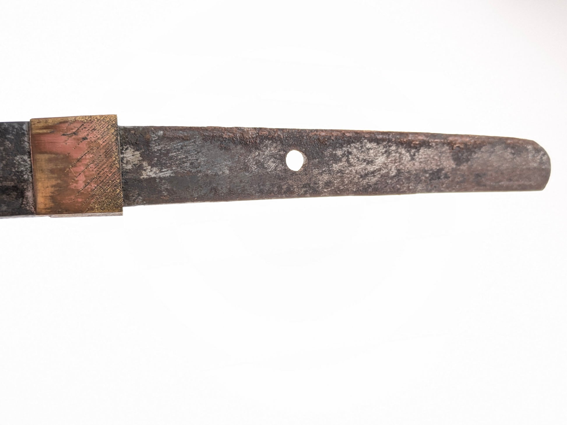 • Hilt: brass guard/knuckle-bow with sword-knot slot; dark-dyed ray-skin grip bound with twisted wire (all present); warm, untouched patina to the fittings.