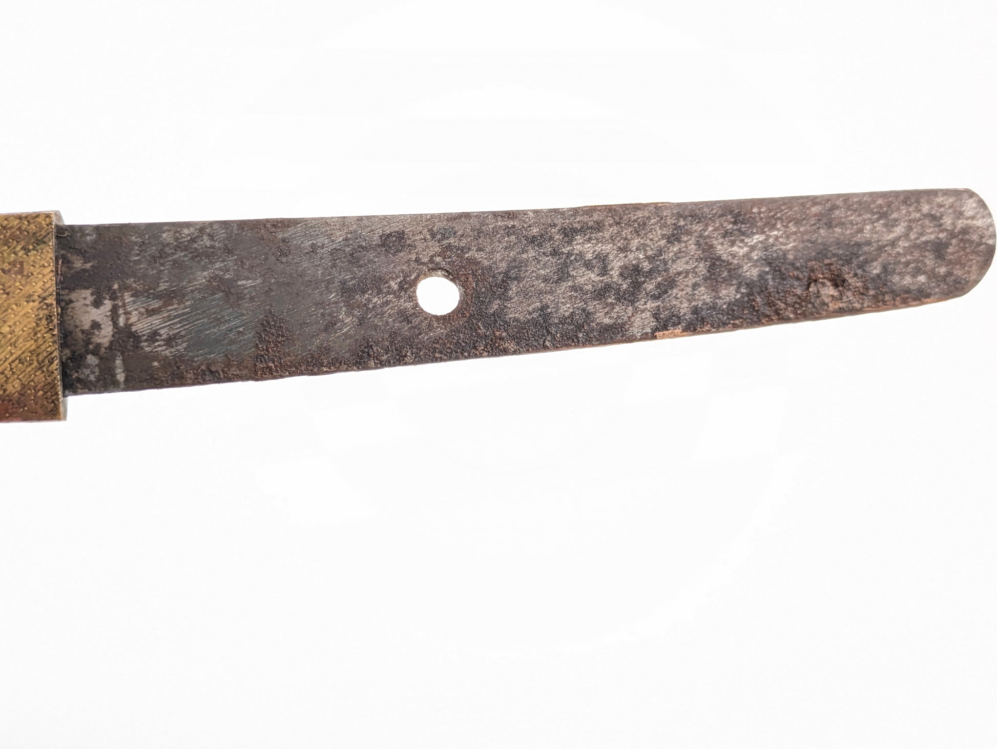 Condition: honest service wear. Blade shows uniform peppering/gray patina with a small edge nick near the monouchi; tight hilt; wire binding intact with light gaps; brass with dark, unpolished patina. Scabbard retains its original finish with heavy freckling and scattered losses but remains solid and correctly fitted.