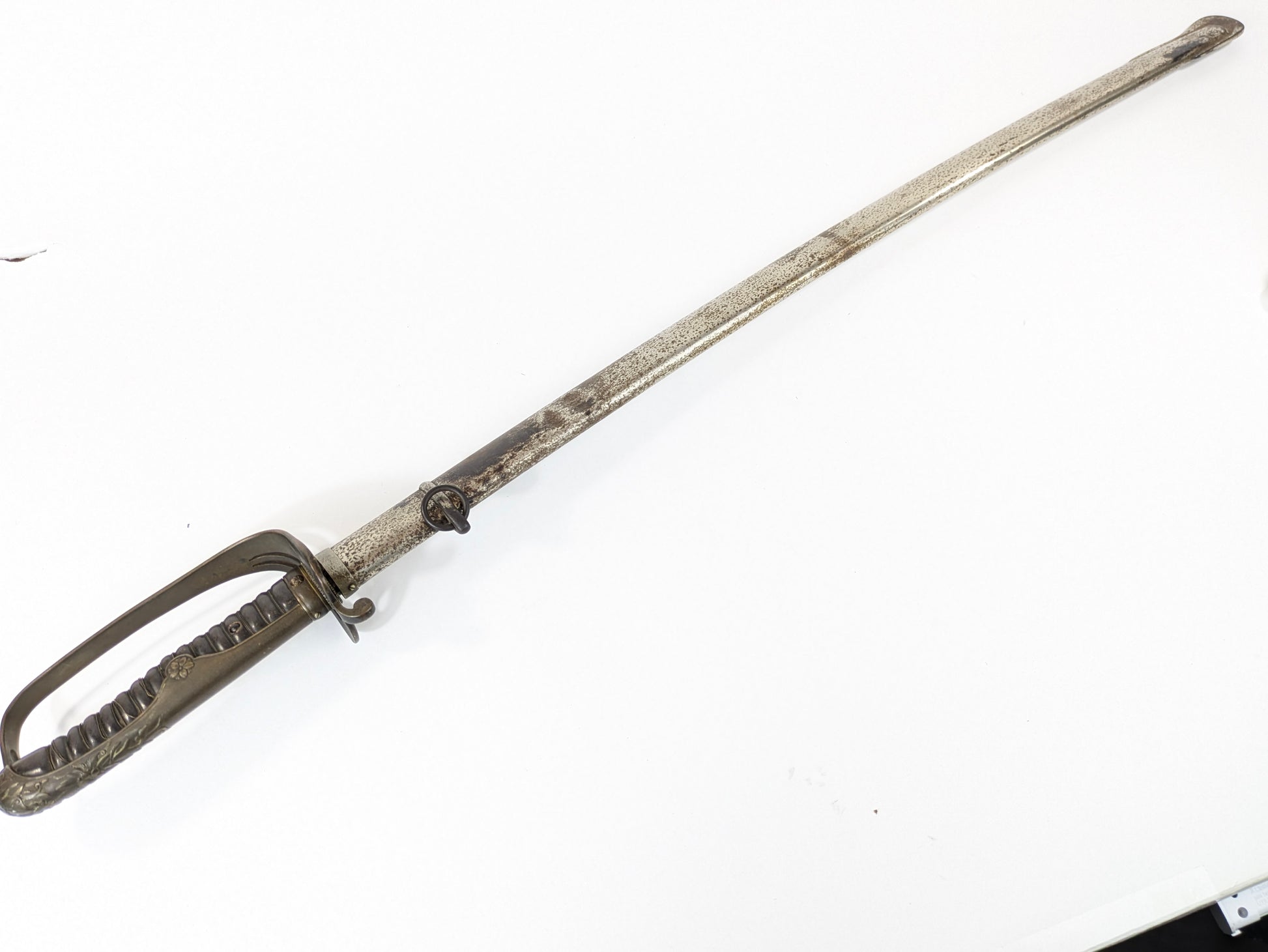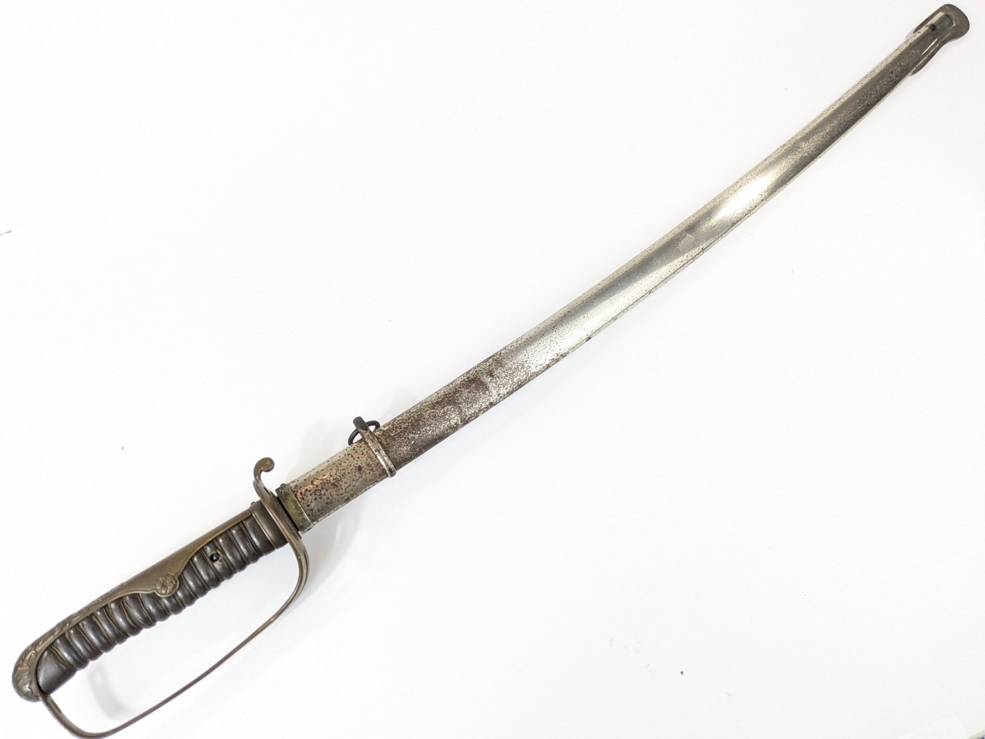 • Scabbard: steel, single suspension ring at the throat; finish worn from service with uniform peppering—structurally sound and a good fit to the sword.