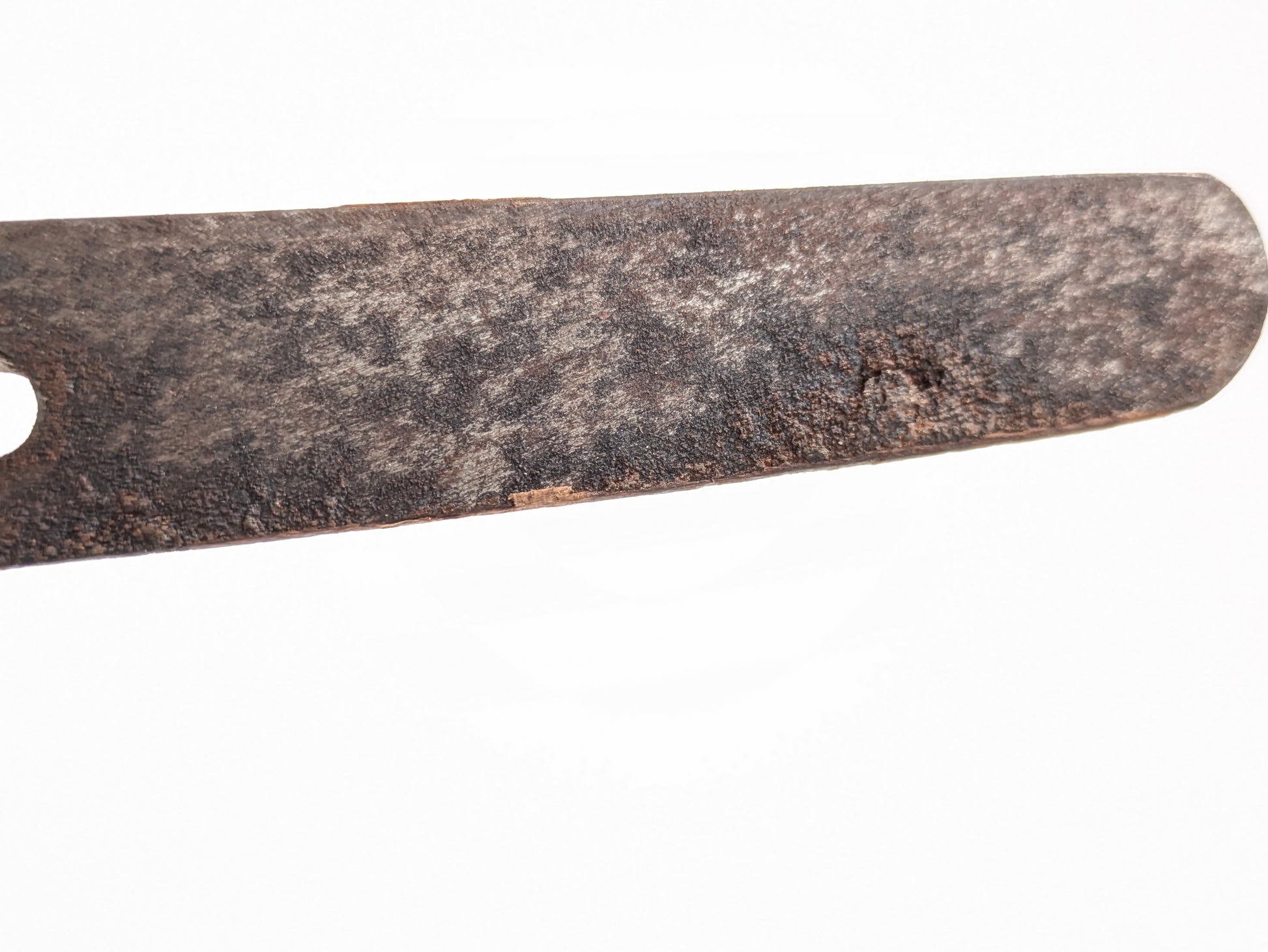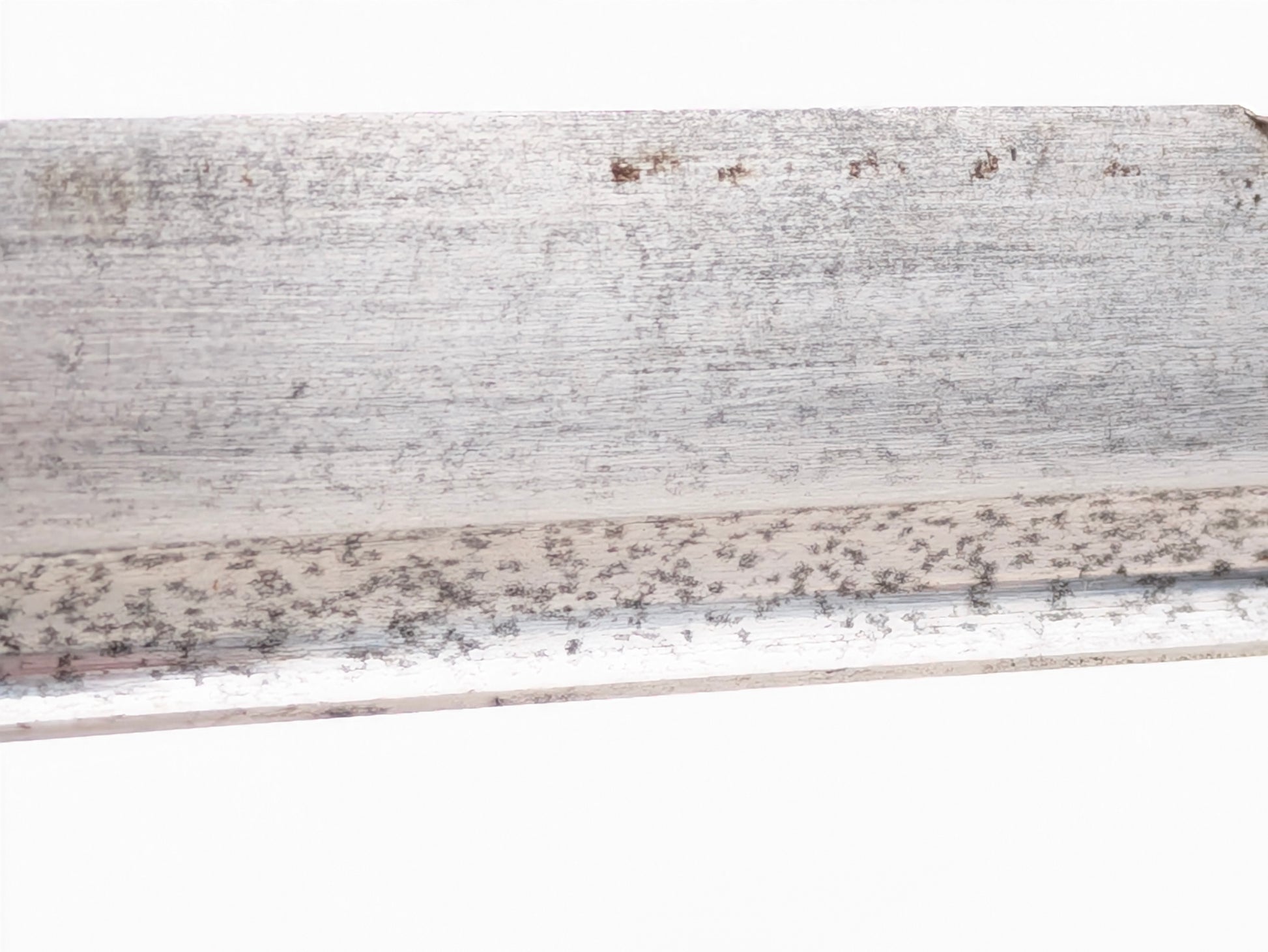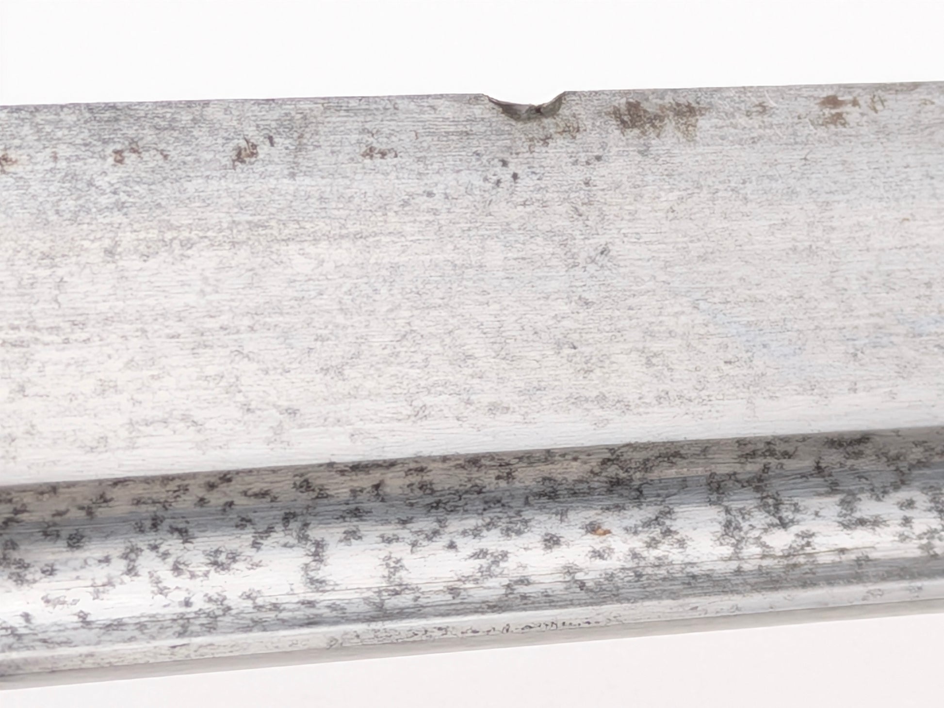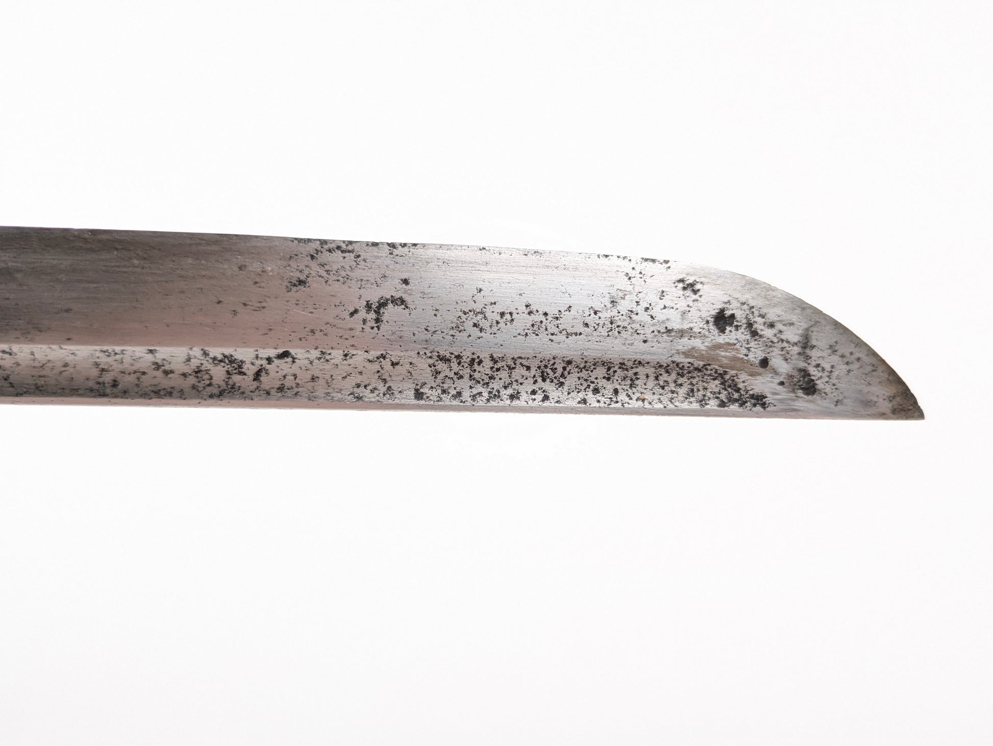 Field-used but complete. The blade shows even gray patina/peppering and a small service nick toward the tip; no active corrosion. Hilt is tight; wire is intact; rayskin shows expected age toning. Scabbard retains its ring and drag with heavy freckling and scattered losses from carry, consistent with long service life.