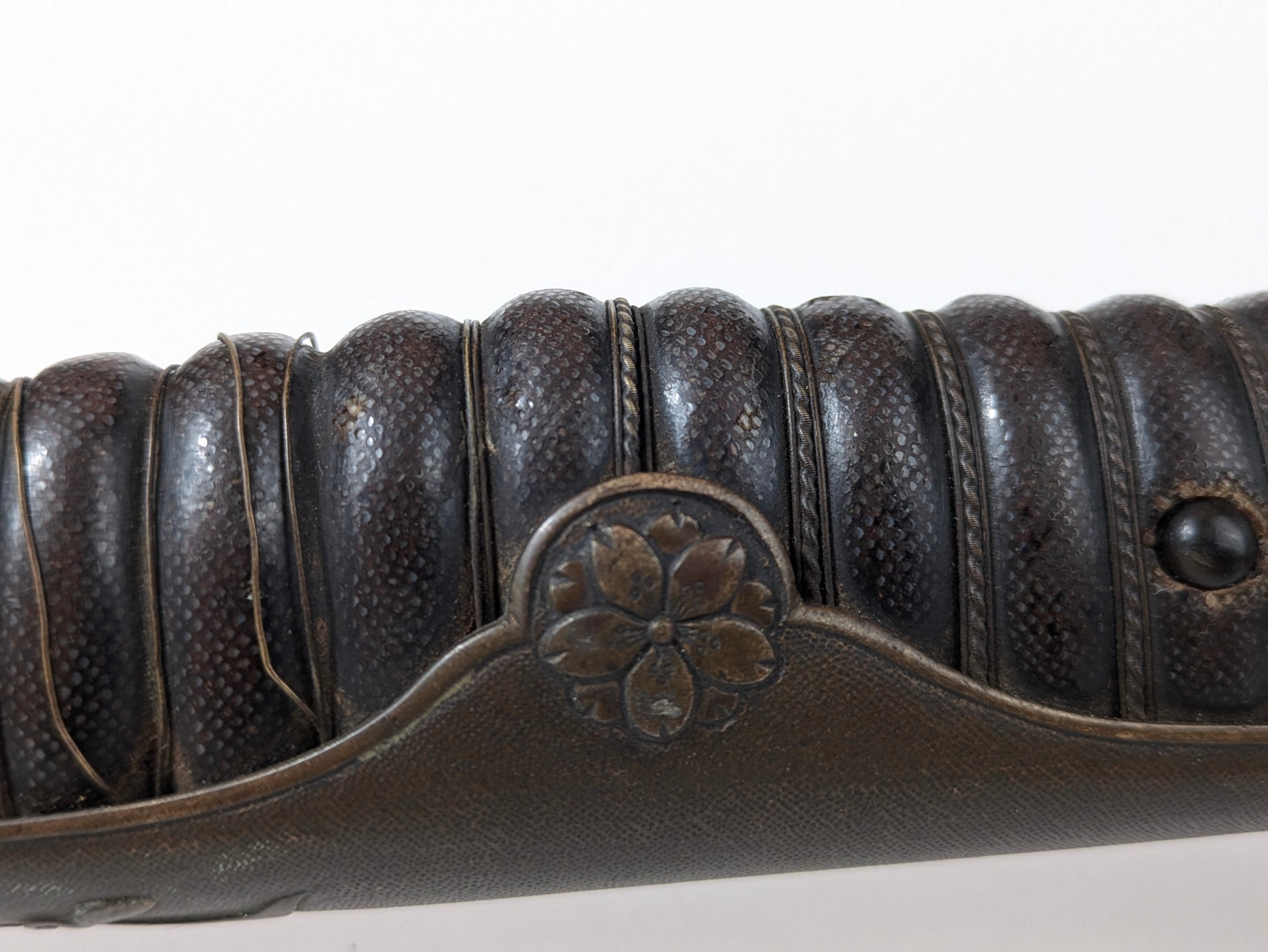 Materials: steel blade with single fuller; brass guard/knuckle-bow and backstrap with cherry-blossom ornament; ray-skin (samegawa) grip bound with twisted wire; steel scabbard with one suspension ring.