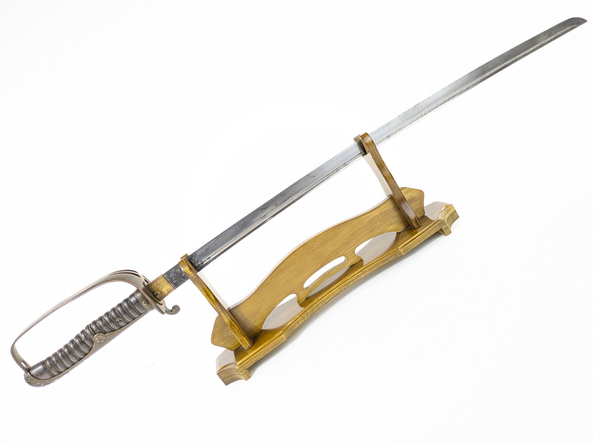 A solid, untouched example of Japan’s first purpose-built cavalry officer’s sword. Adopted on July 6, 1886, the Type 19 reworked the earlier Type 8 riding sabre into a dedicated cavalry weapon. It kept the rounded pommel and wide knuckle-bow but introduced the distinctive pierced guard and floral ornament that became the service image of mounted officers through the early 20th century, until replacement by the shin-guntō in 1934.