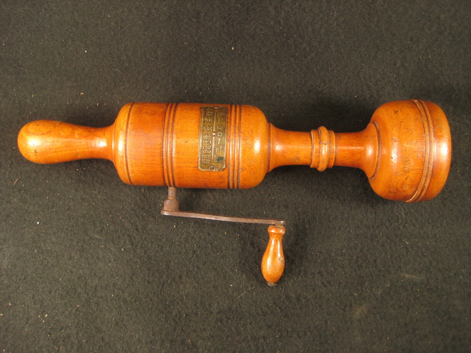 This is an antique hand crank vibrating massager made by (translation upcoming) in the early 1900's.  It is made of a durable and beautiful keyaki (zlekova) wood with a hand rubbed kijiro (natural lacquer) finish.  It comes apart using wooden threads (see pictures 7 -9).  It still cranks easily and the vibrating head gives a nice massage. The copper name plate is still readable with name of the company and a registered patent number 25013