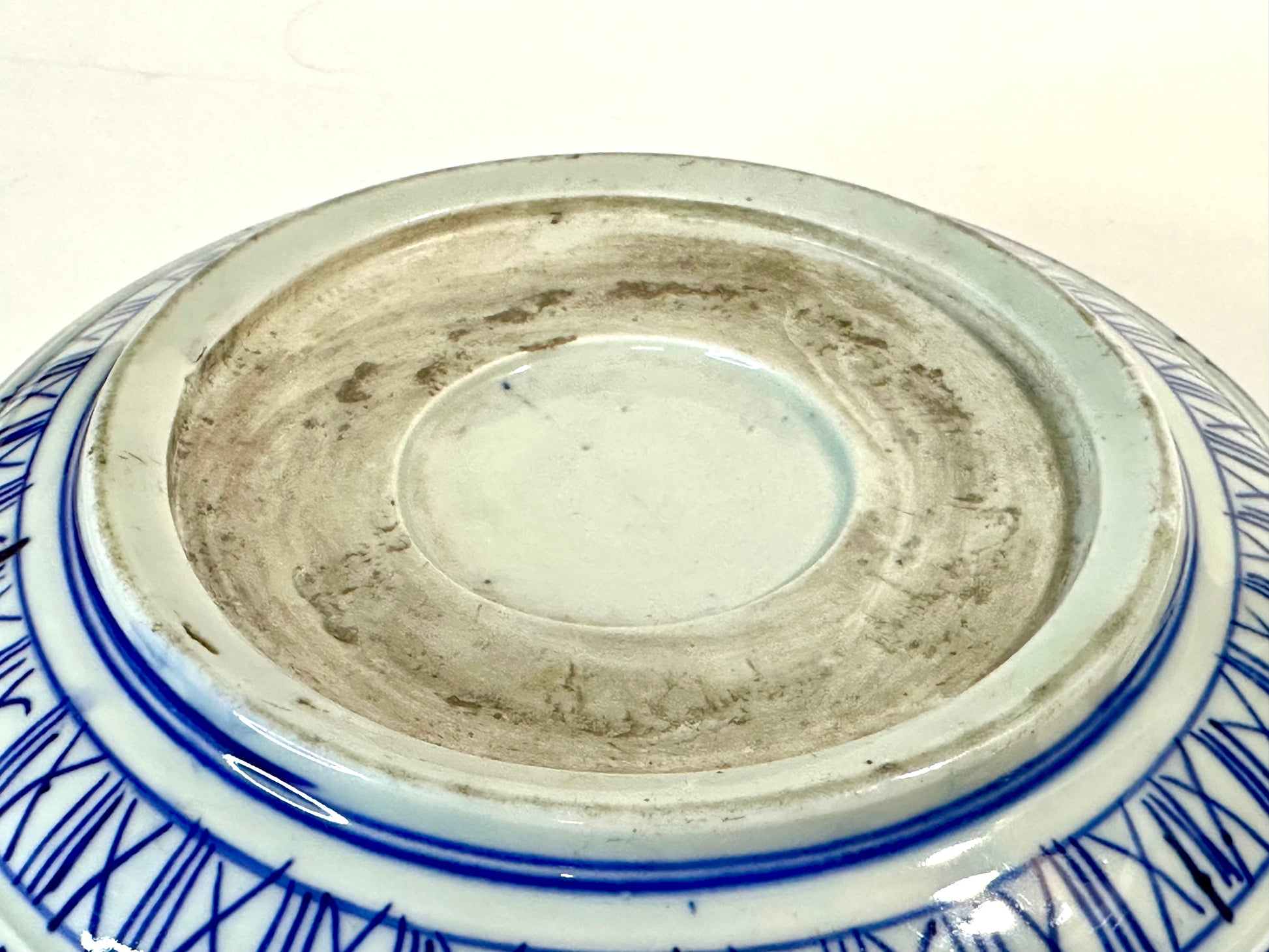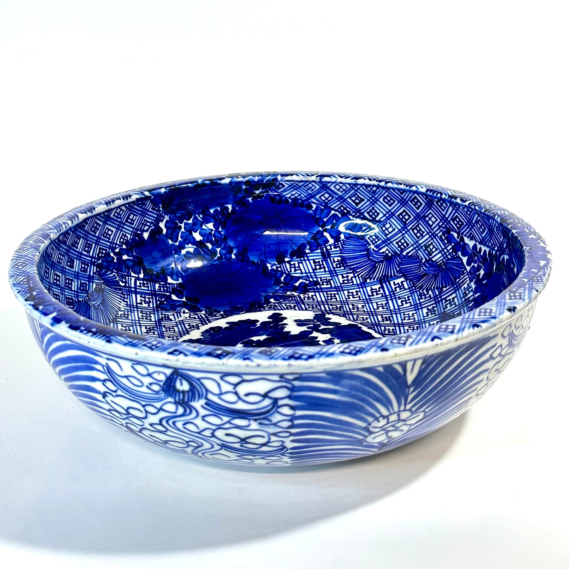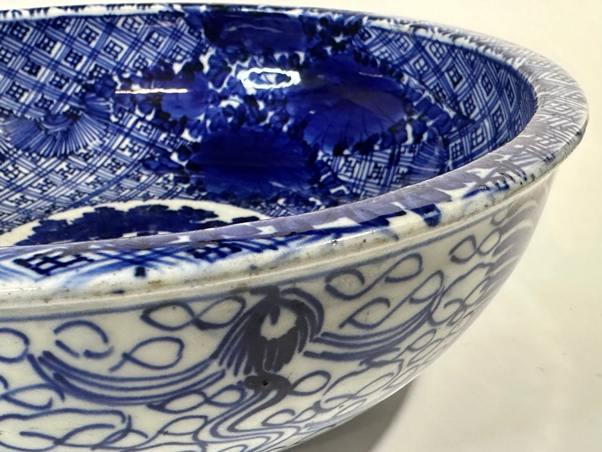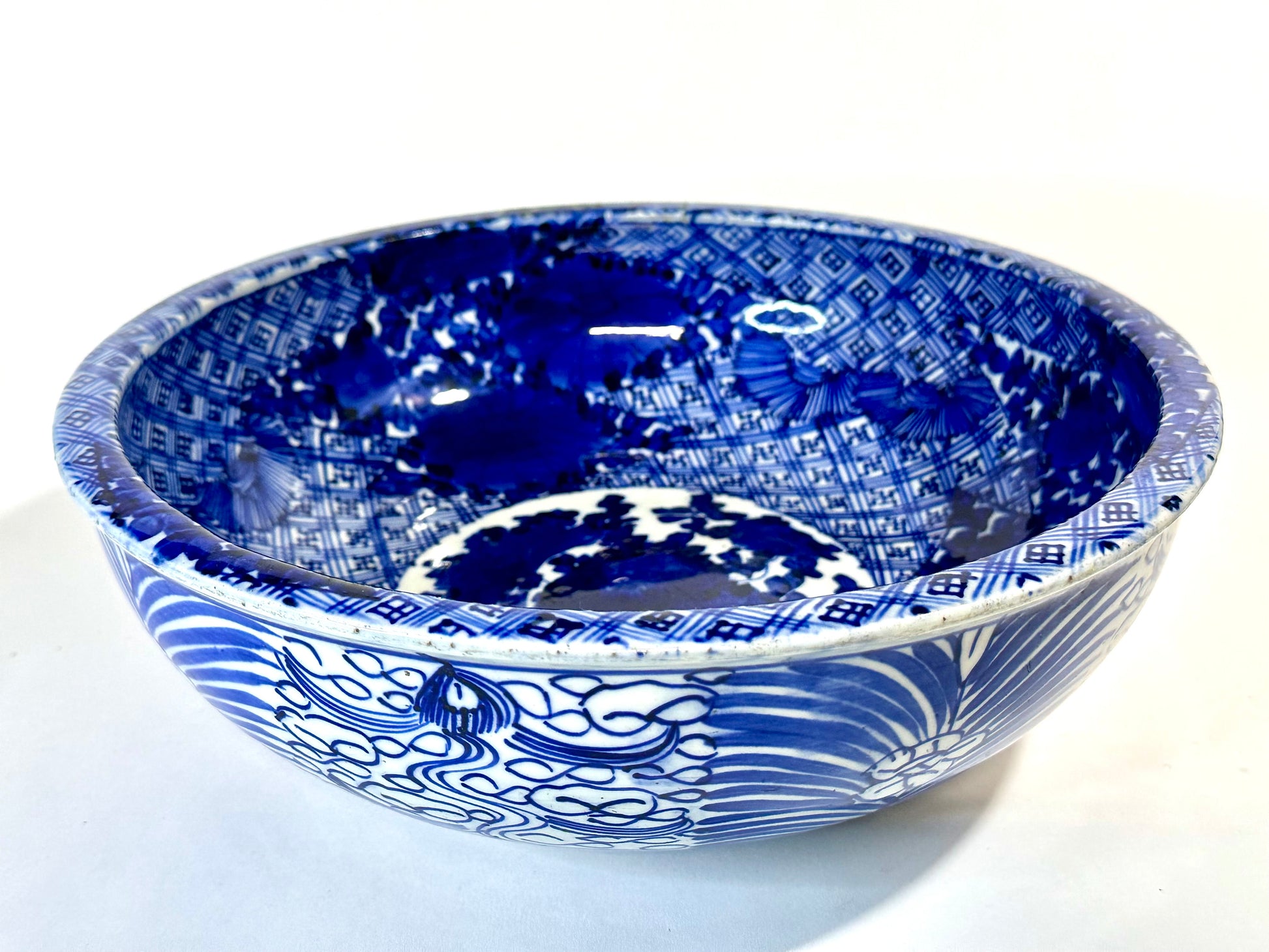 Antique Meiji Hand Painted Imari Japanese Ceramic Bowl Blue & White 11.5”
