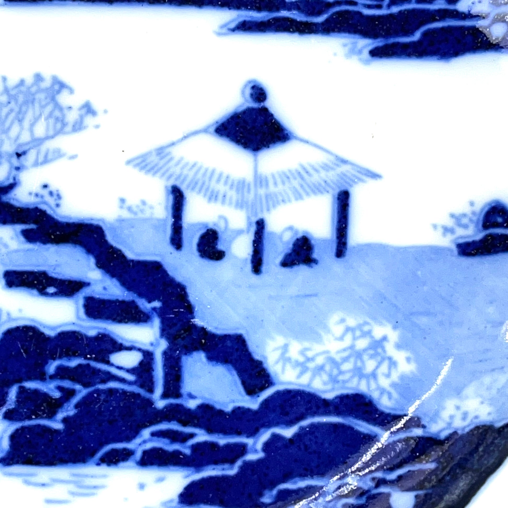 This is an antique late Meiji Era (c.1900) Japanese Imari ceramic plate with a transfer print design of a roofed structure with people sitting beneath it. A sculptured pine tree sits in the foreground as a tall mountain floats above. A popular landscape of the Meiji era.