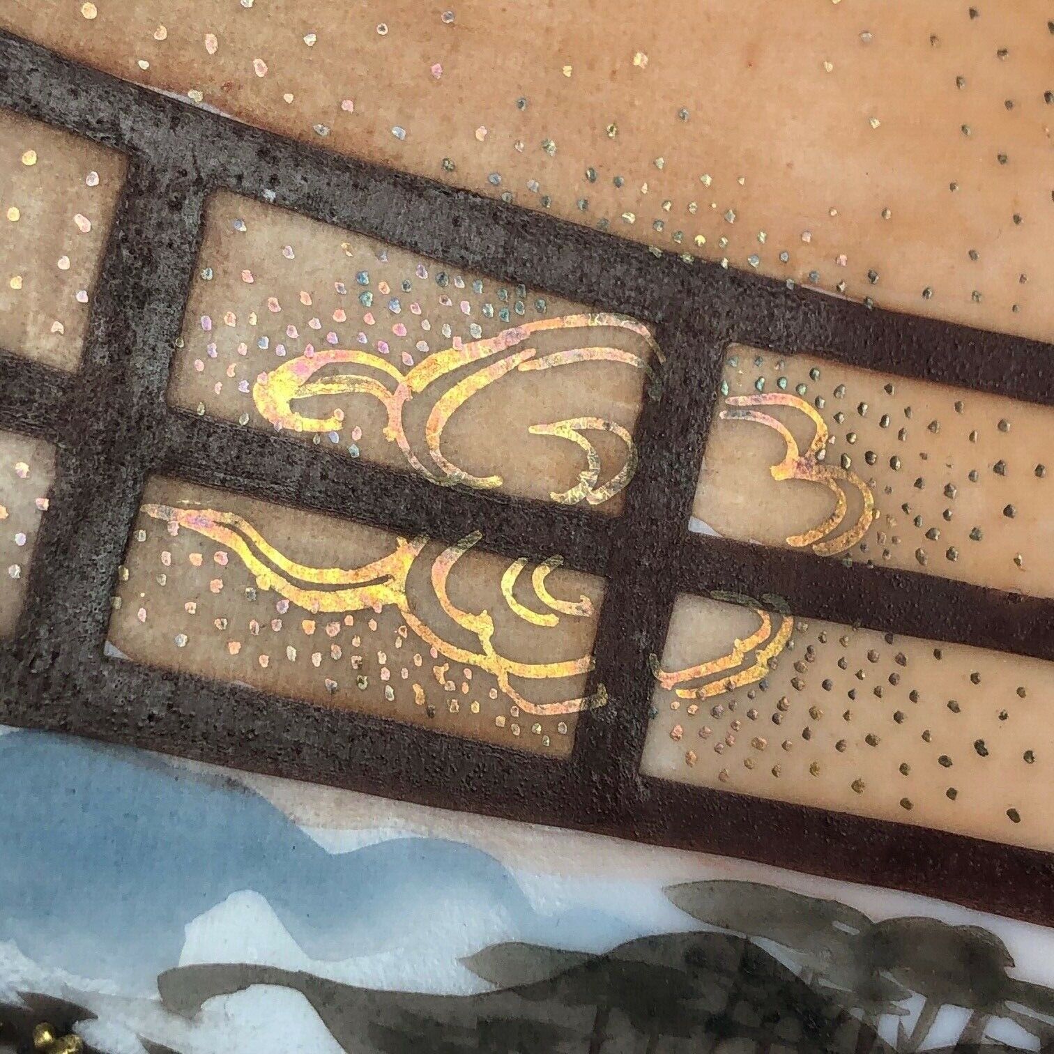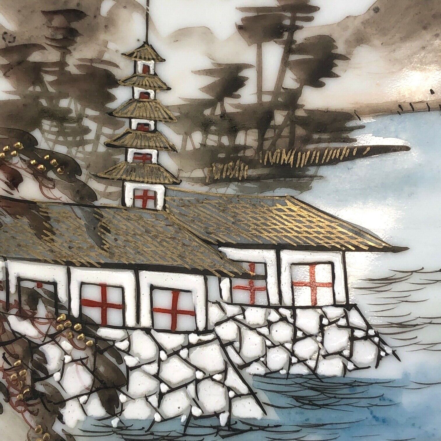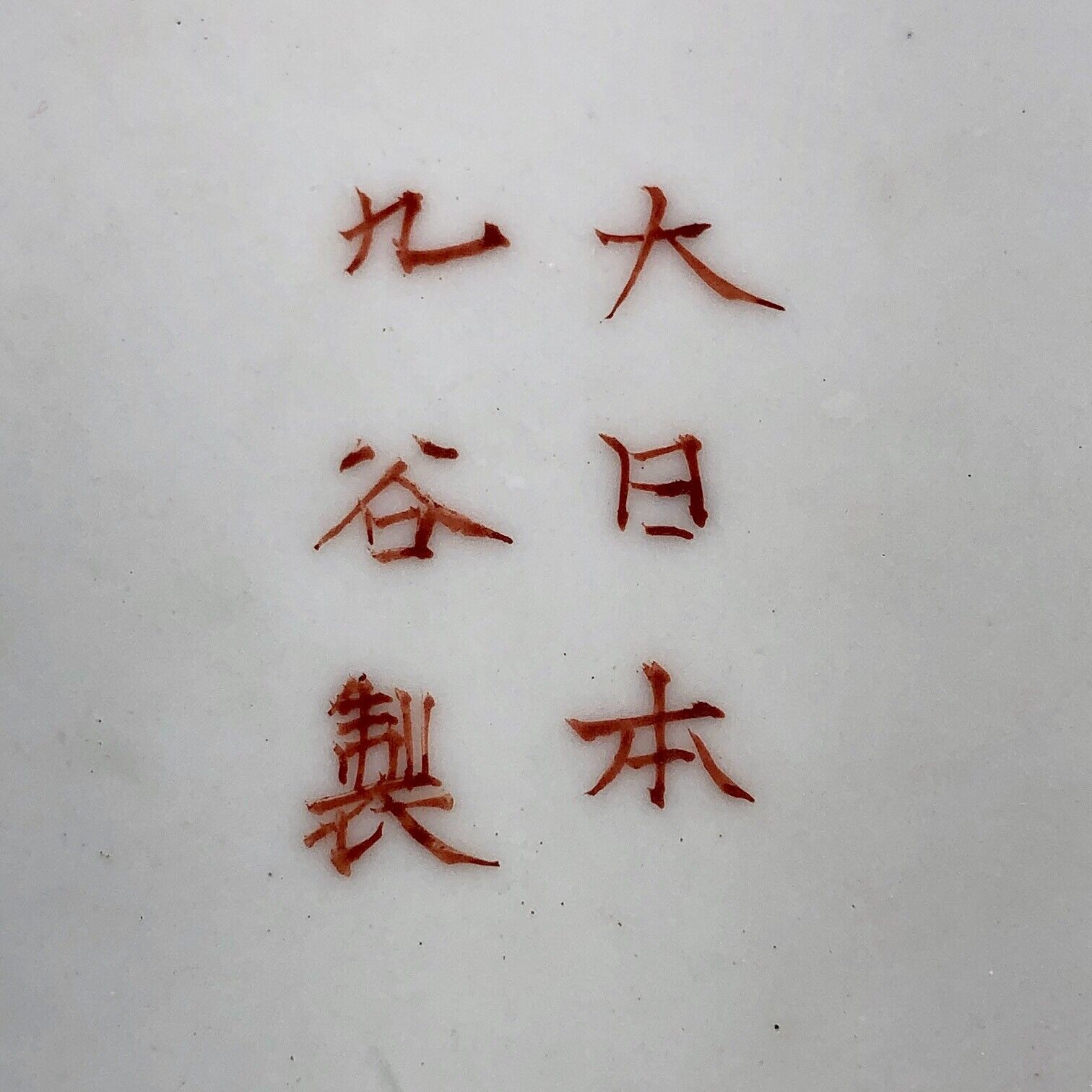 This is a huge antique Japanese Kutani ceramic charger. All hand painted with very intricate designs of various scenes from around Japan during different seasons. good look at some of the close up photos to appreciate the art work. It was high fire for lasting durability. It is marked on the bottom 九谷製 大日本 (Kutani-sei Dainippon), "Kutani Made in Great Japan."