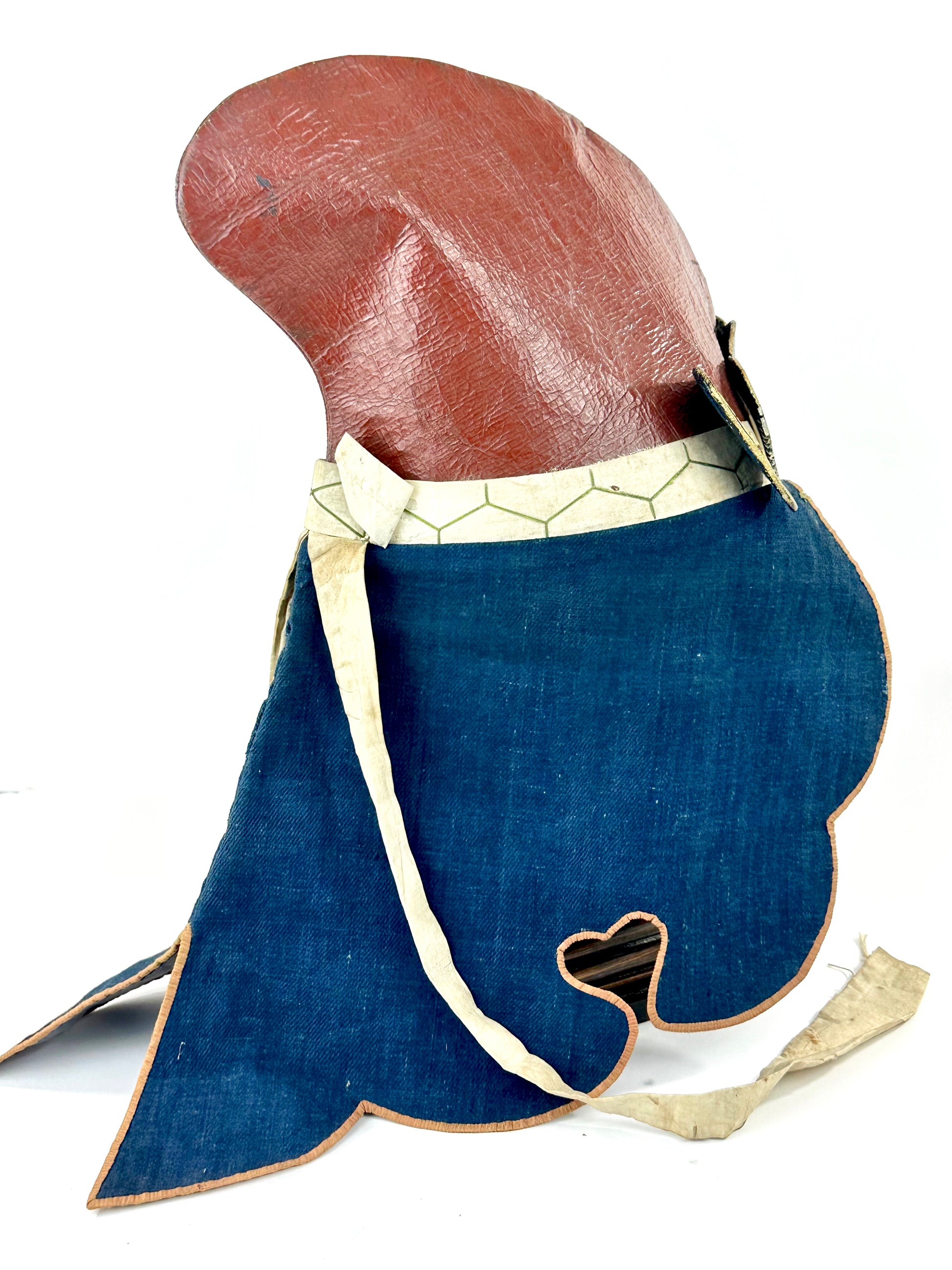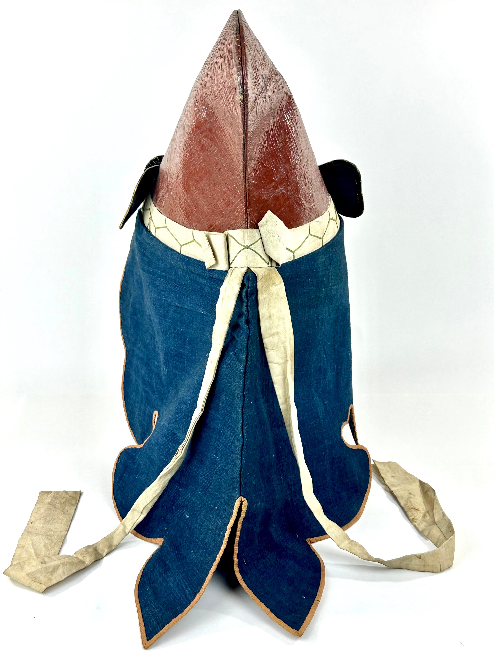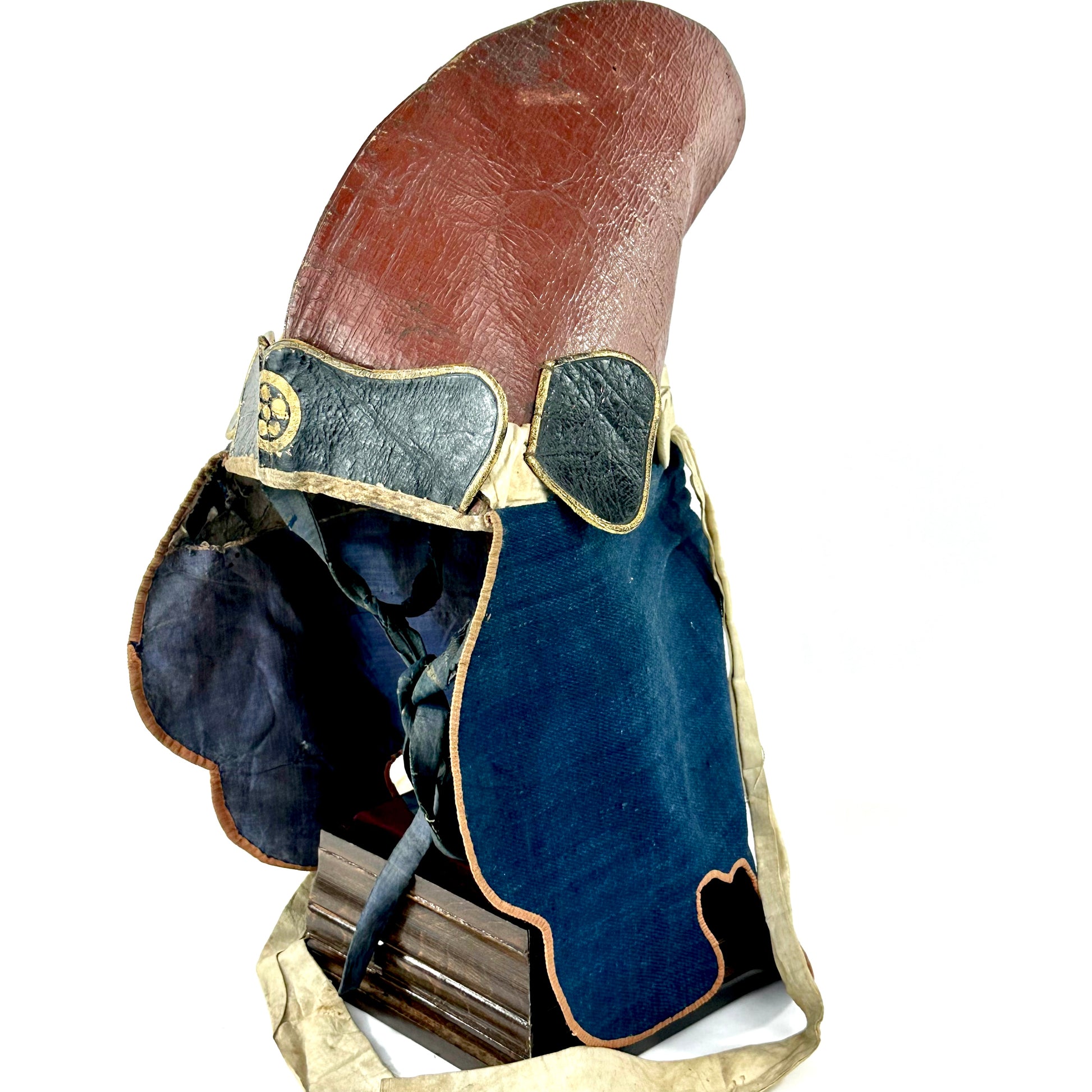 A striking and authentic antique Japanese firefighter’s helmet (火消帽子, hikeshi bōshi), dating to the late Edo or early Meiji period (mid–19th century). Constructed from hardened, lacquered leather with indigo-dyed hemp and cotton fabric flaps, this tall, conical helmet was designed to protect Edo-period firemen—known as hikeshi—from falling embers during intense urban fires.
