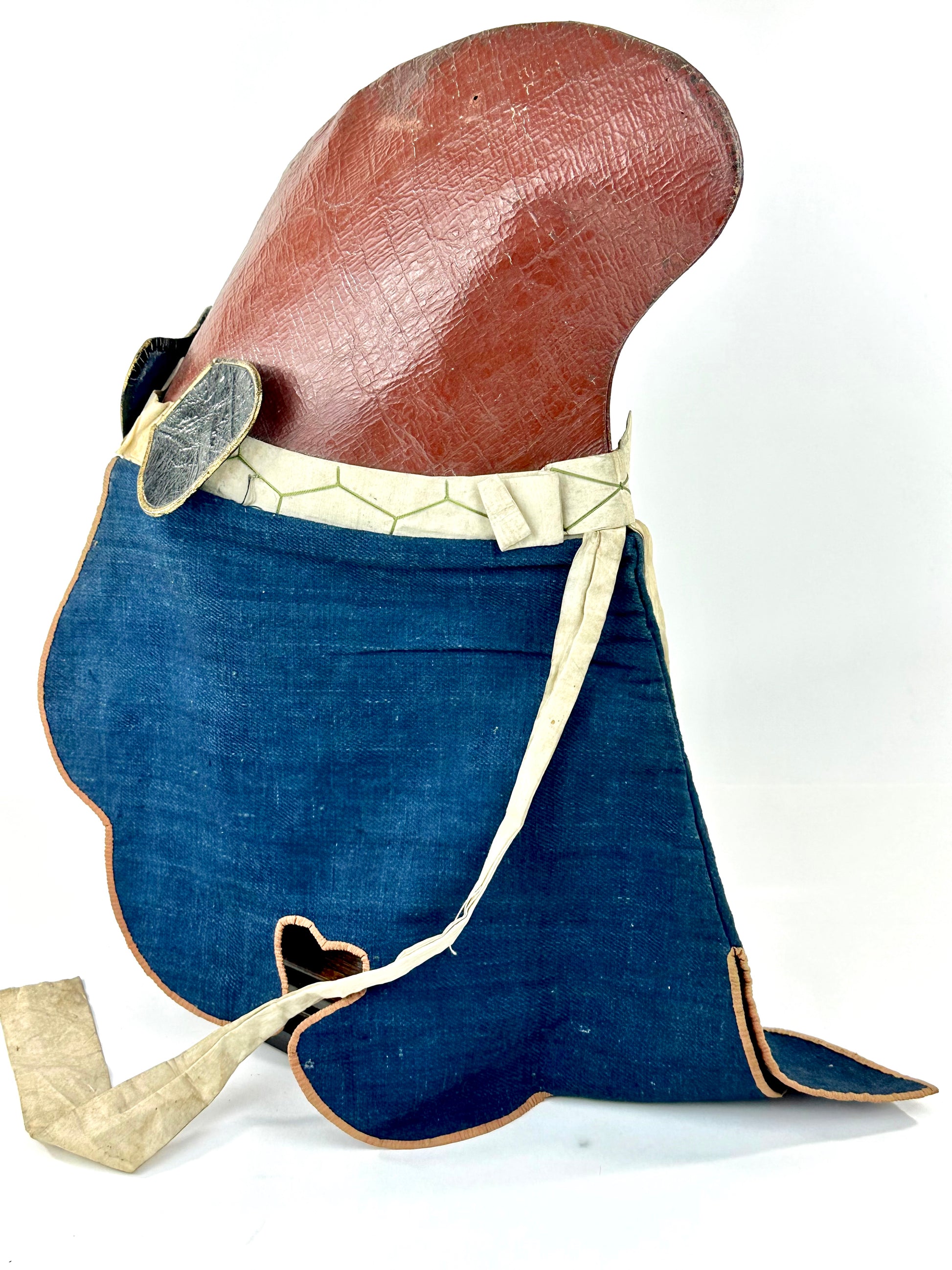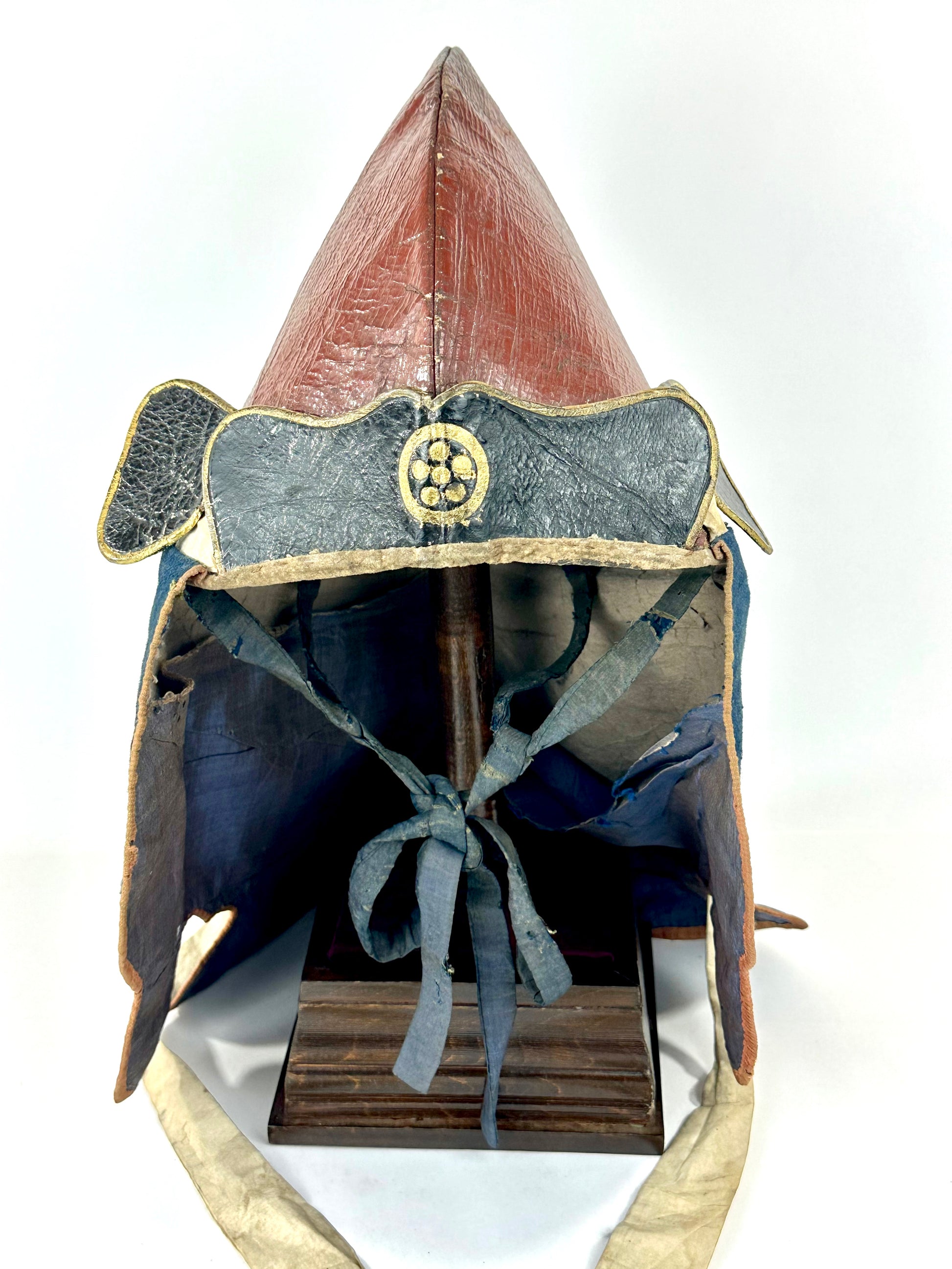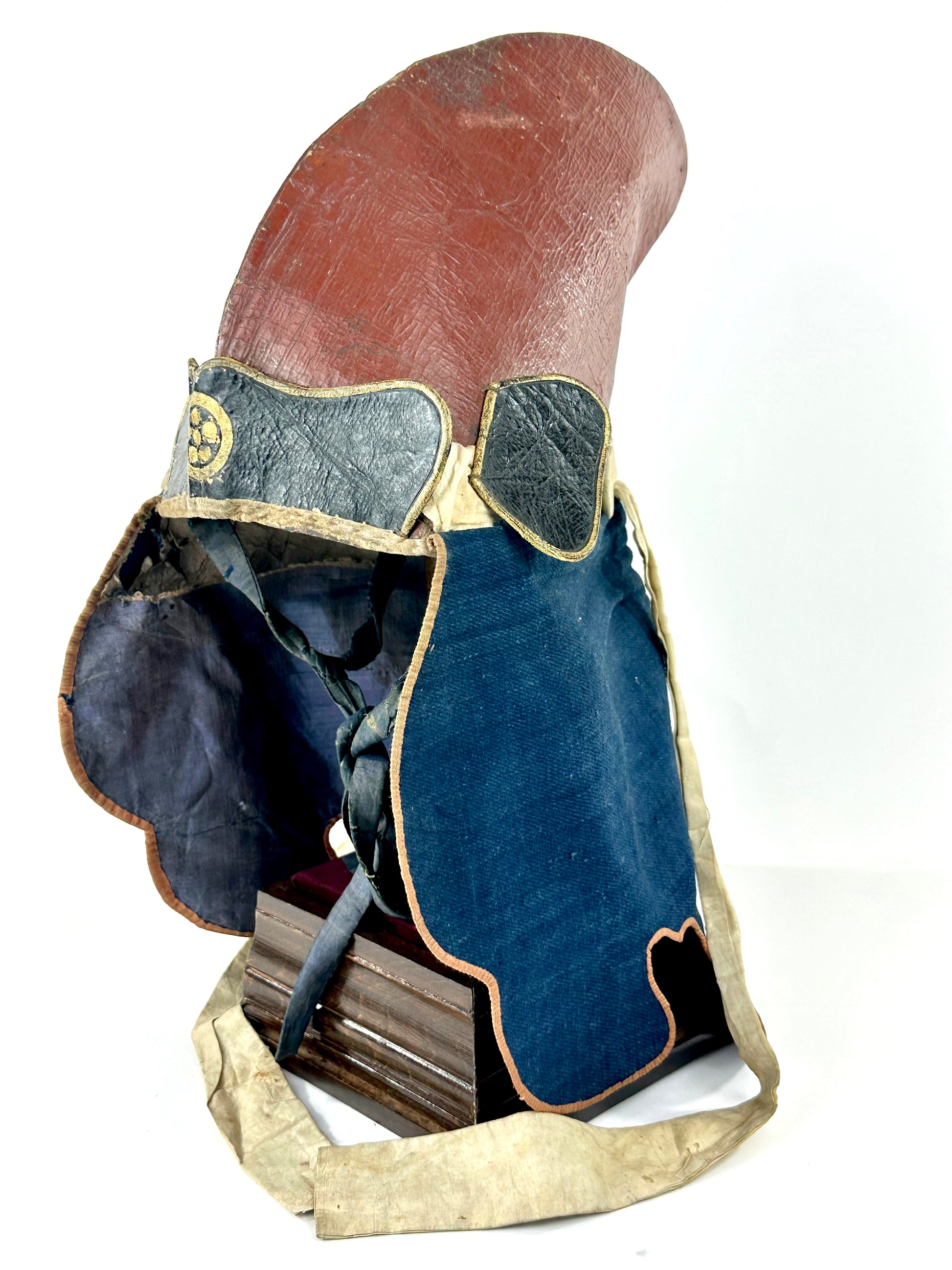 The high, curved red-lacquered crown is reinforced with stitched seams and trimmed in black leather panels edged in gilt, featuring a gold-painted mon (family crest) at the front. A blue hemp neck guard extends around the back and sides, bordered in brown silk and lined with indigo-dyed fabric. Original linen ties remain attached inside the helmet, used to secure it beneath the chin.