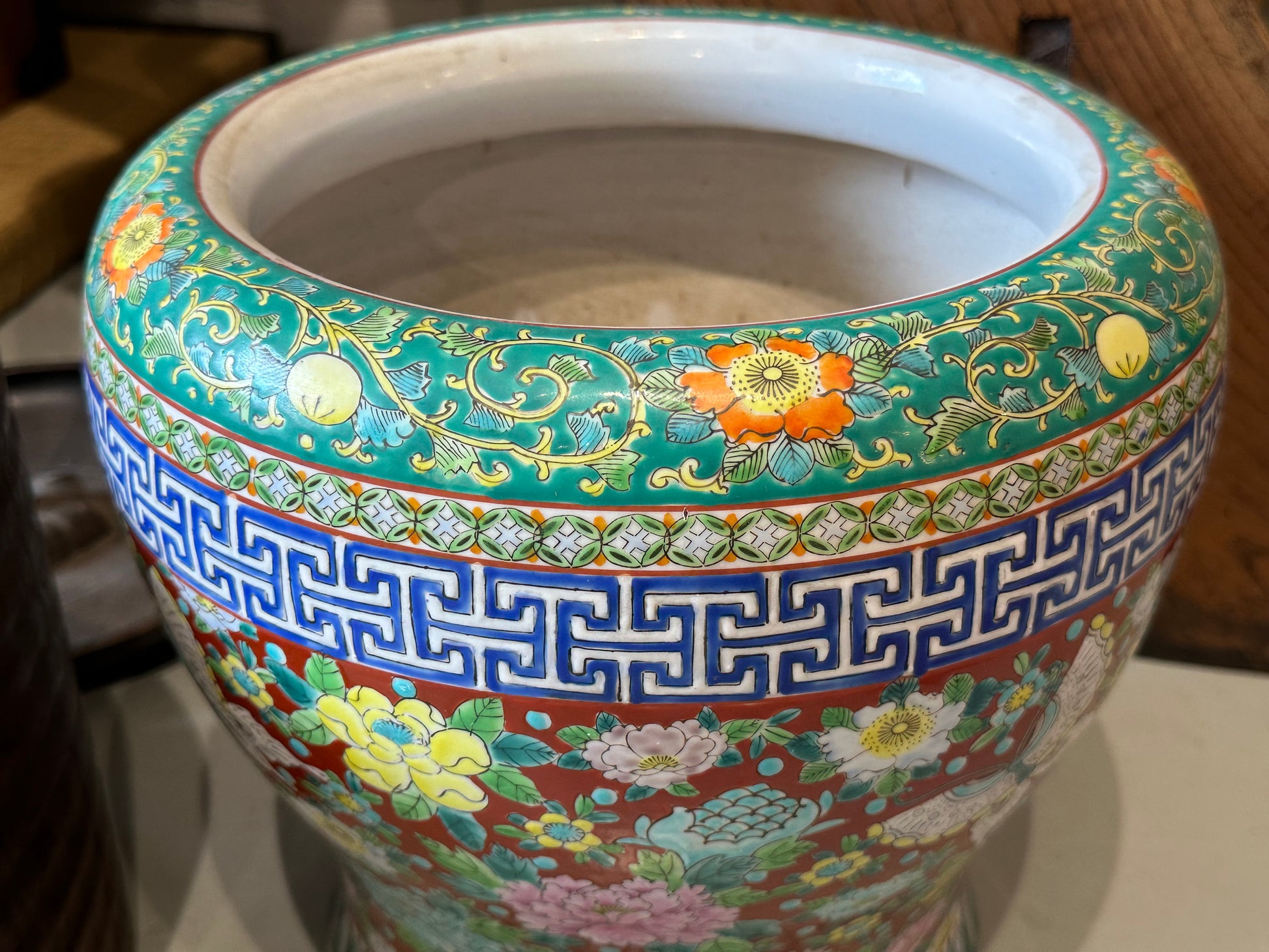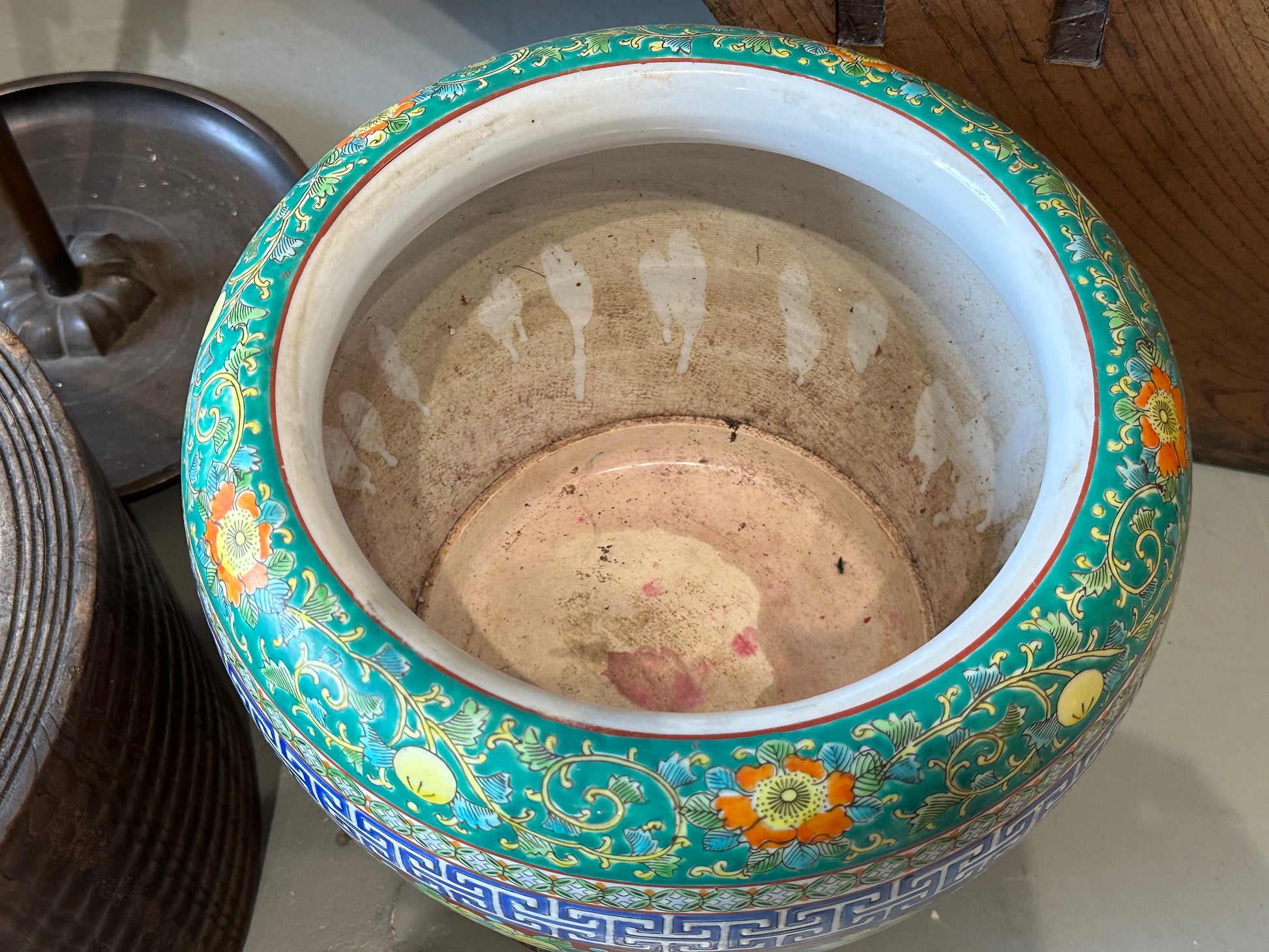 This is a Japanese ceramic hibachi decorated all over in colorful enamel with floral & butterfly motif. Traditionally in Japan a hibachi is considered an enclosure for fire, usually hot coals sitting on a bed of ash used to help heat small spaces, lite a pipe or warm water for tea.