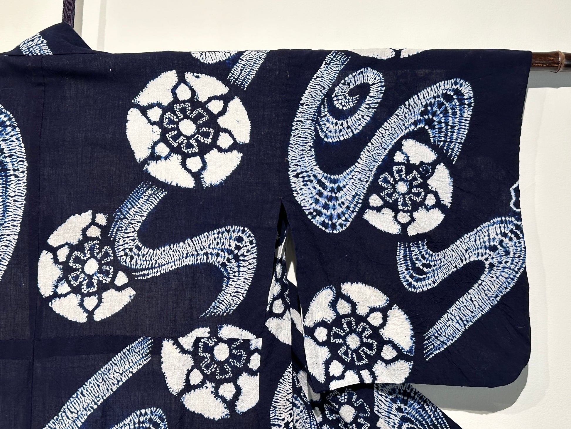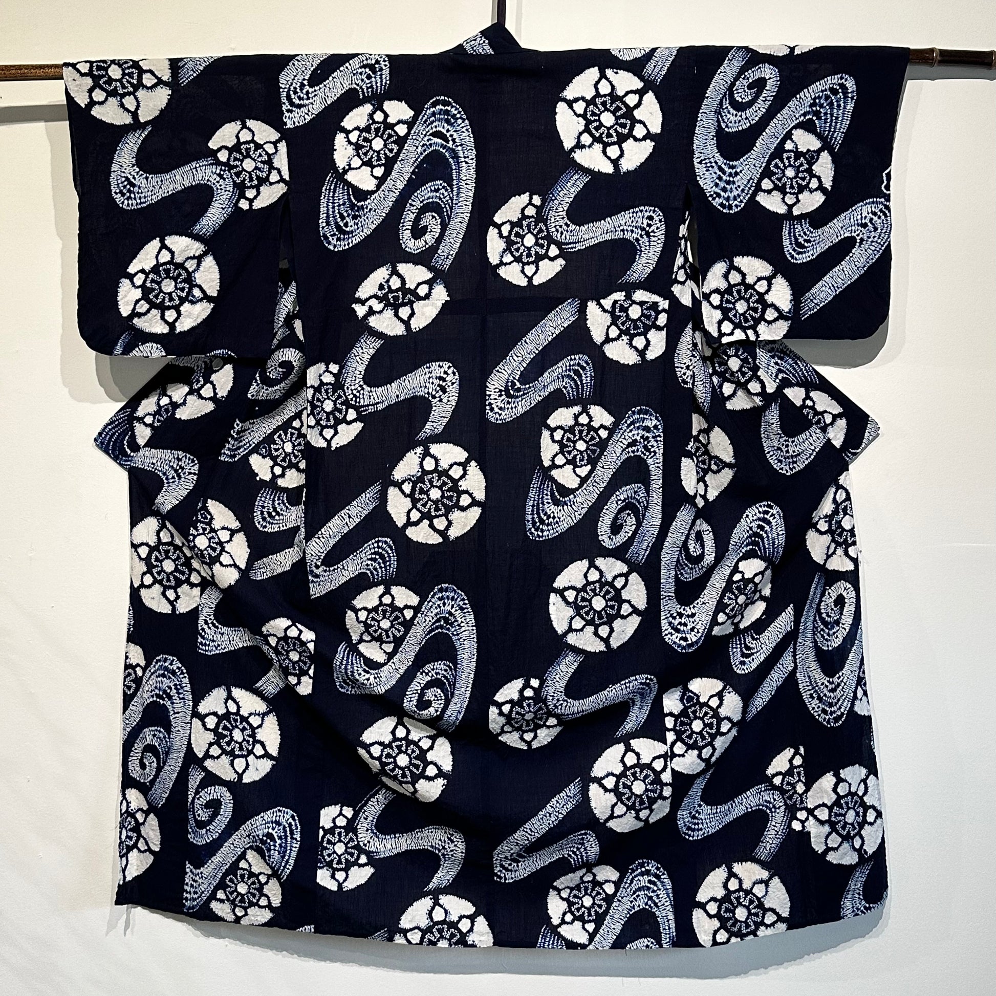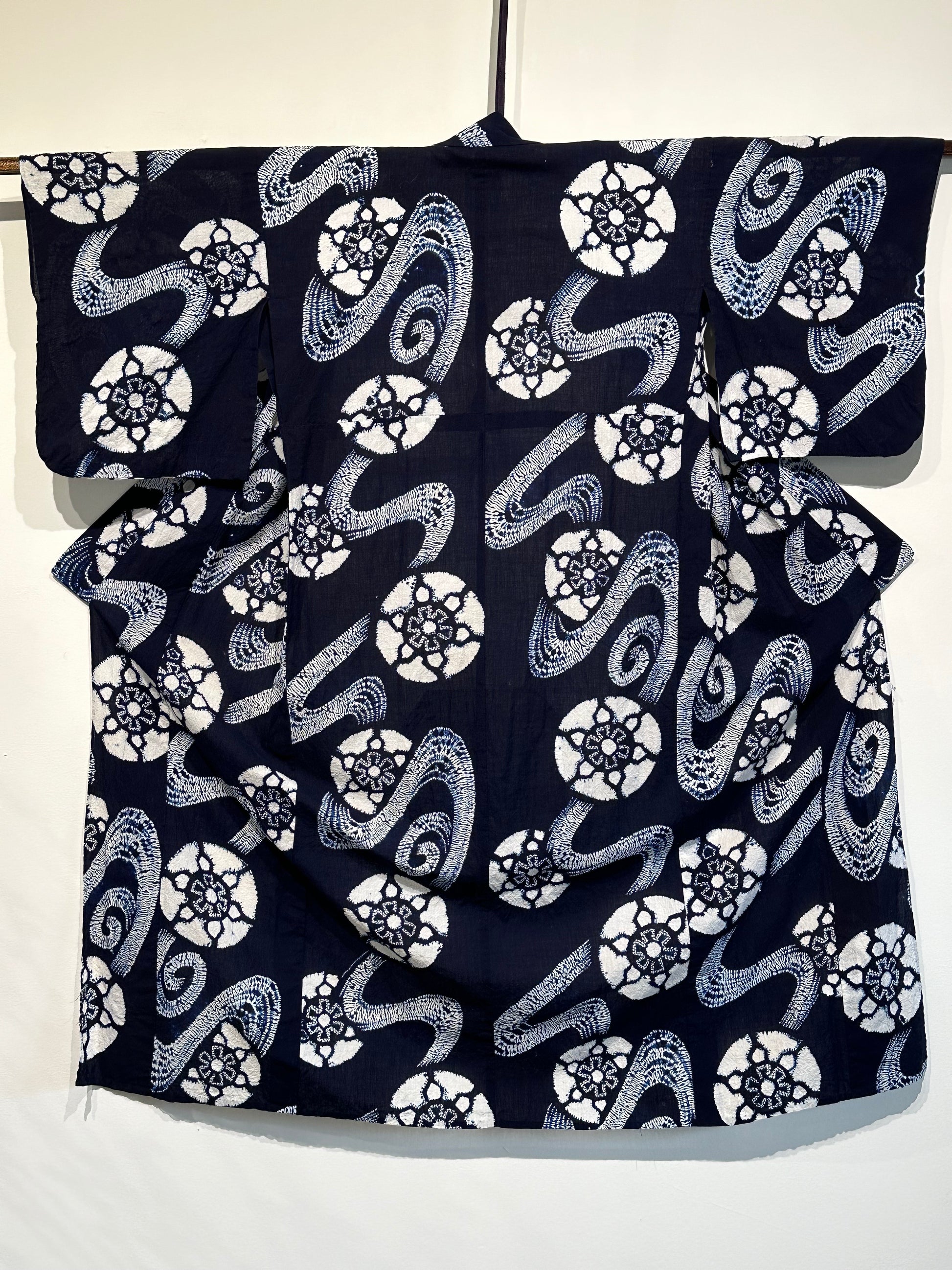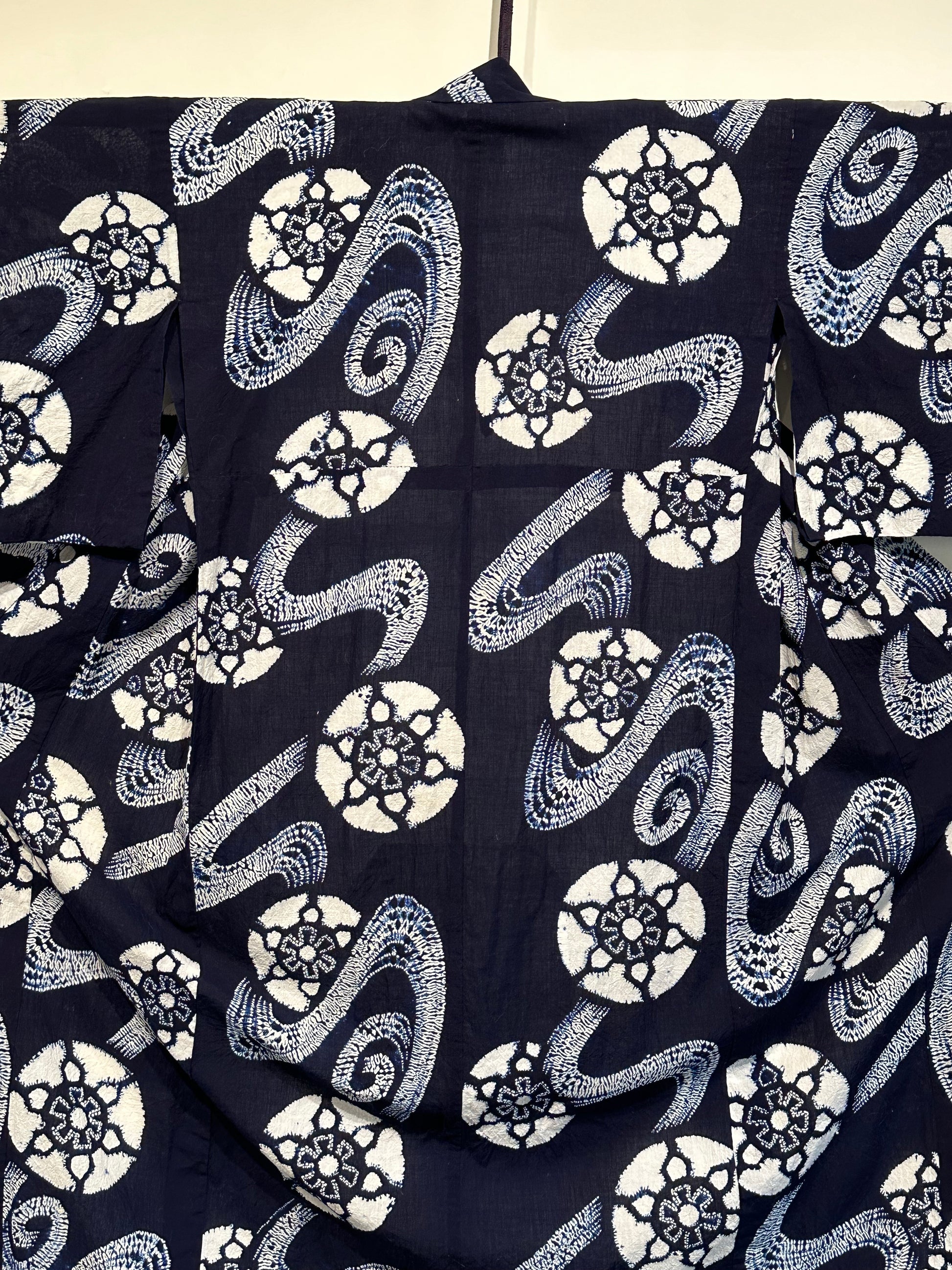 Vintage Japanese shibori yukata in cotton dyed in dark blue with a wheel and stream motif.