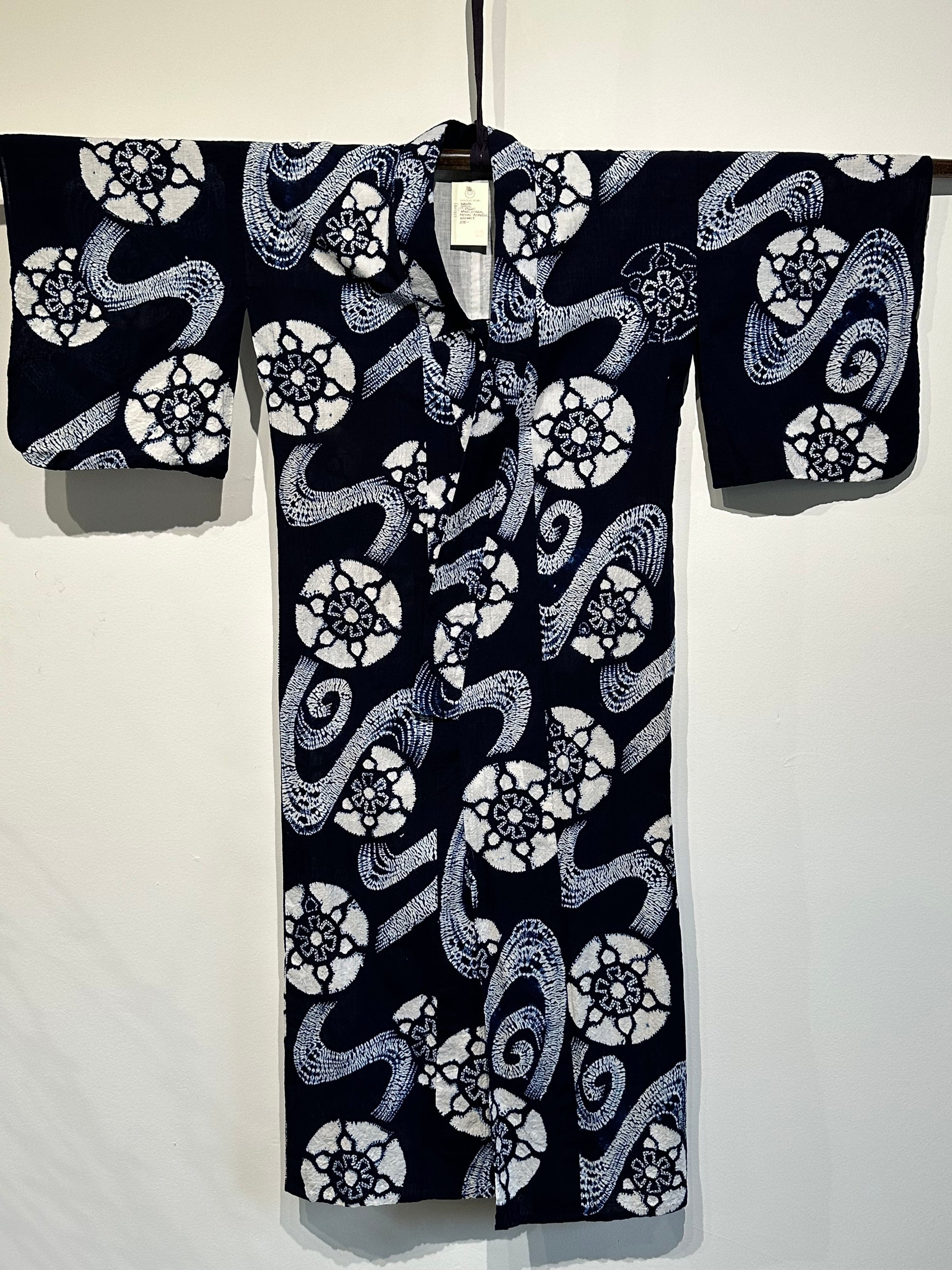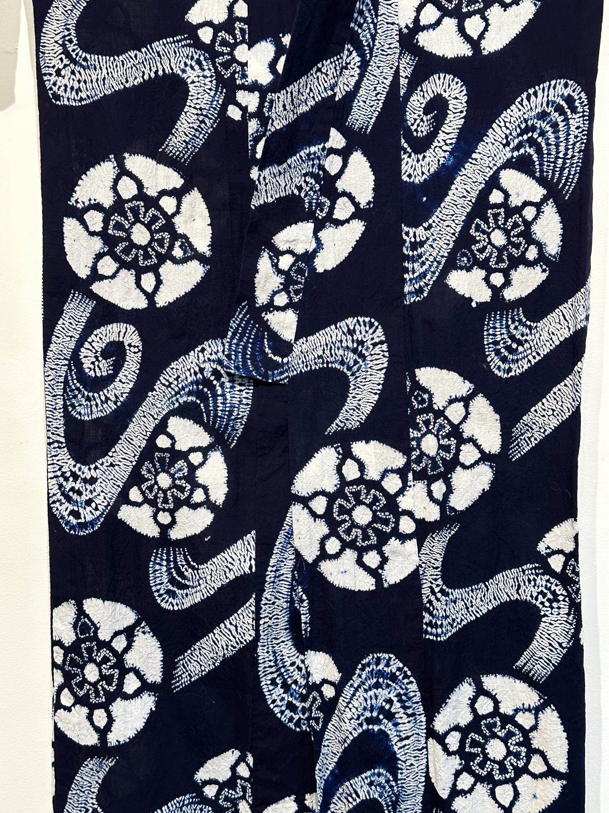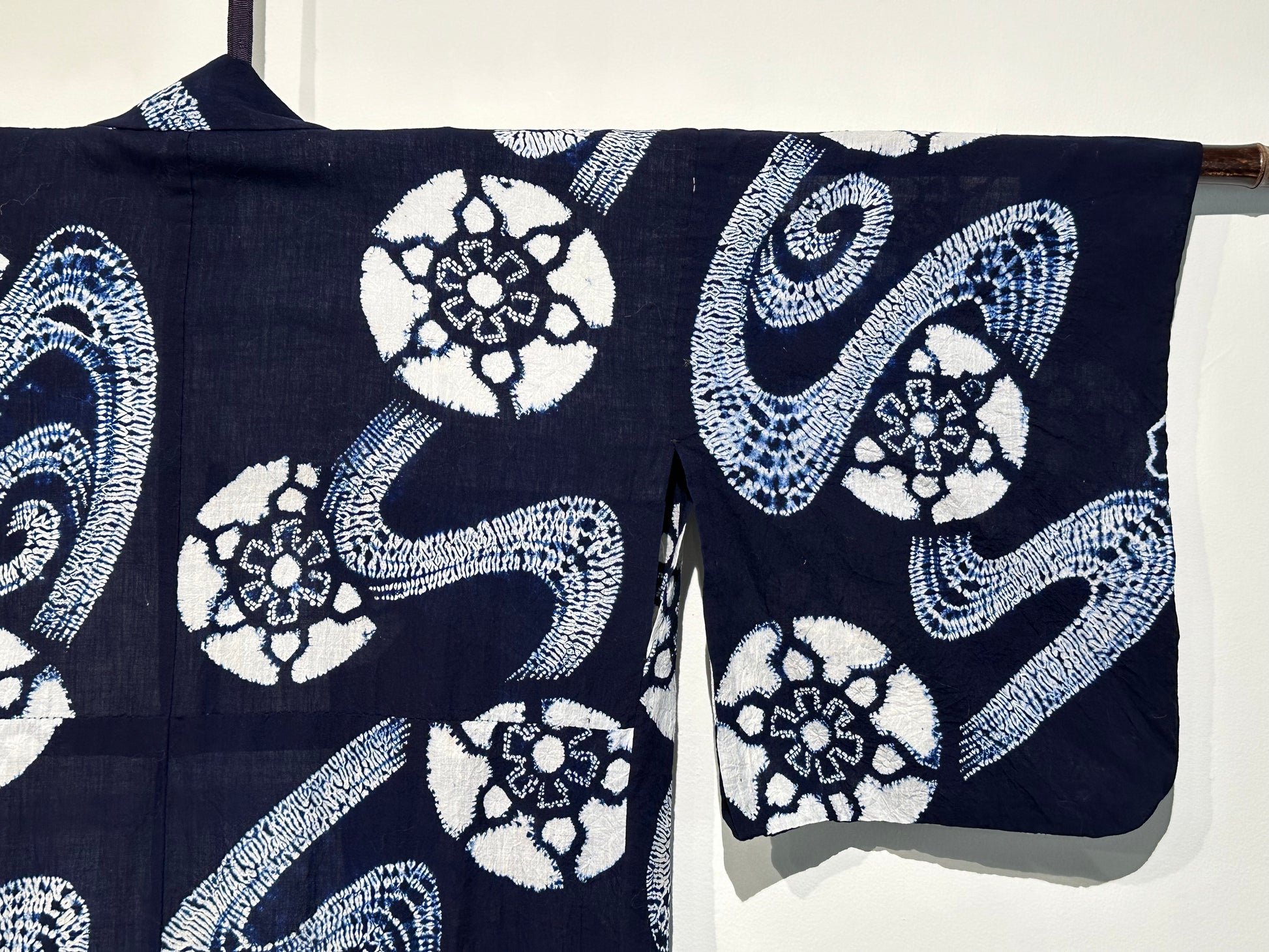 Vintage Japanese shibori yukata in cotton dyed in dark blue with a wheel and stream motif.