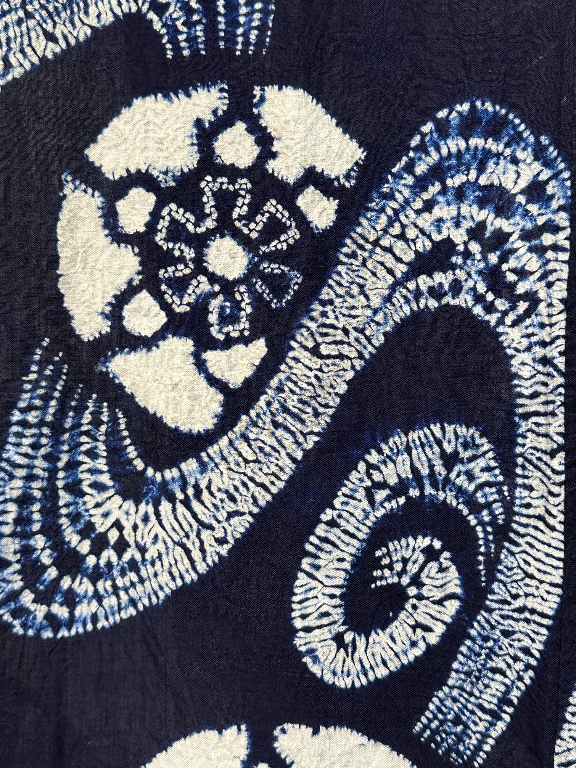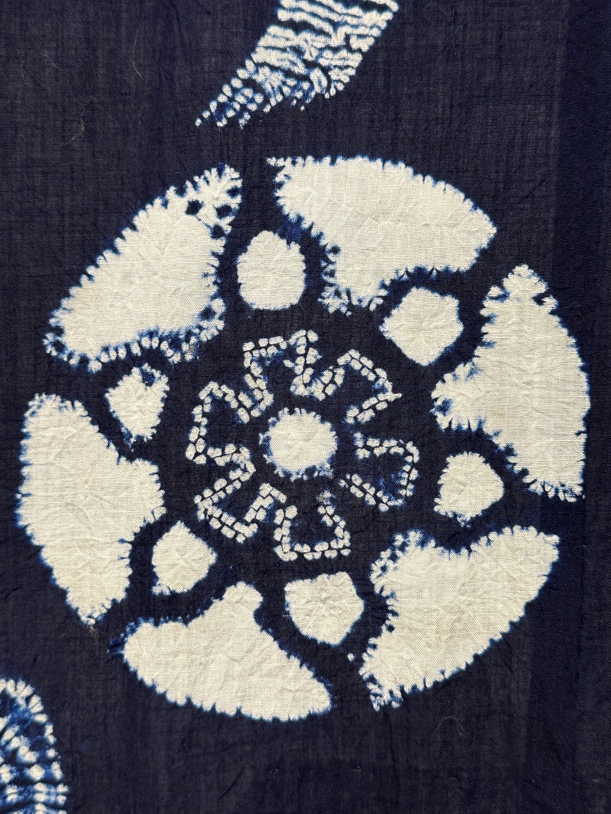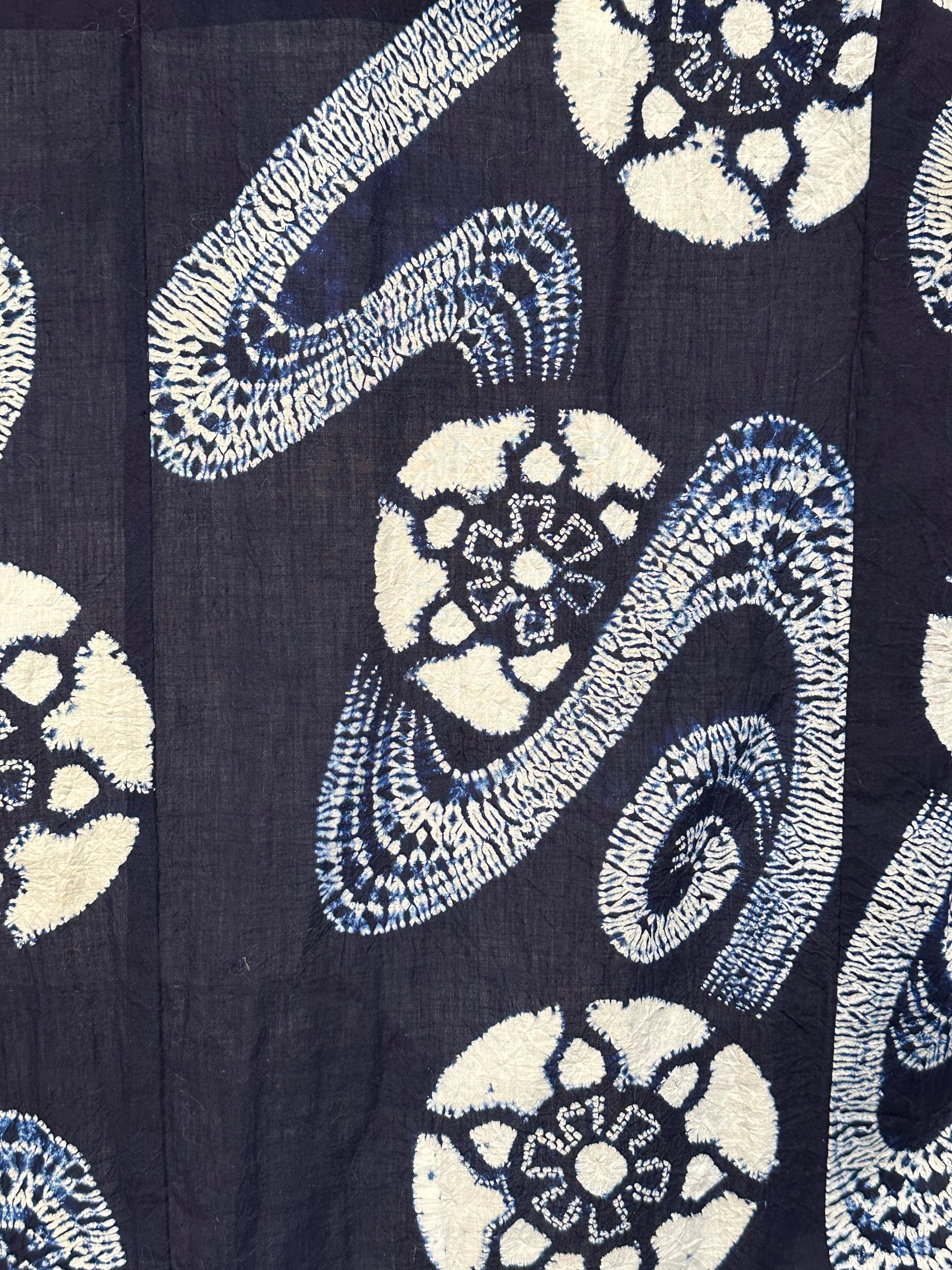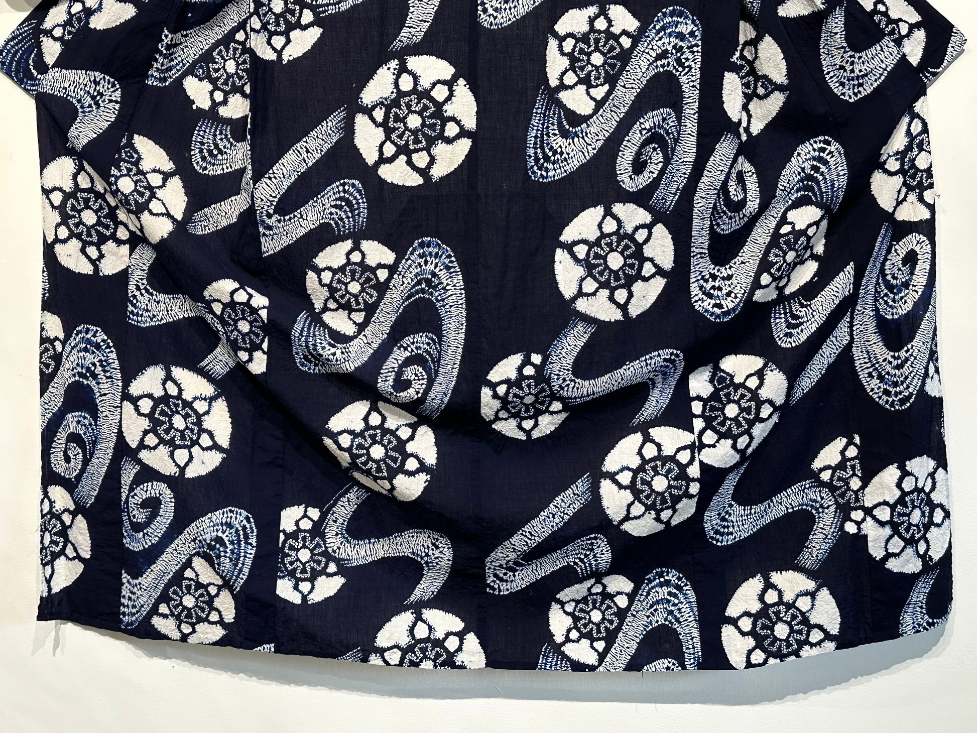 Vintage Japanese shibori yukata in cotton dyed in dark blue with a wheel and stream motif.