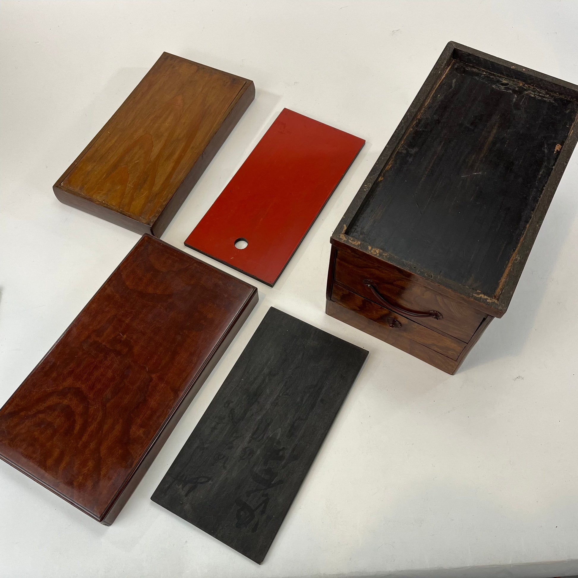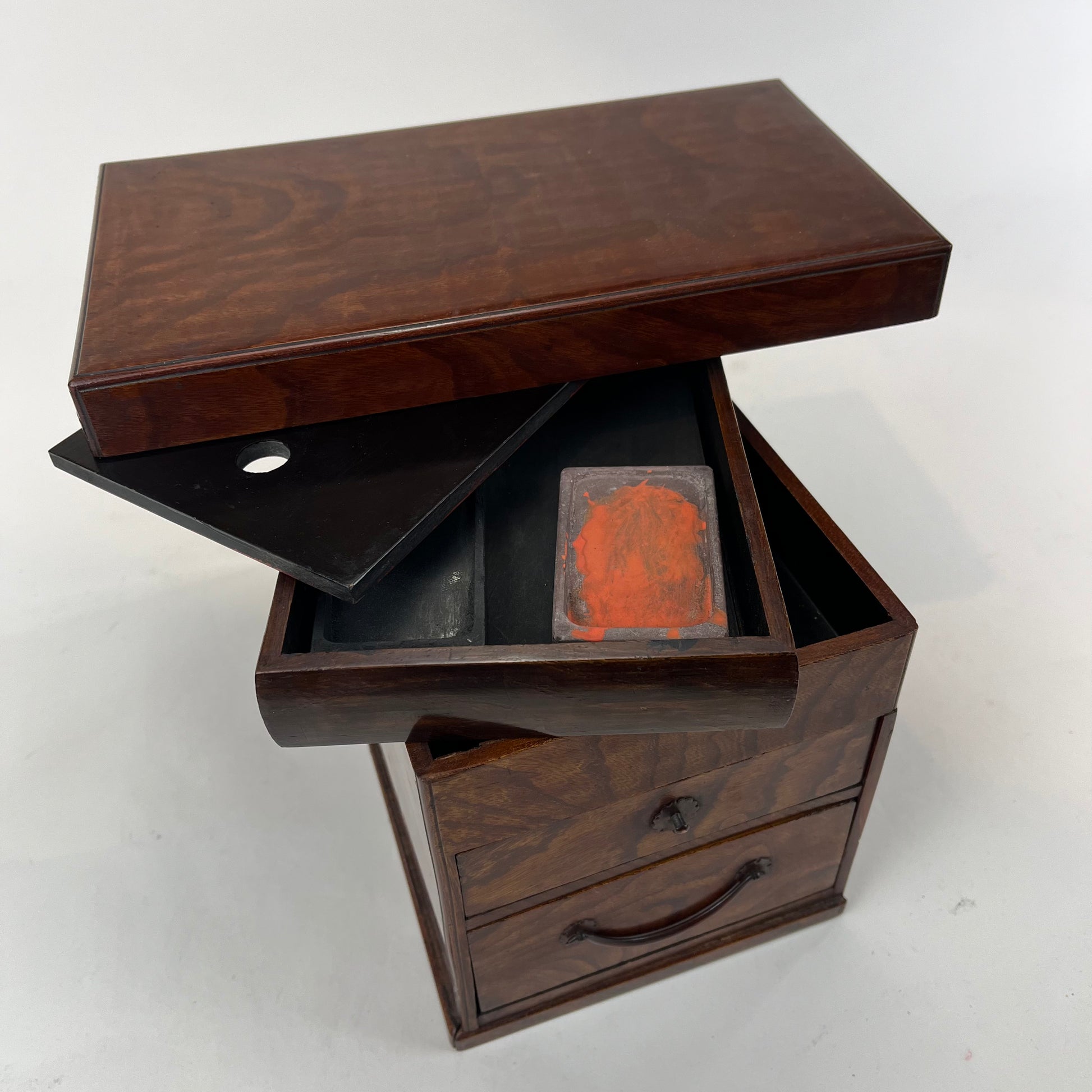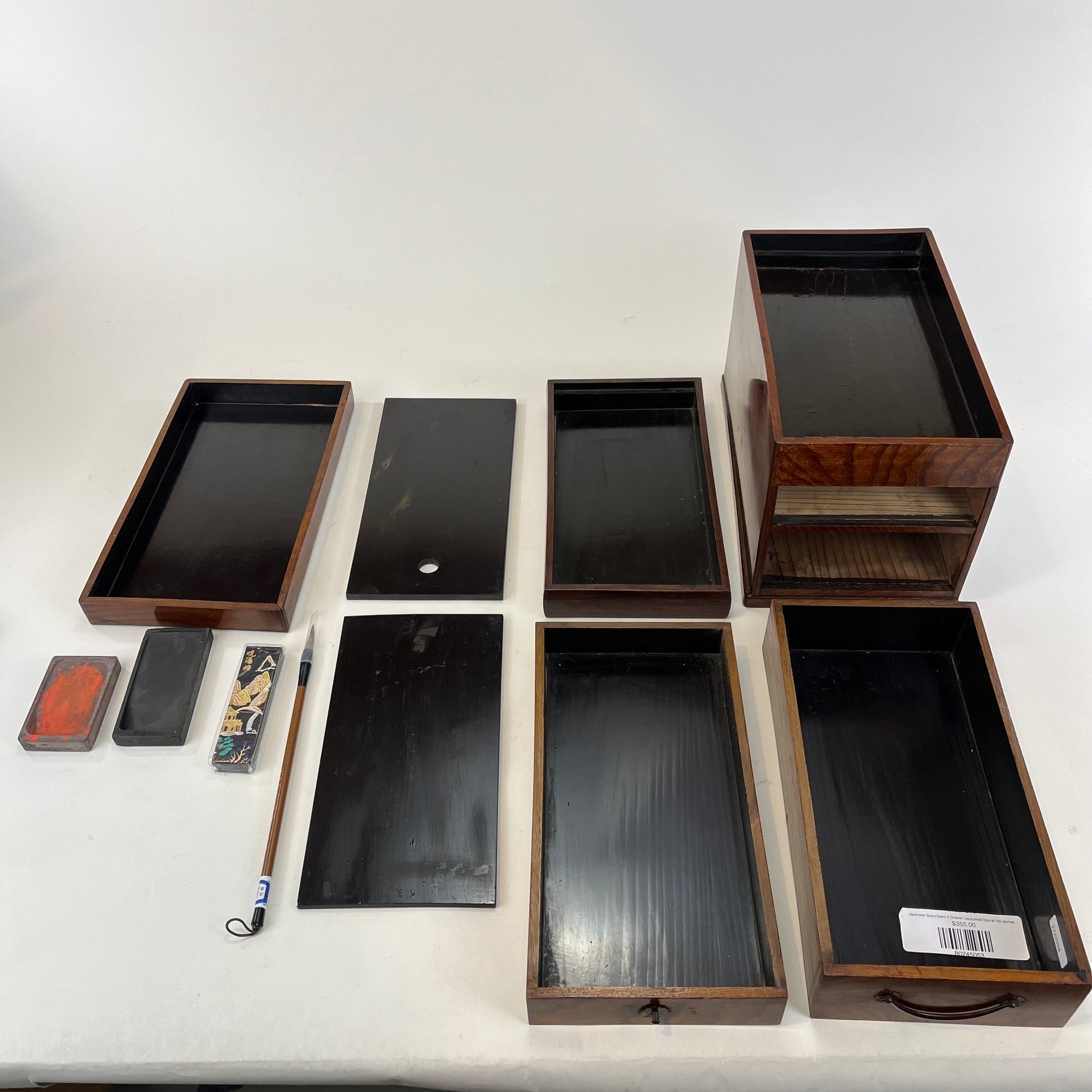 Japanese Suzuribako 2 Drawer Lacquered Box w/ Ink-stones, Brush & Ink Stick Set