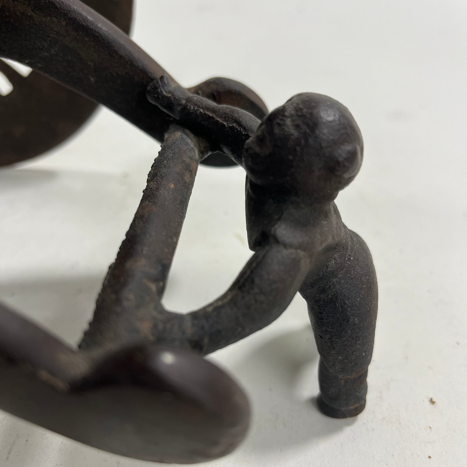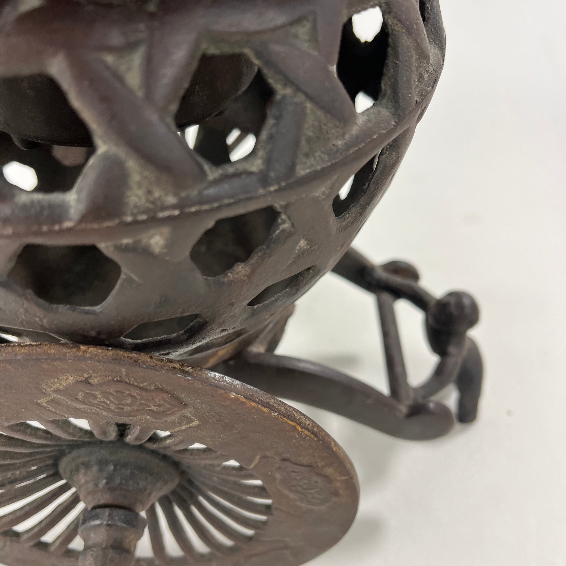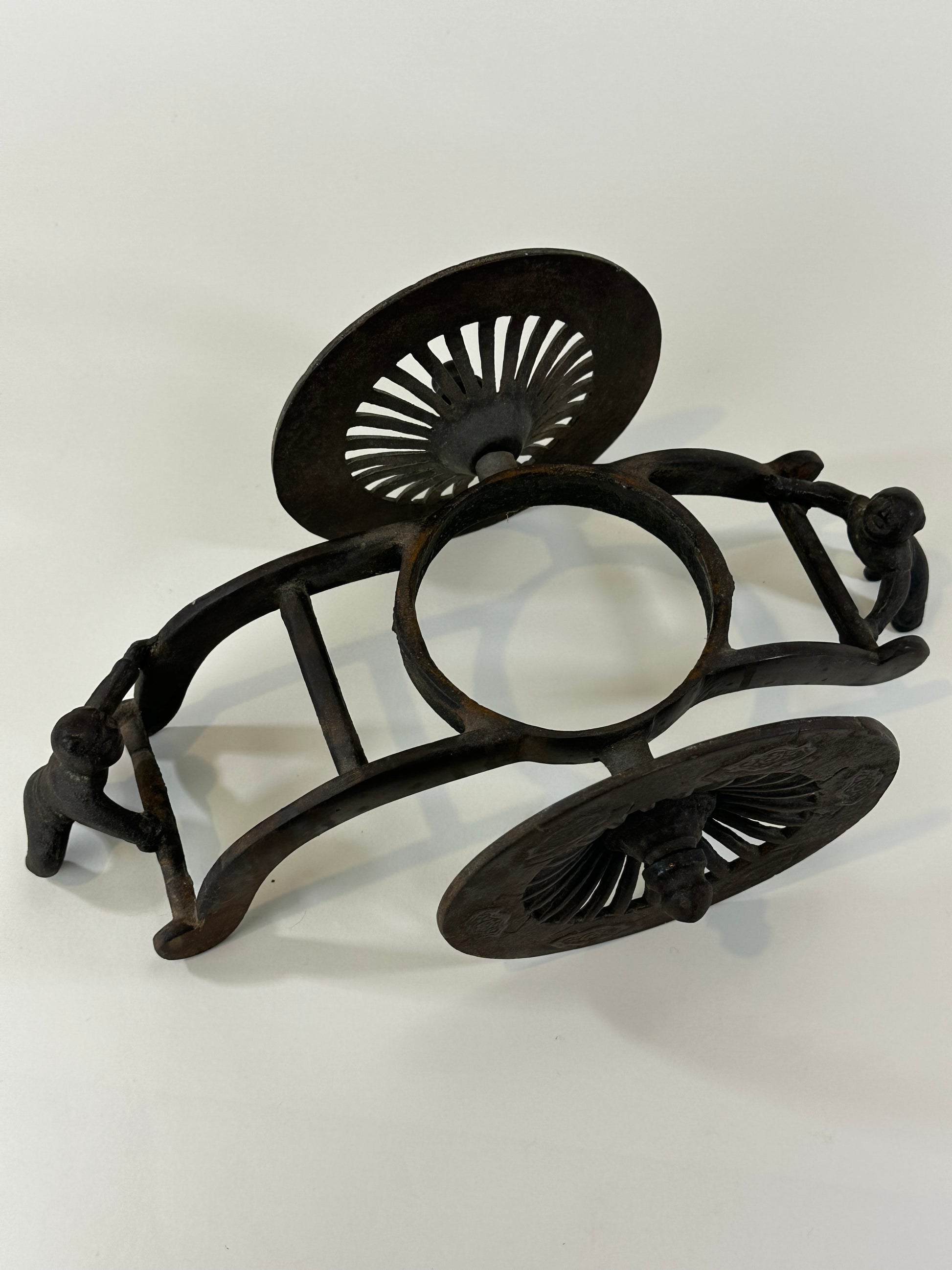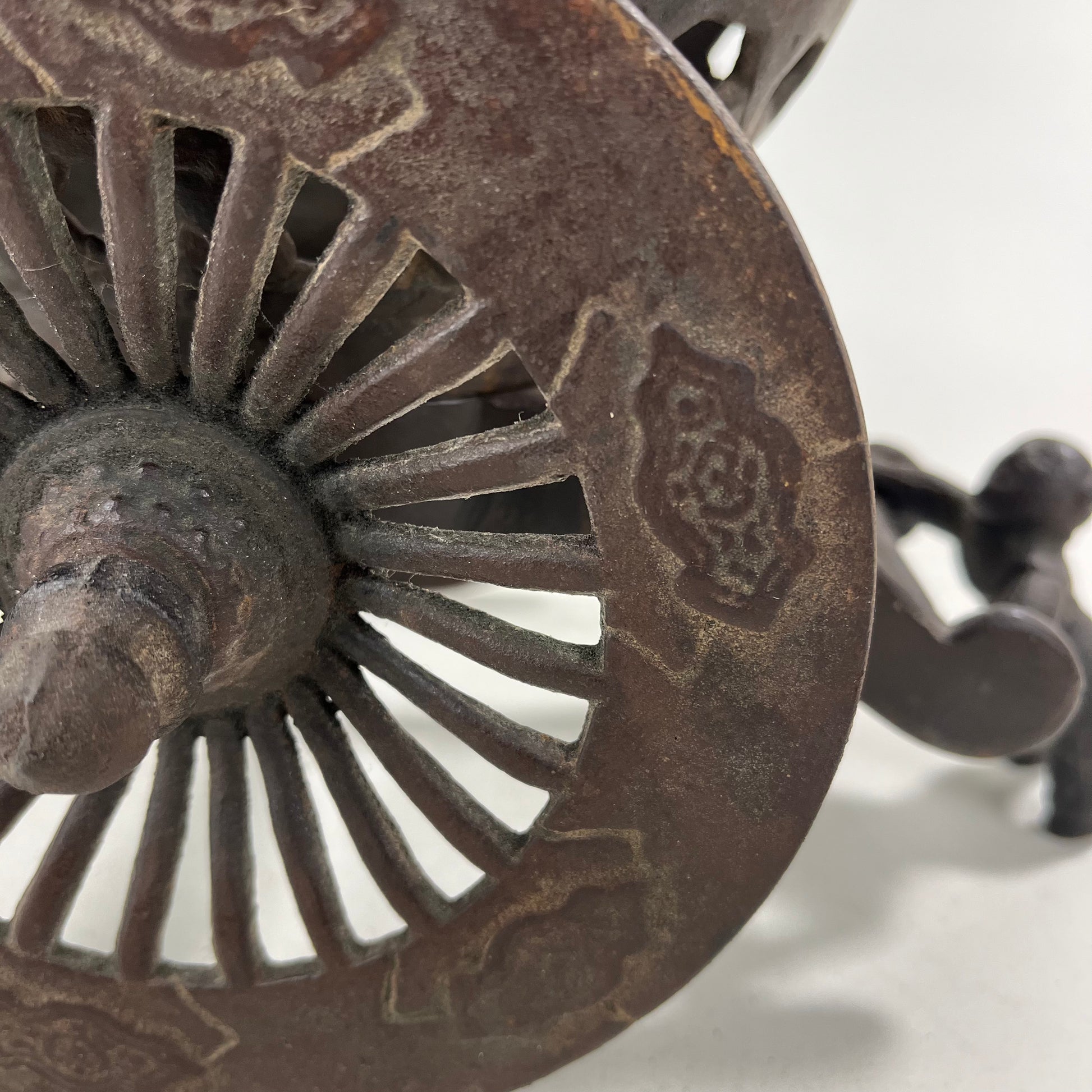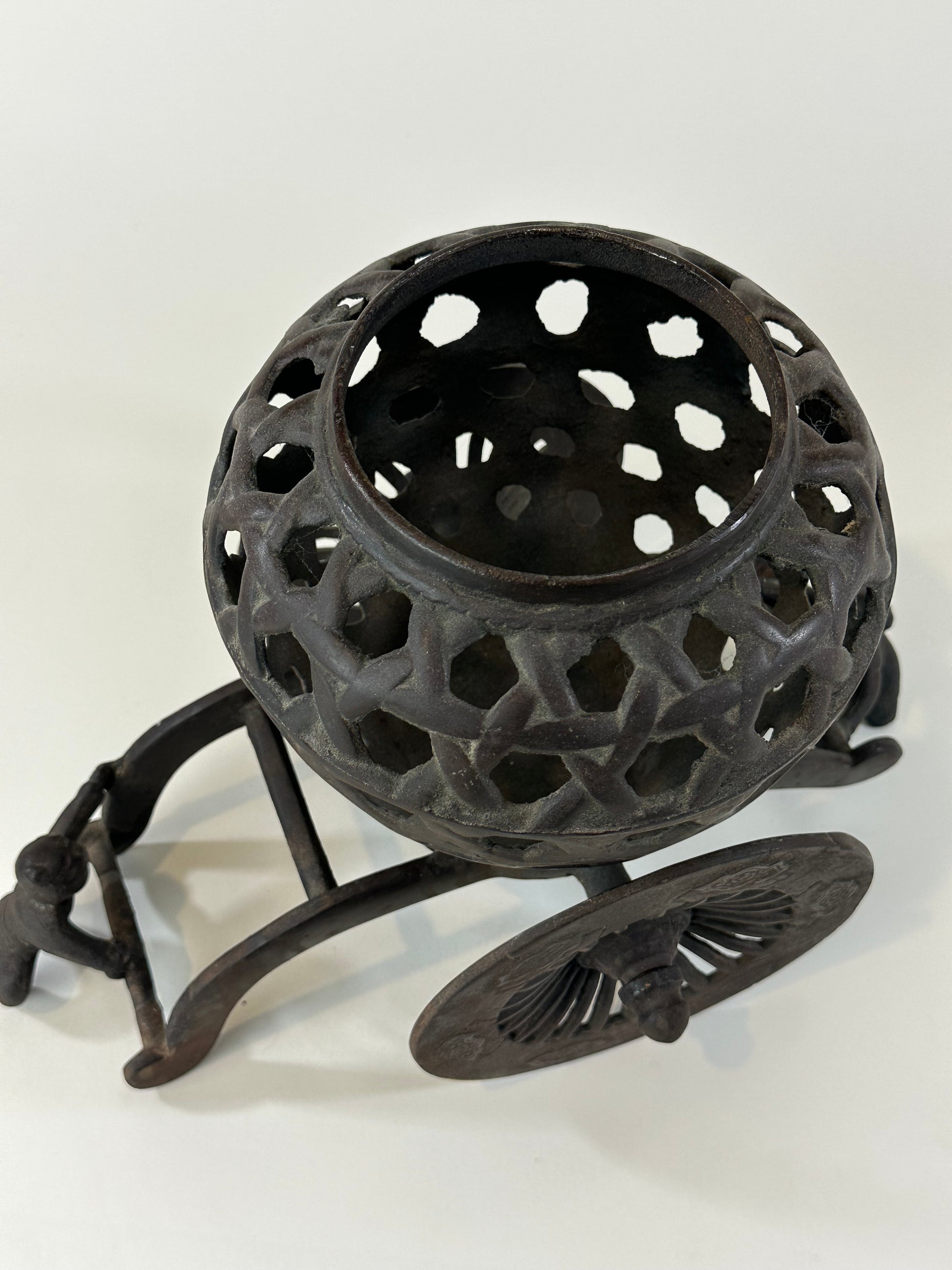 This is a Japanese bronze Usubata (Ikebana flower vase). This vase is used in a tokonoma (alcove in a traditional Japanese home) to display flowers. It is made of a heavy bronze and has a thick cast design of a cart with a woven basket moved by two small children with a removable top filled with water for flowers.
