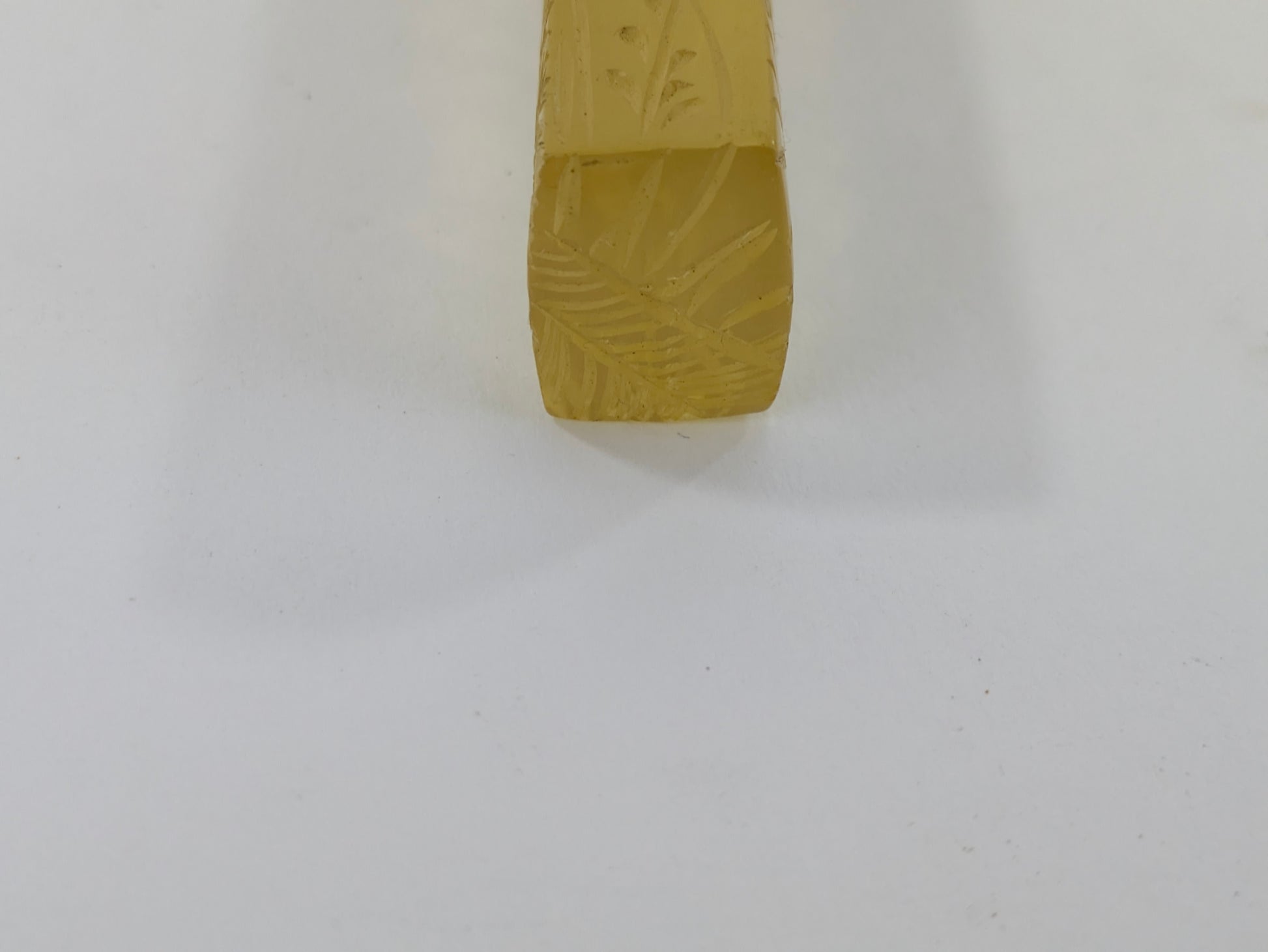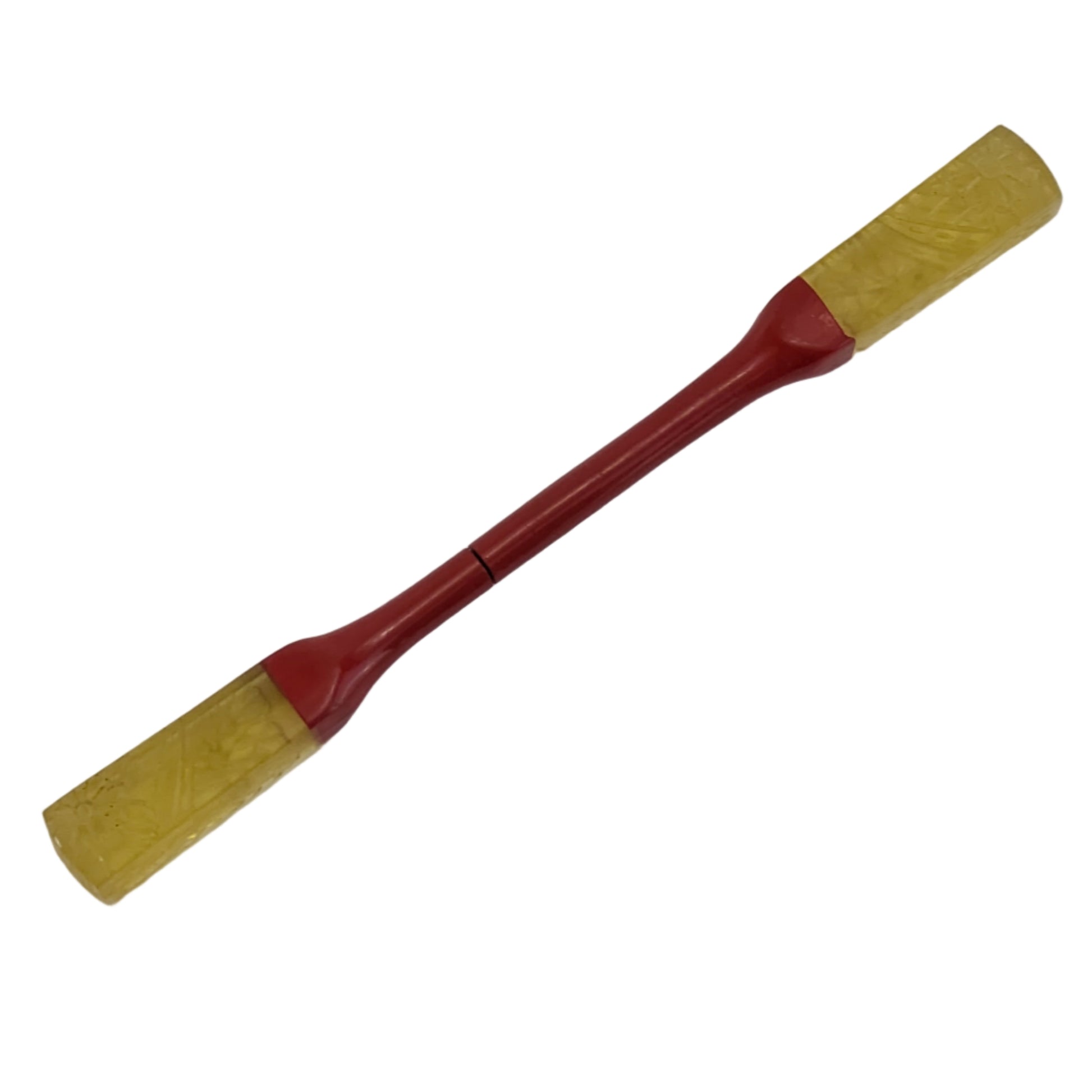 Striking late Meiji period kogai (笄) hair ornament featuring deep red lacquer over wood with translucent amber-tone celluloid ends. Each end is delicately etched with kiku (菊, chrysanthemum) motifs—symbols of longevity and elegance associated with the Imperial family and autumn season. The warm transparency of the celluloid contrasts beautifully with the rich vermilion lacquer, a pairing that became popular in the 1890s as modern materials began to complement traditional Japanese design.