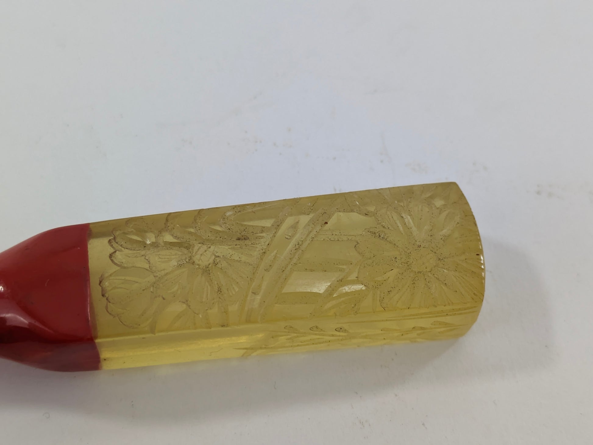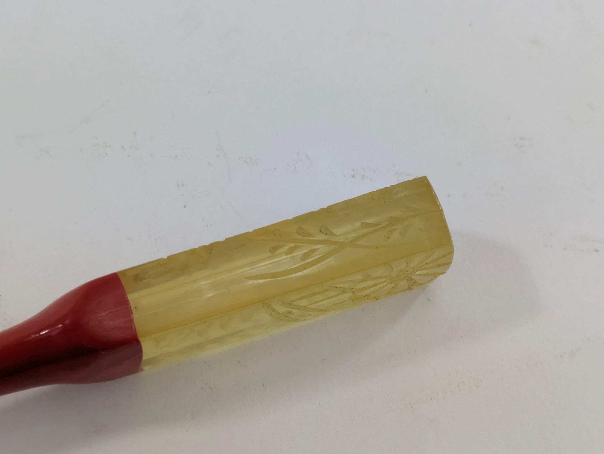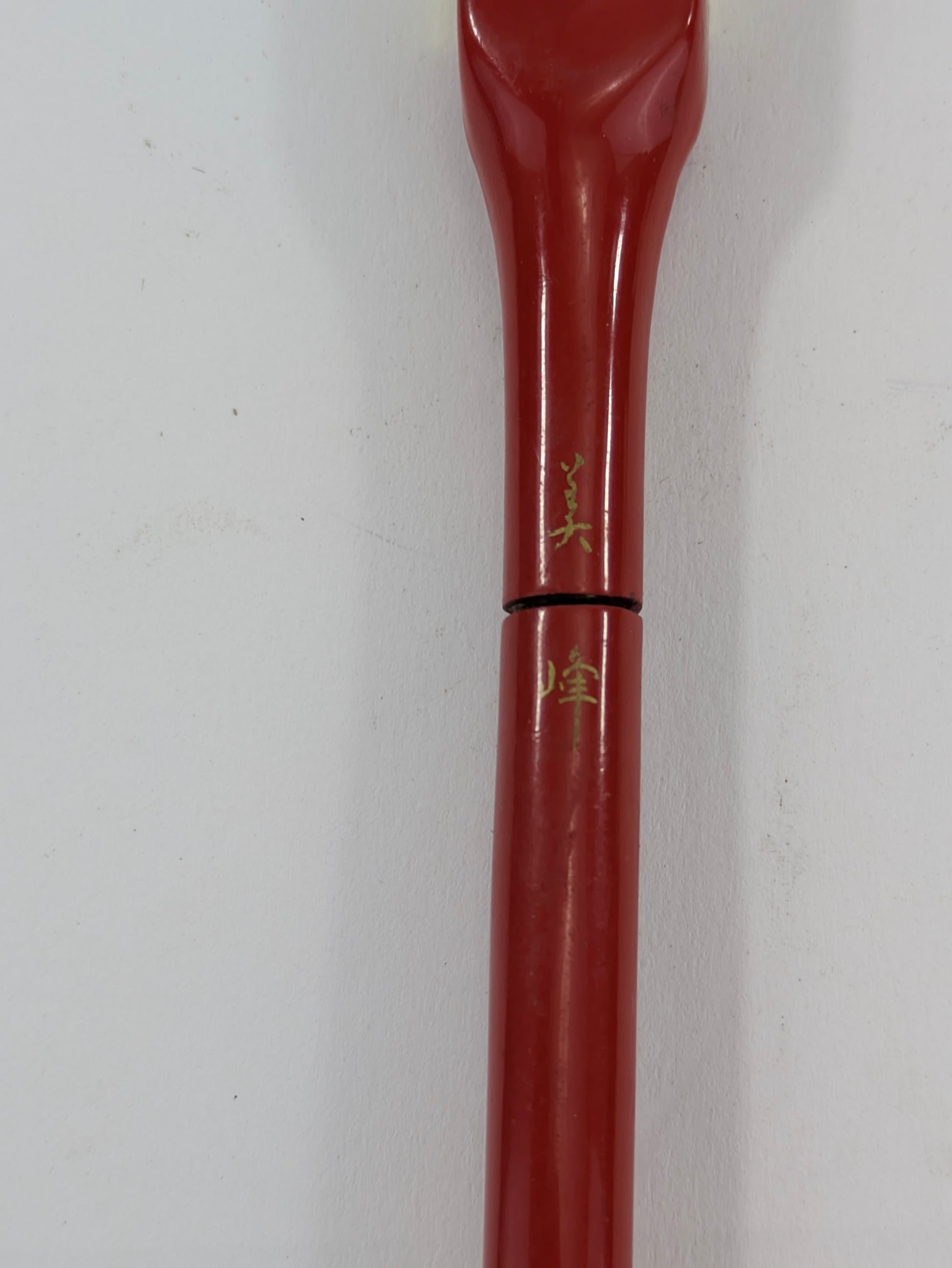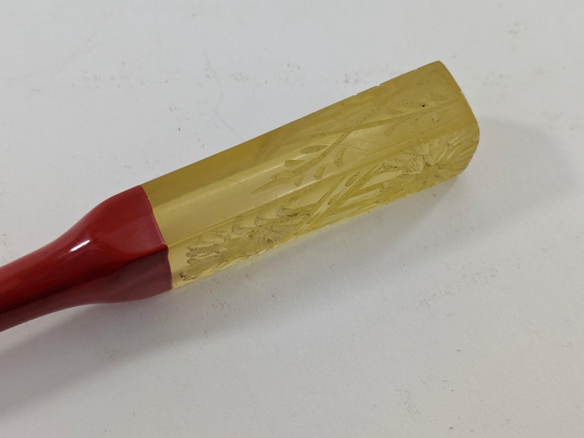 Antique Japanese Kogai Hair Ornament – Red Lacquer with Etched Chrysanthemum on Amber Celluloid – Signed – 8¼"