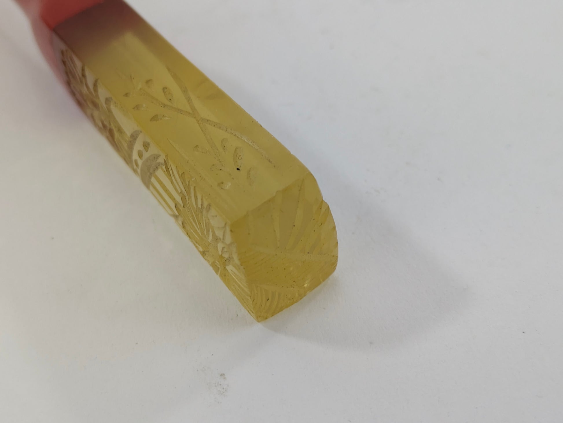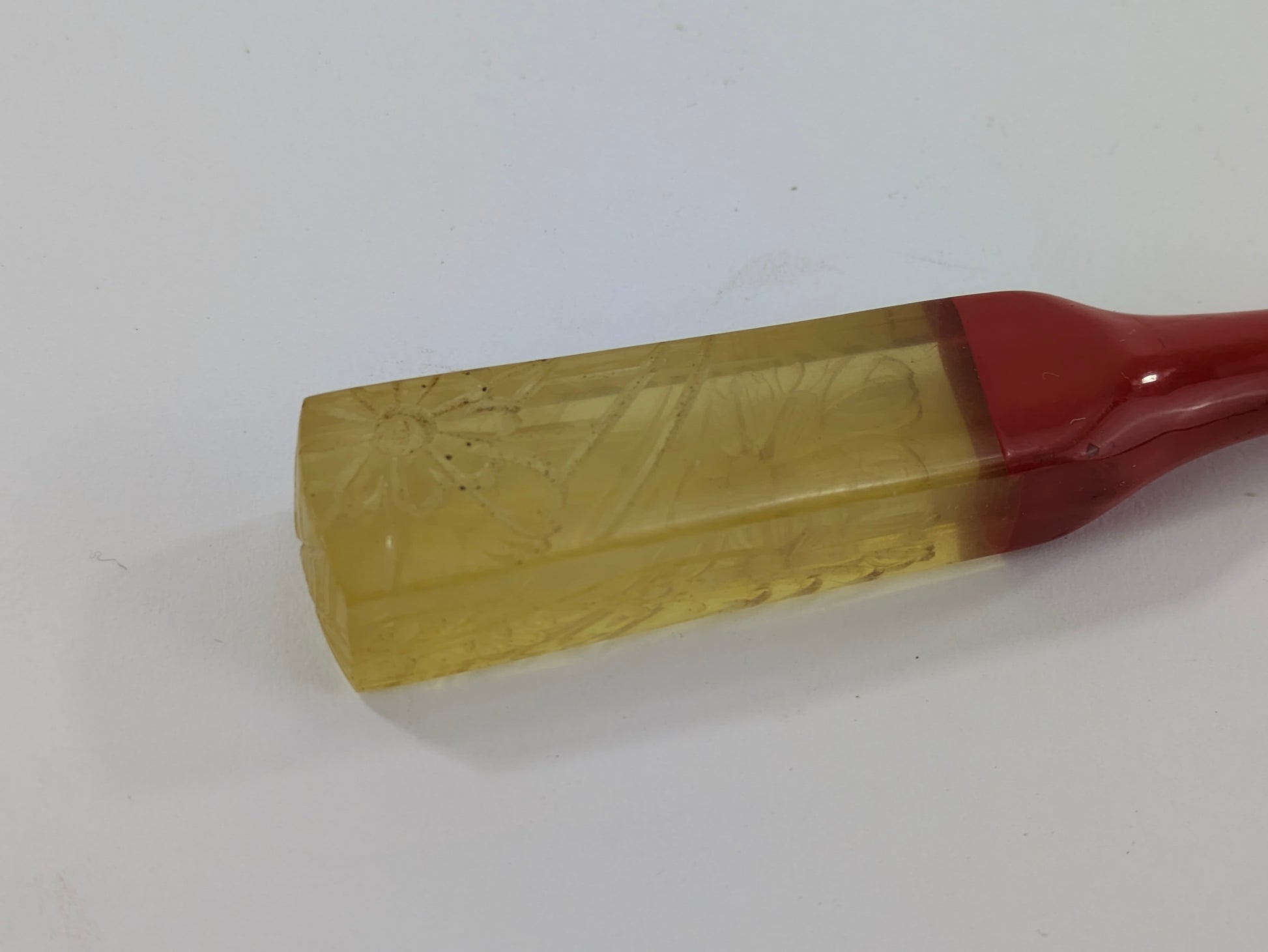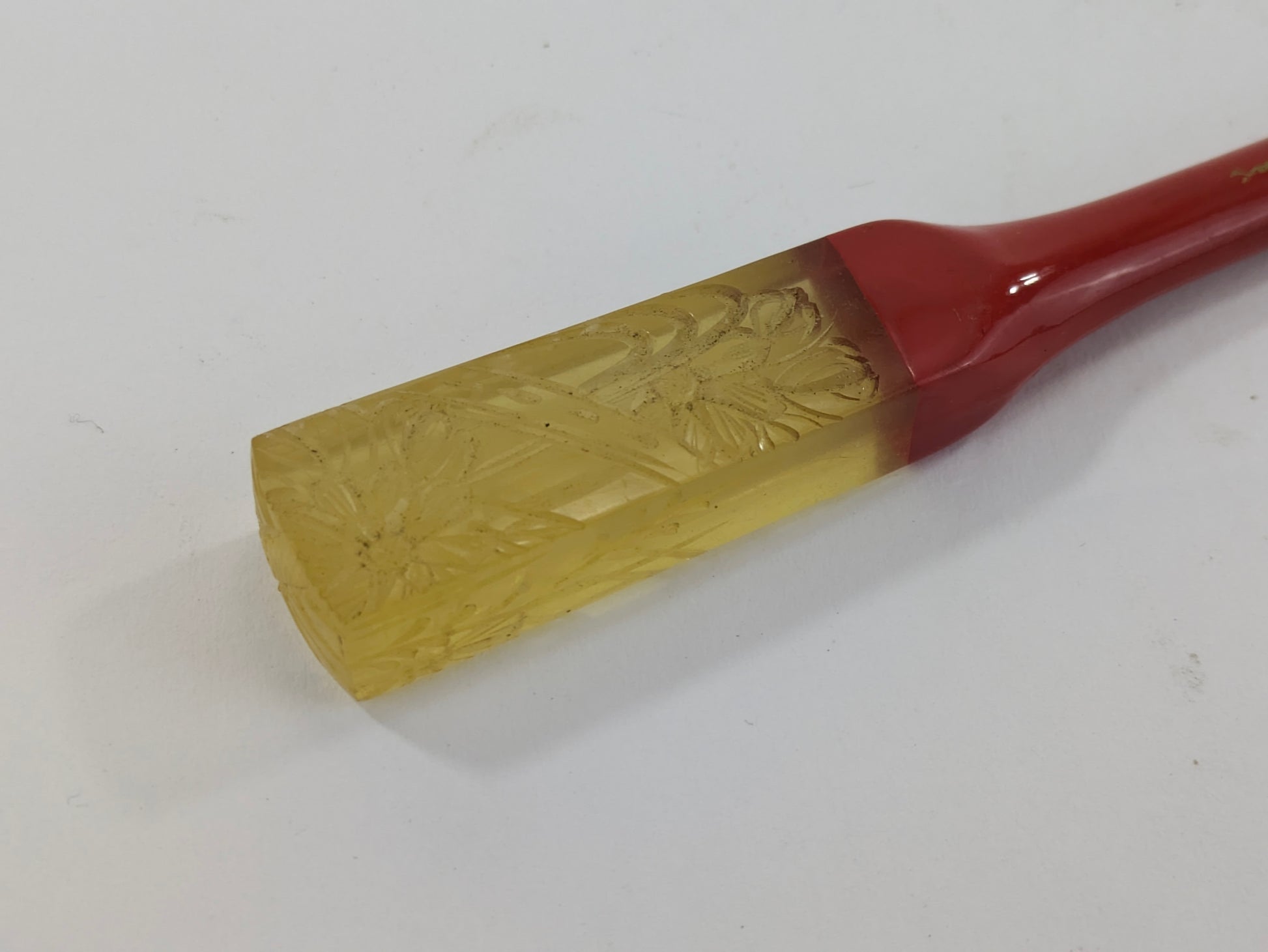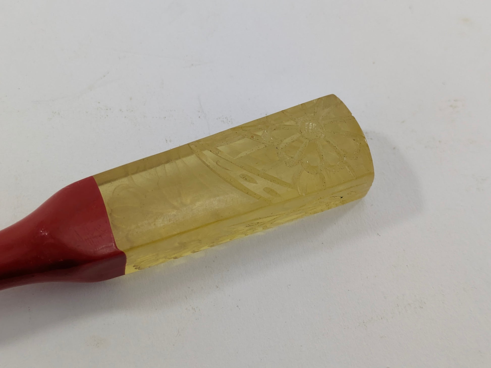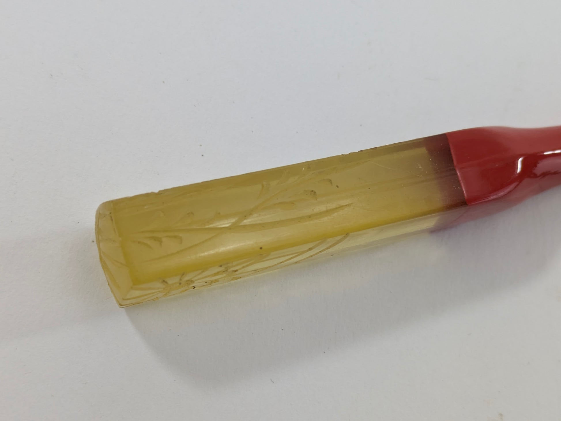 Antique Japanese Kogai Hair Ornament – Red Lacquer with Etched Chrysanthemum on Amber Celluloid – Signed – 8¼"