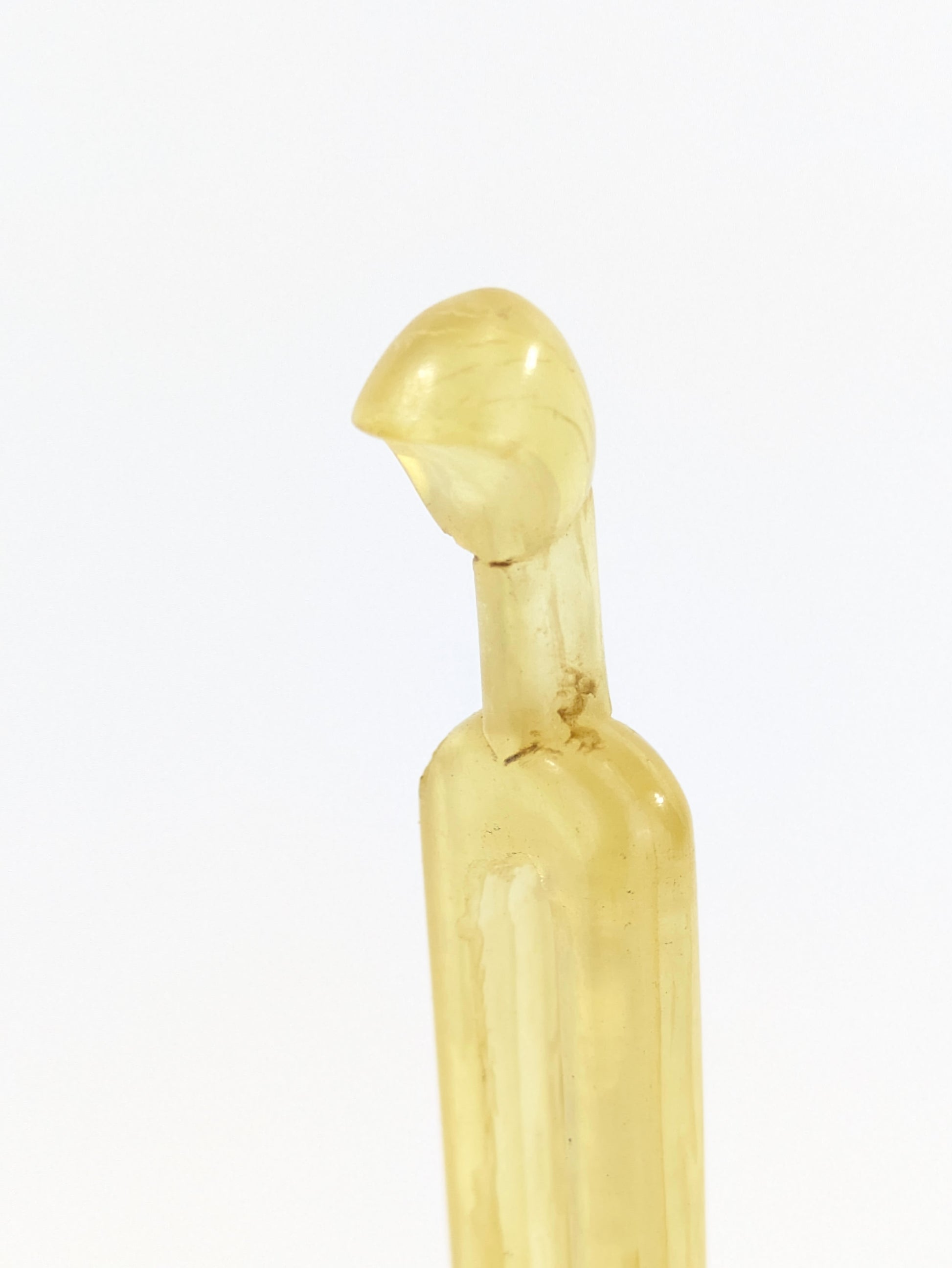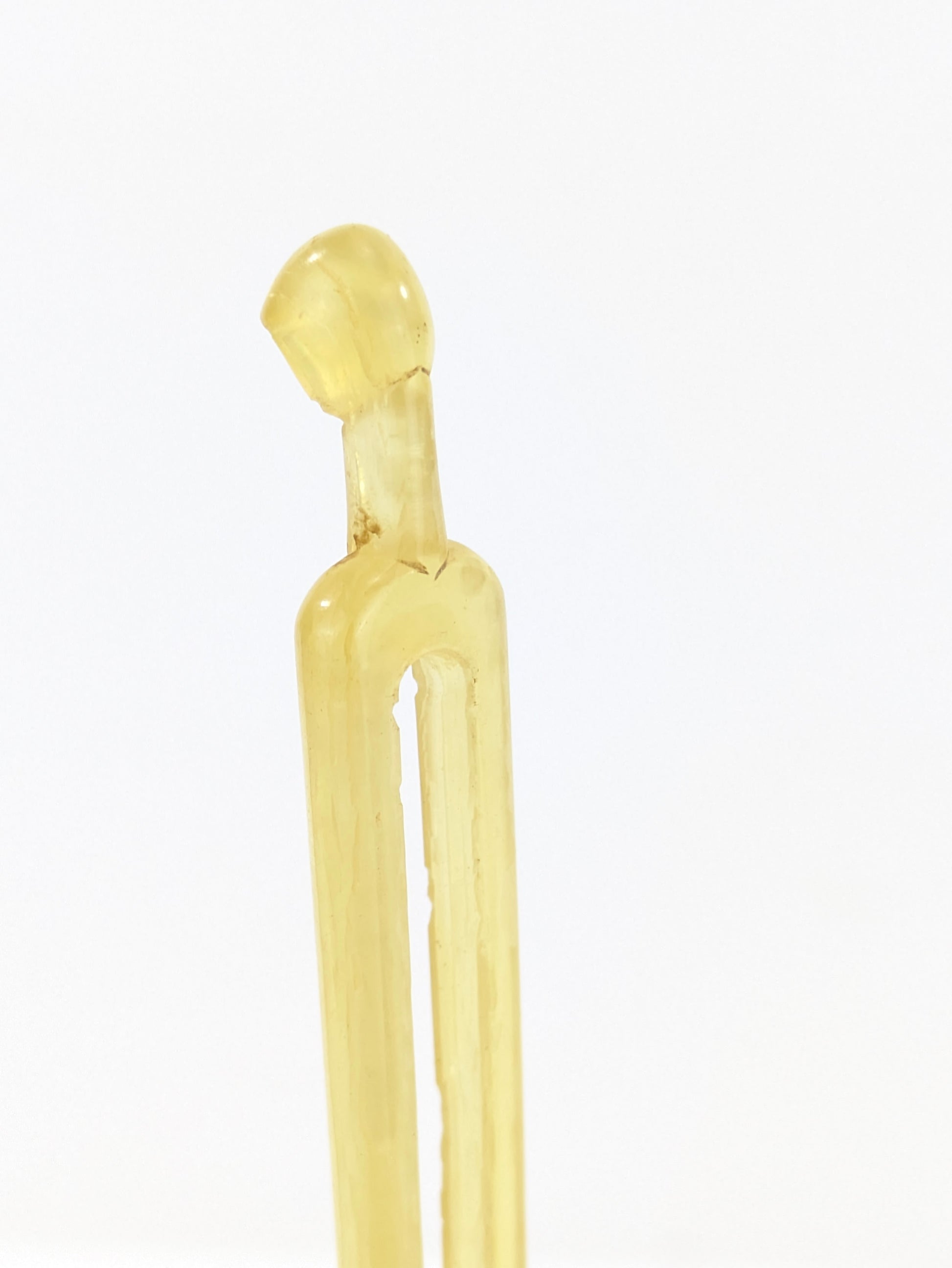 Minimalist kanzashi (簪) hair ornament from the early Shōwa period, formed entirely of translucent amber-toned resin. The piece is carved in a sleek, modern split-fork design with a gently domed finial, its clean lines reflecting the simplified elegance popular in 1930s Japan.