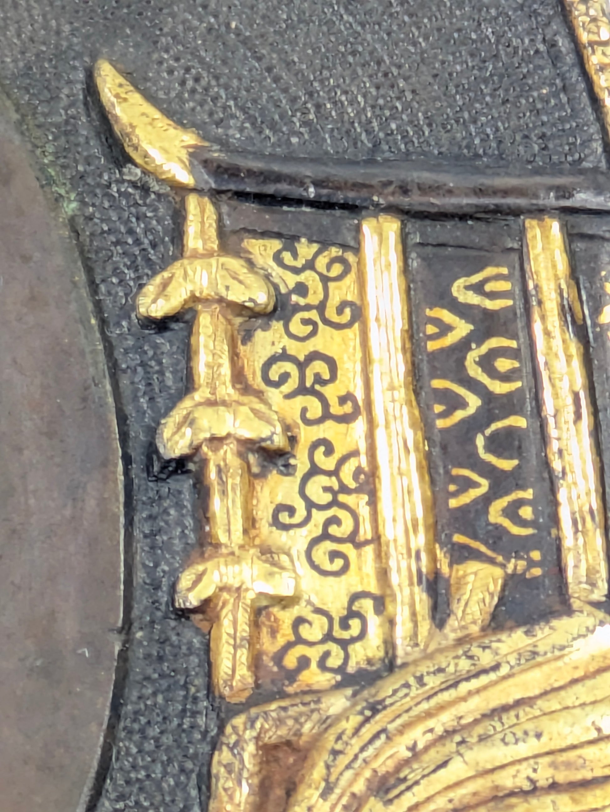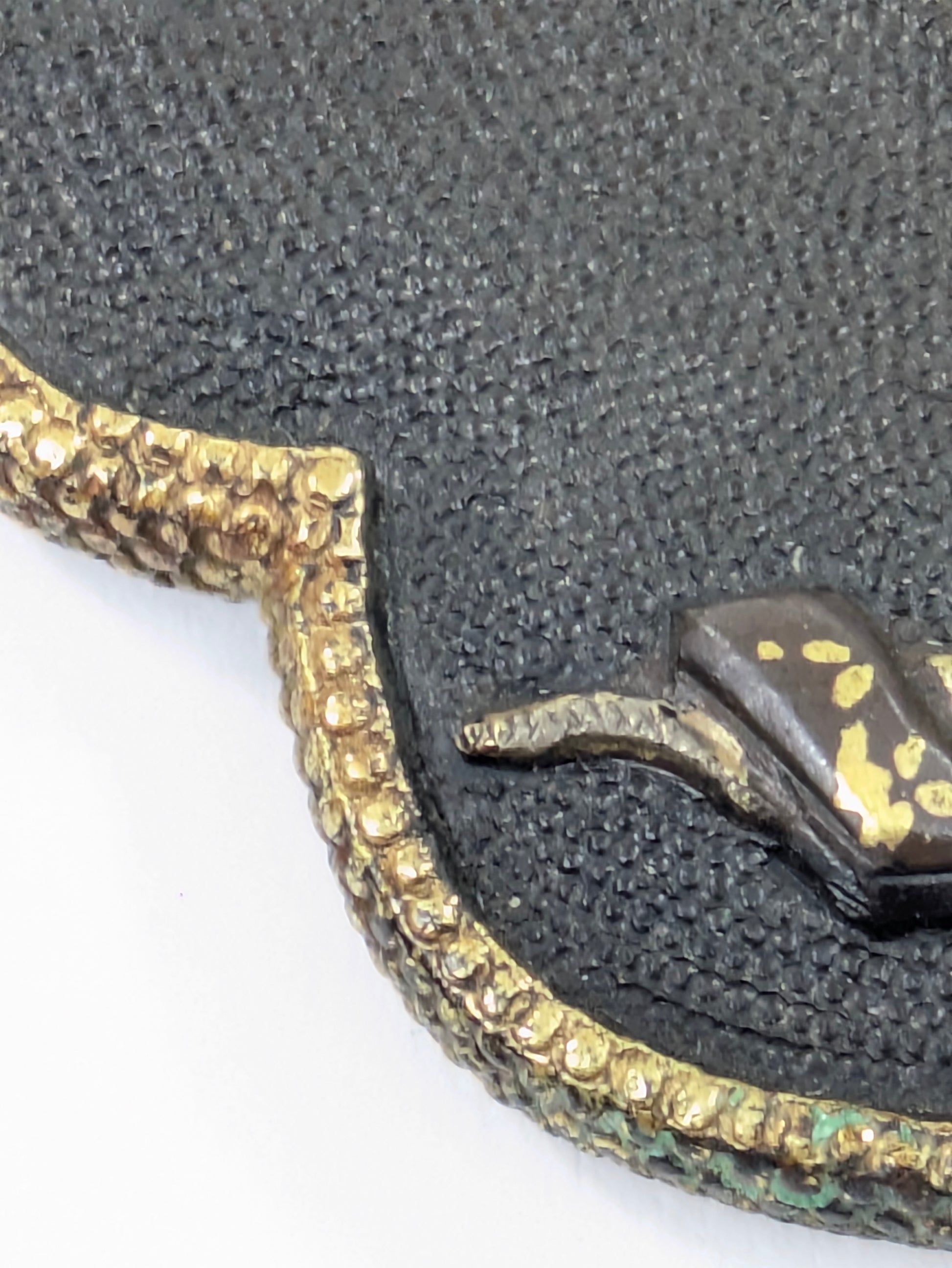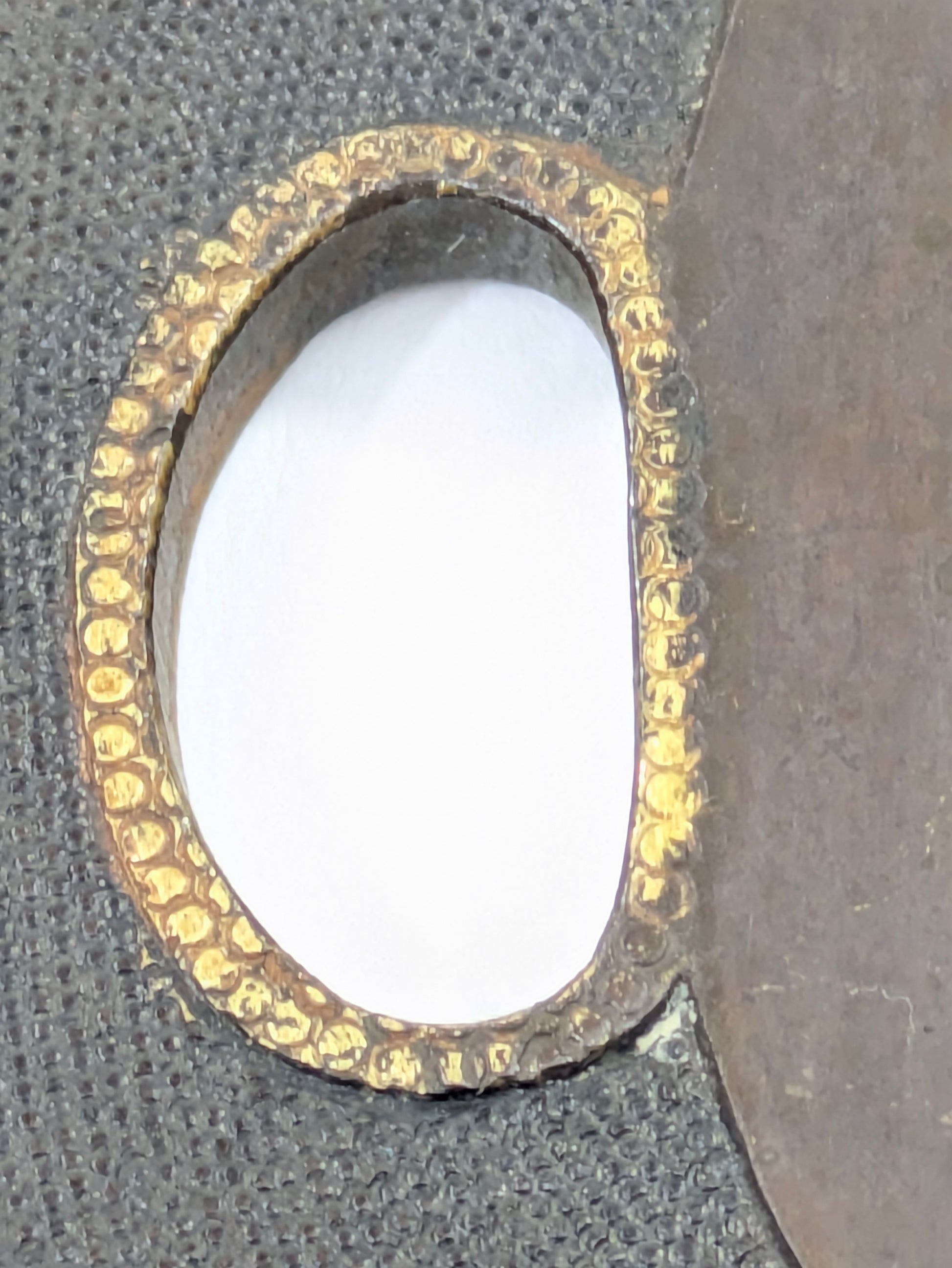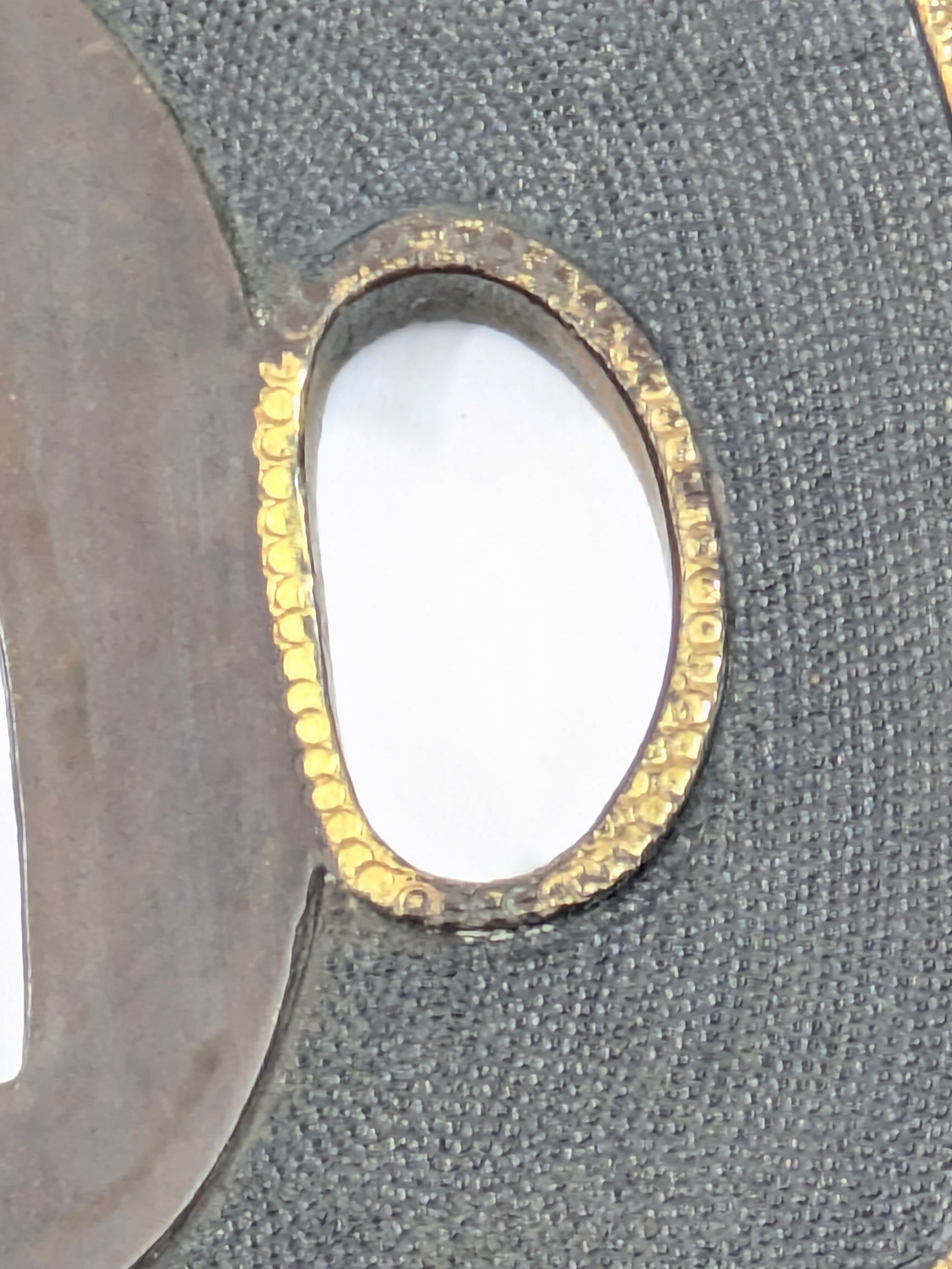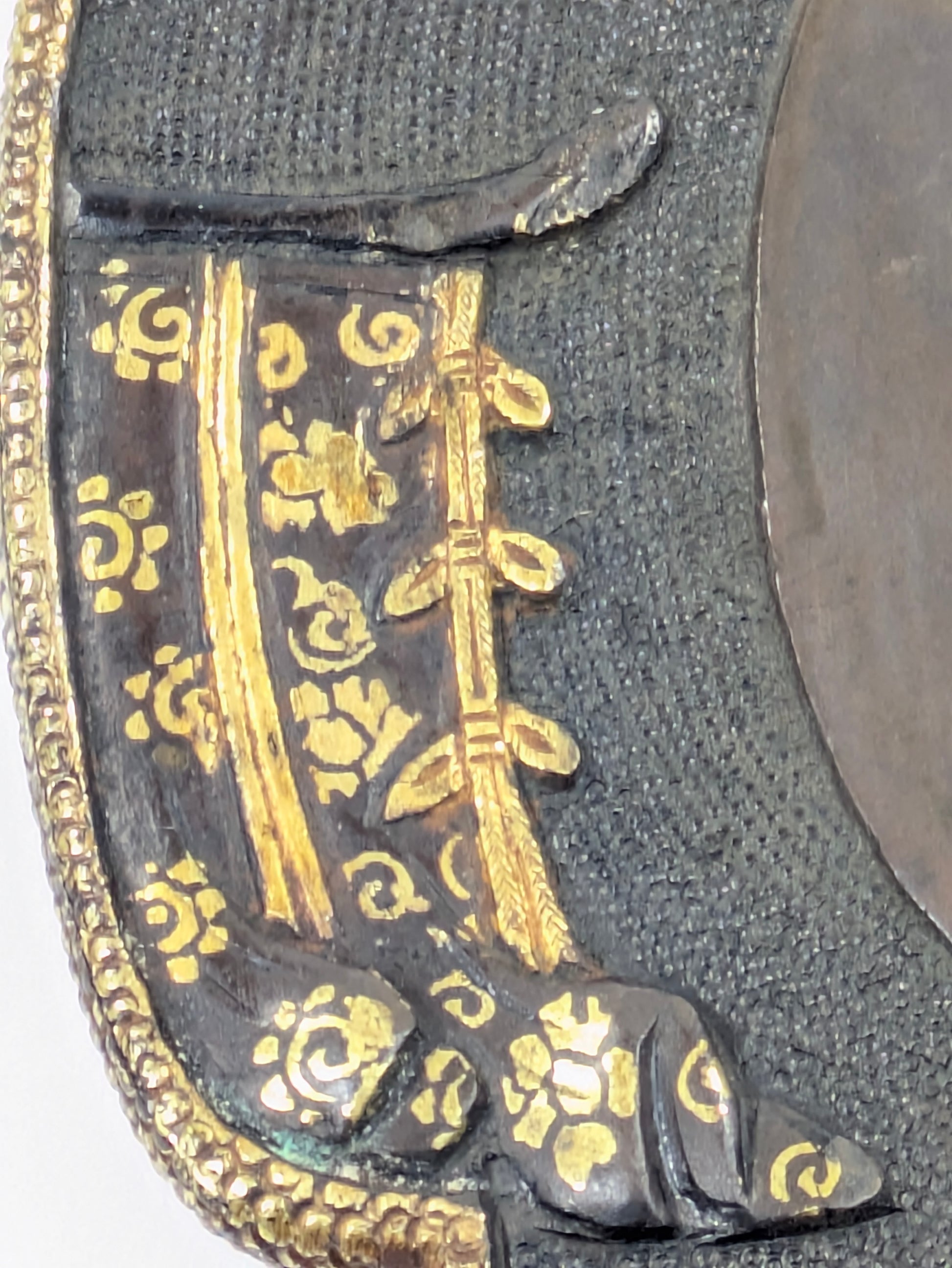 The rim and hitsu-ana are bordered in gilt with finely dotted beading, completing the frame of this miniature scene. This guard demonstrates not only fine craftsmanship but also the Edo-period fascination with reviving classical Heian themes in the decorative arts.