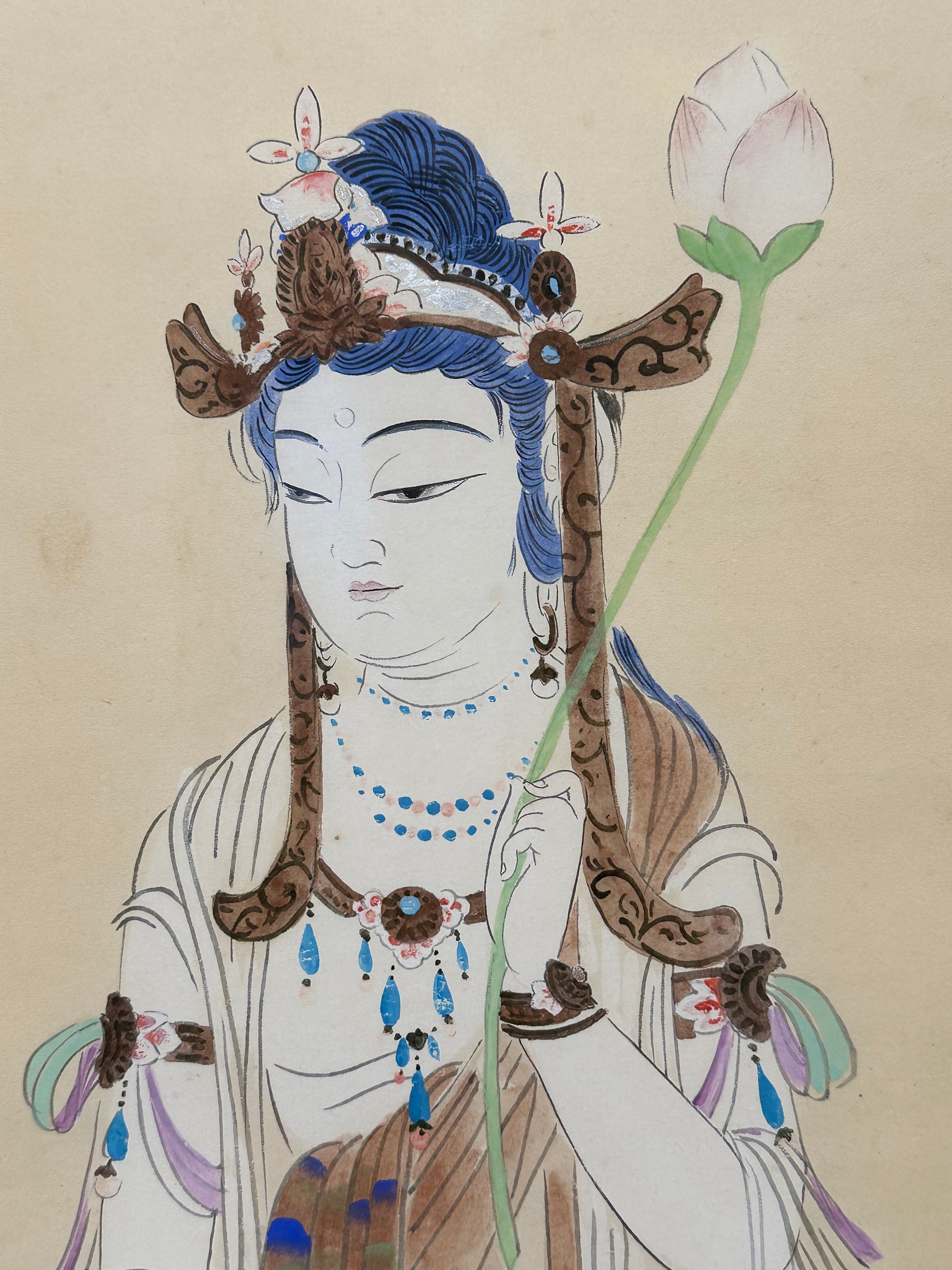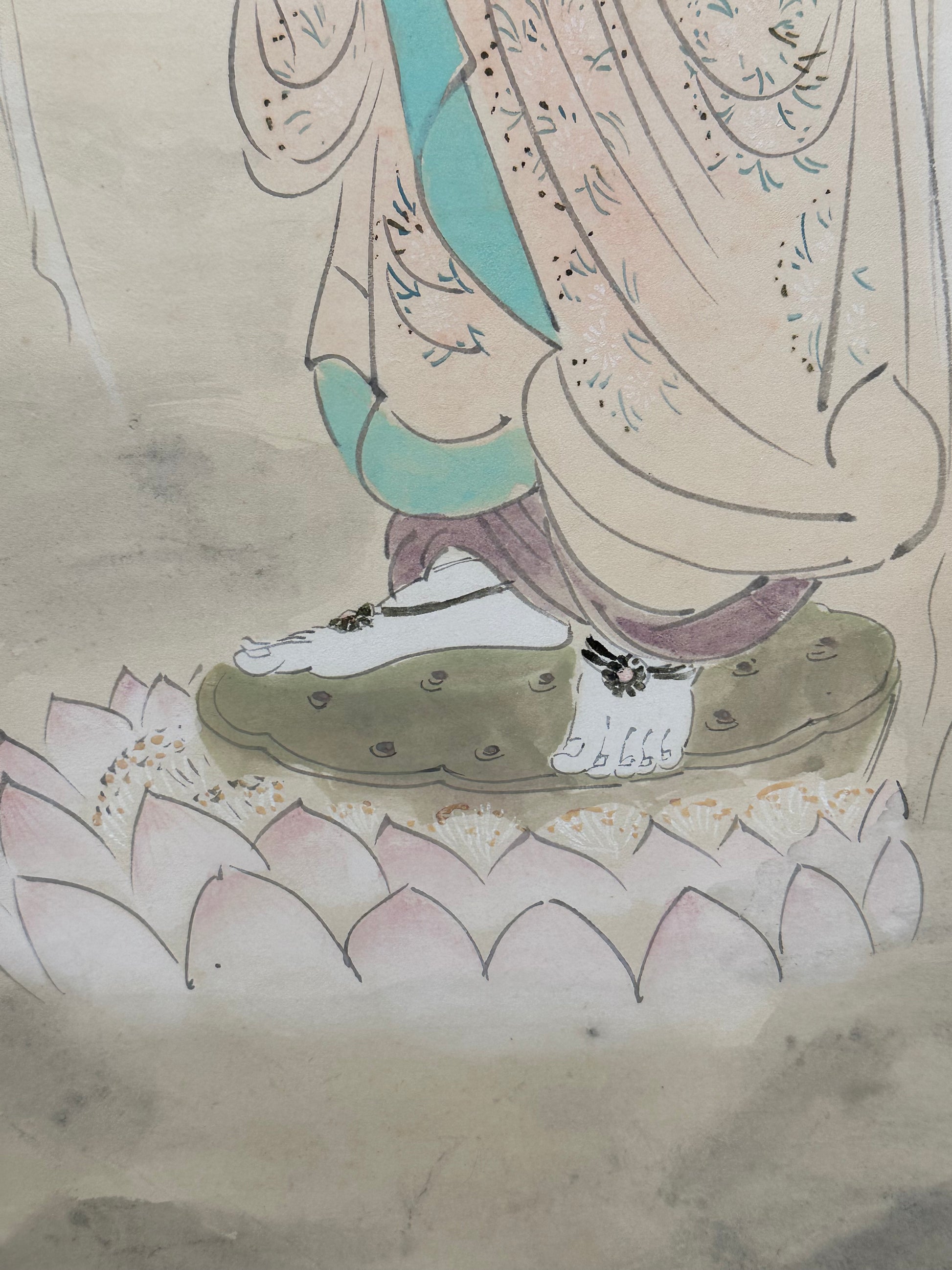A contemplative and visually elegant representation of Quan Yin / Kannon, well suited for collectors of Buddhist art, Japanese scrolls, or interior spaces seeking a sense of calm, compassion, and historical depth.