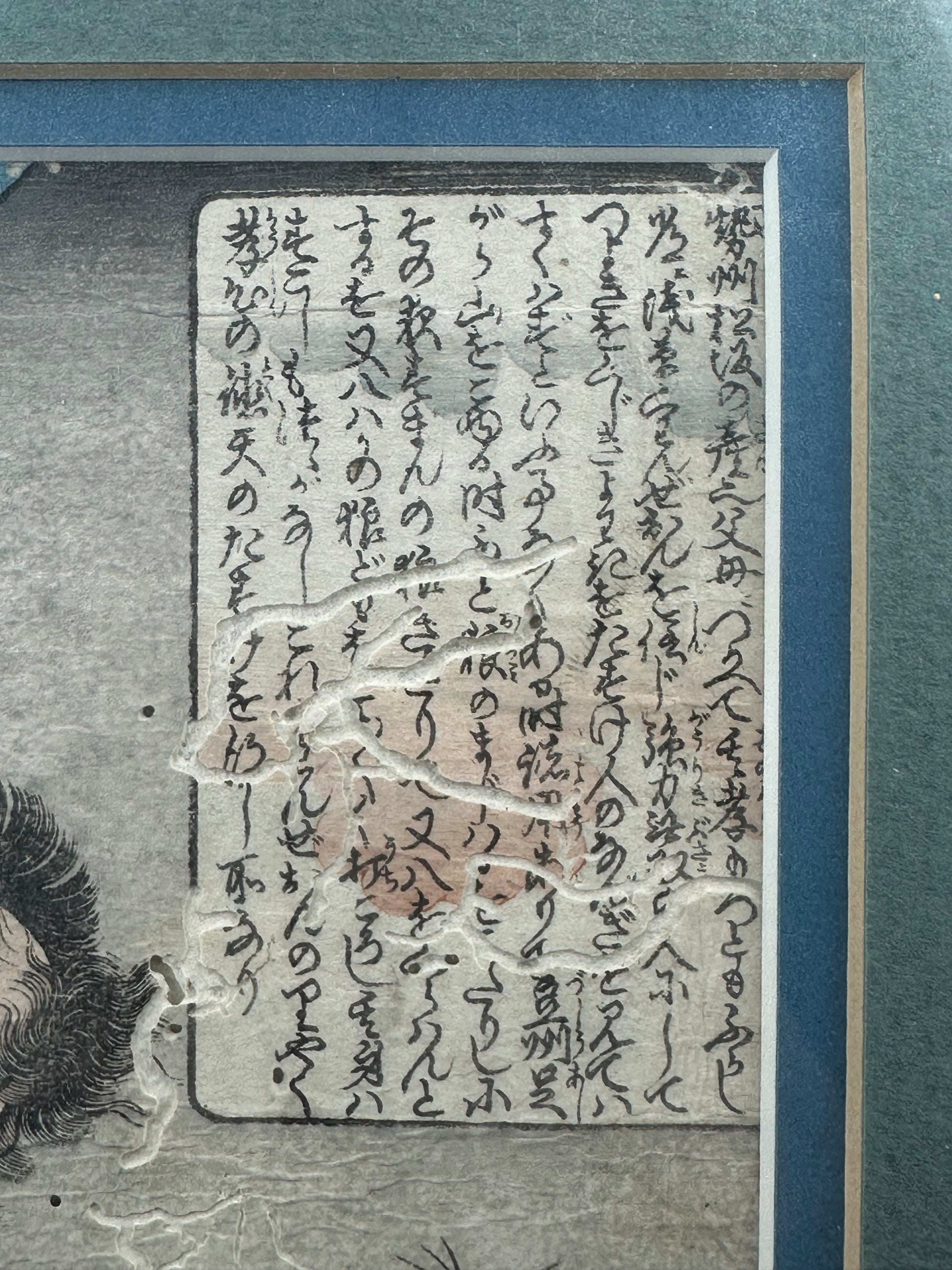 Antique condition. Noticeable age wear including creasing, paper thinning, pigment softening, and extensive worm damage (wormage) visible throughout the sheet, with small losses and channels affecting both image and text areas. Despite condition issues, the composition remains visually powerful and legible. Framed for stability and display.