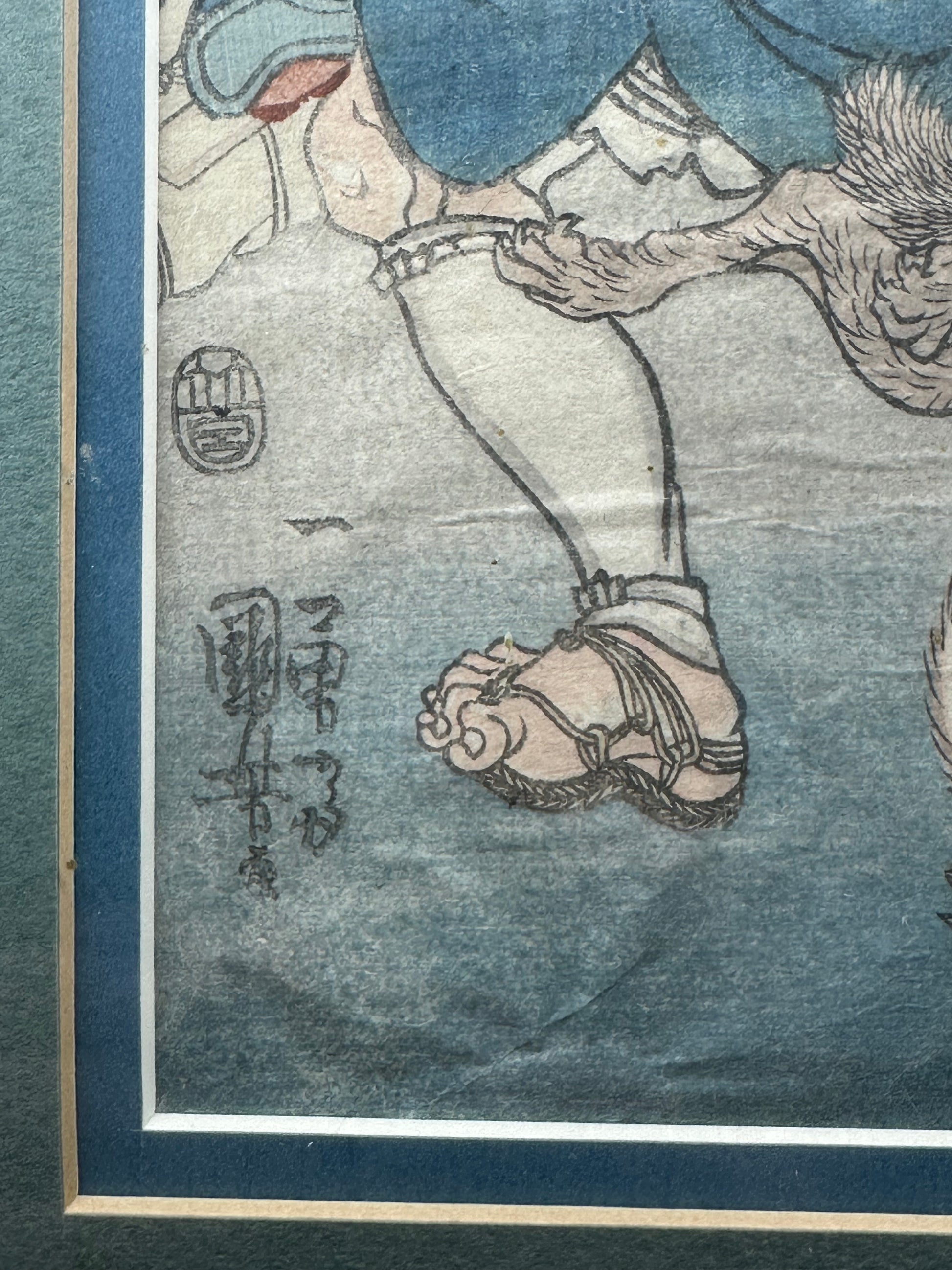 Printed on handmade washi paper using multiple carved blocks, the work reflects Kuniyoshi’s mature period, when his warrior designs became increasingly bold, imaginative, and influential. His ability to merge physical power with narrative drama made these compositions among the most admired and widely collected ukiyo-e of the late Edo period.