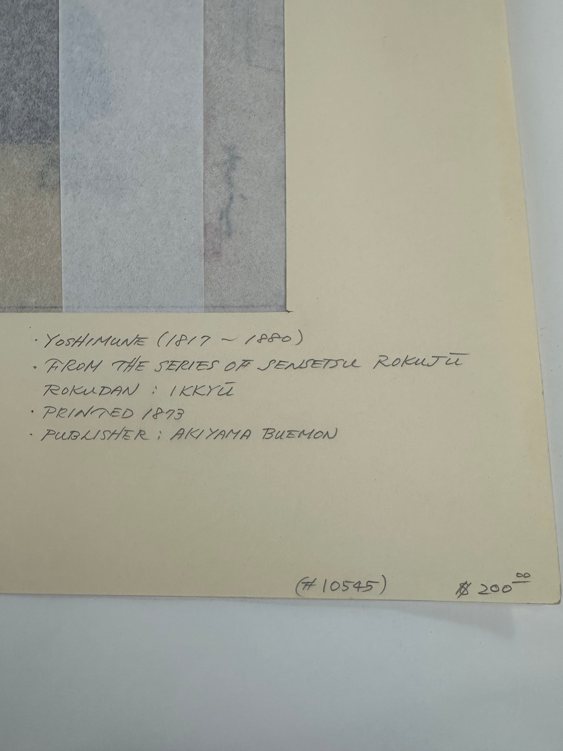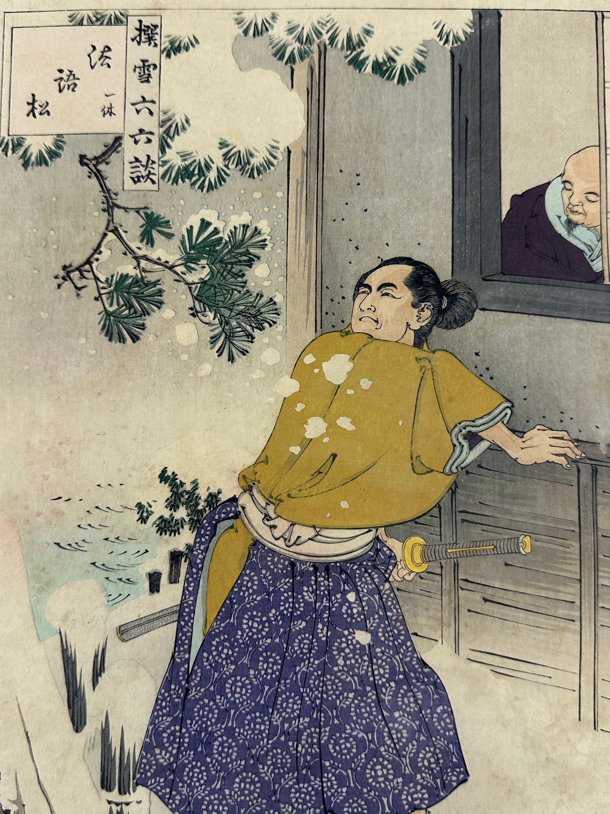 An original Meiji-period woodblock print by Arai Yoshimune II (新井芳宗, 1863 – 1941)—also known as Utagawa Yoshimune II—from the narrative series Thirty-Six Selected Tales of Snow (摂雪三十六談 Setsugetsuroku Sanjūrokuban), published by Akiyama Buemon (秋山武右衛門). The design is titled “Pine Law” (法語松 Matsu Hōgo).