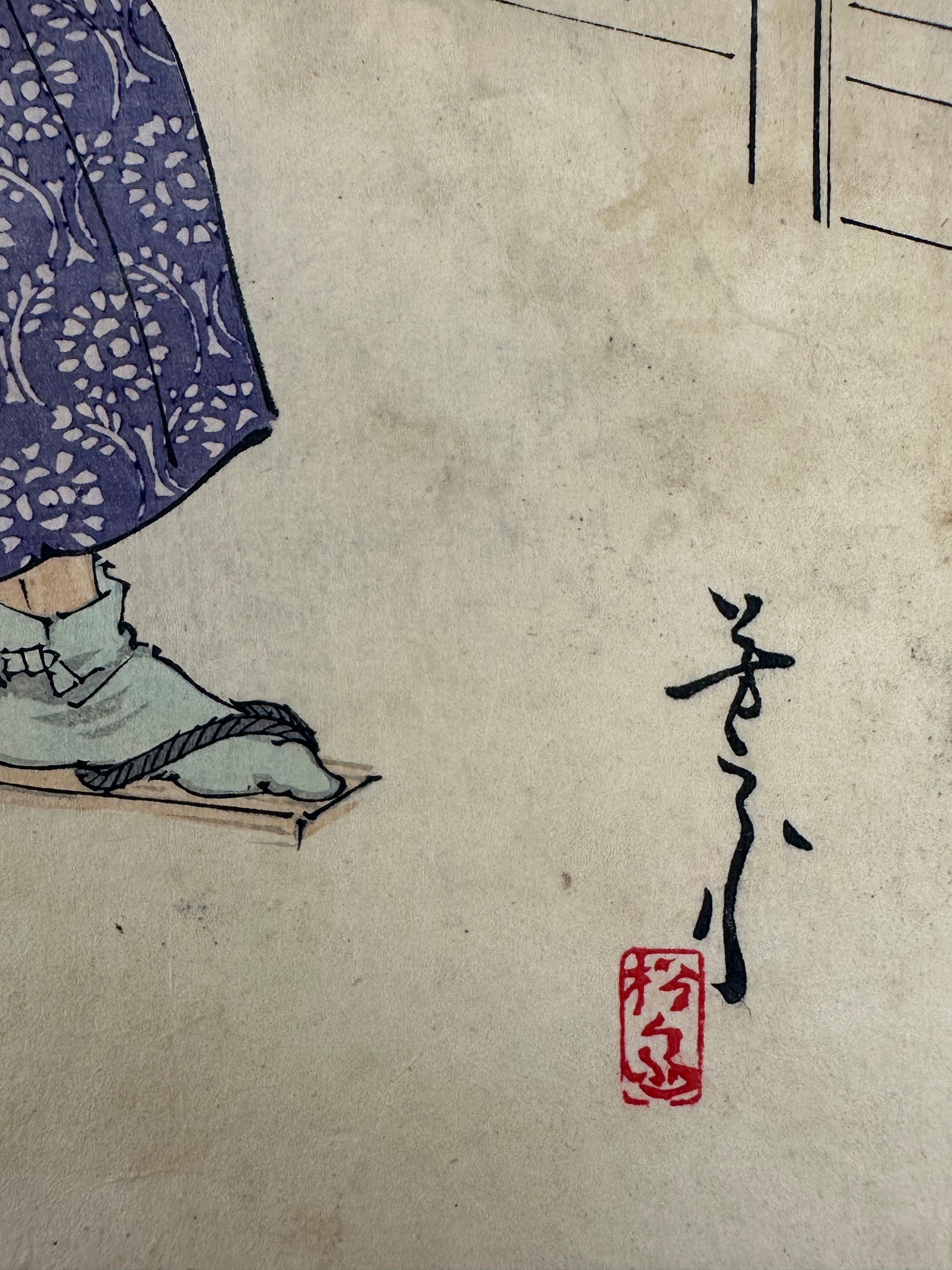 Printed in soft, refined colors with subtle bokashi shading and embossed snow effects, the piece showcases Yoshimune’s early technical skill and narrative flair, continuing the ukiyo-e tradition into Japan’s modern era.