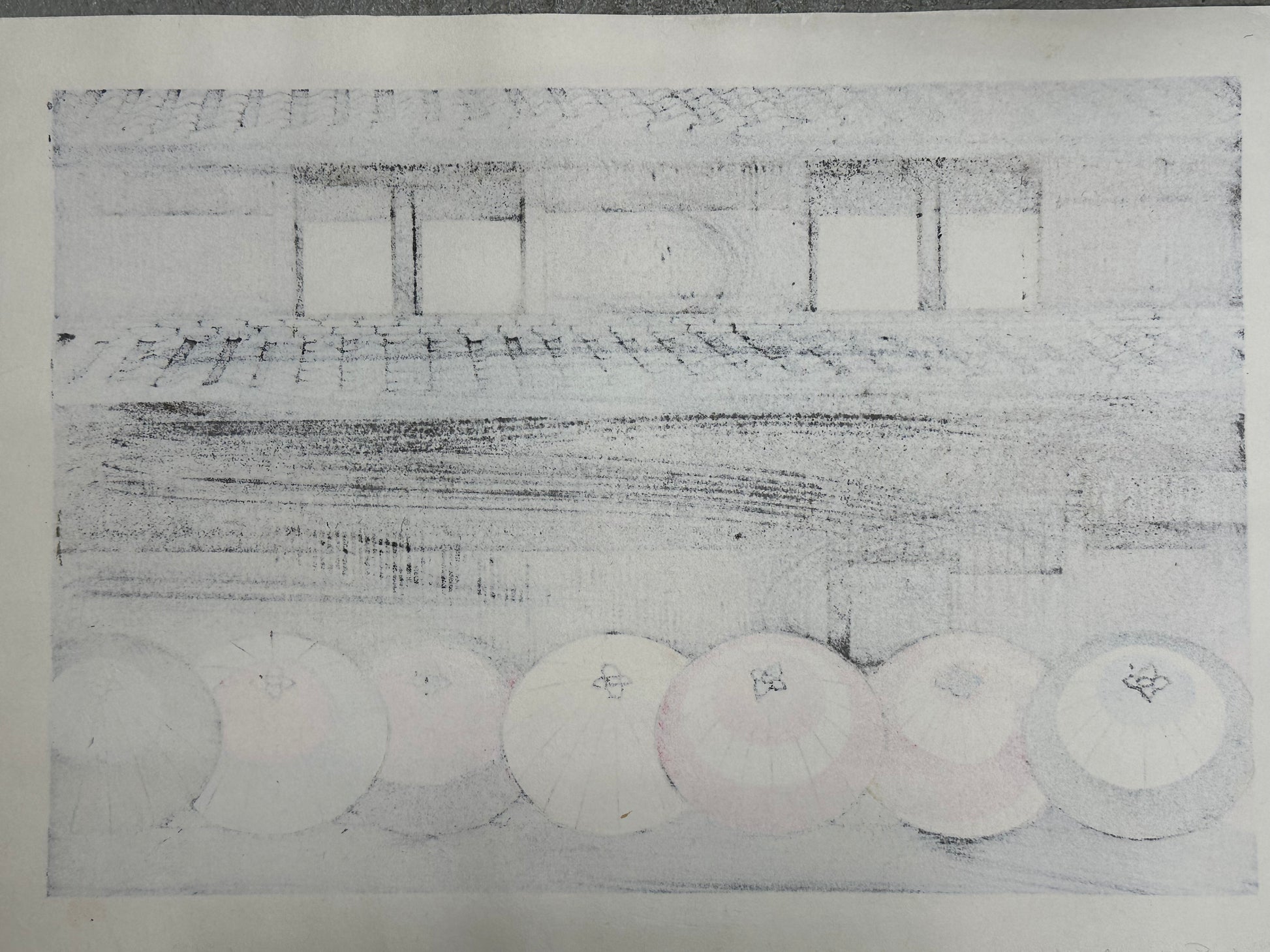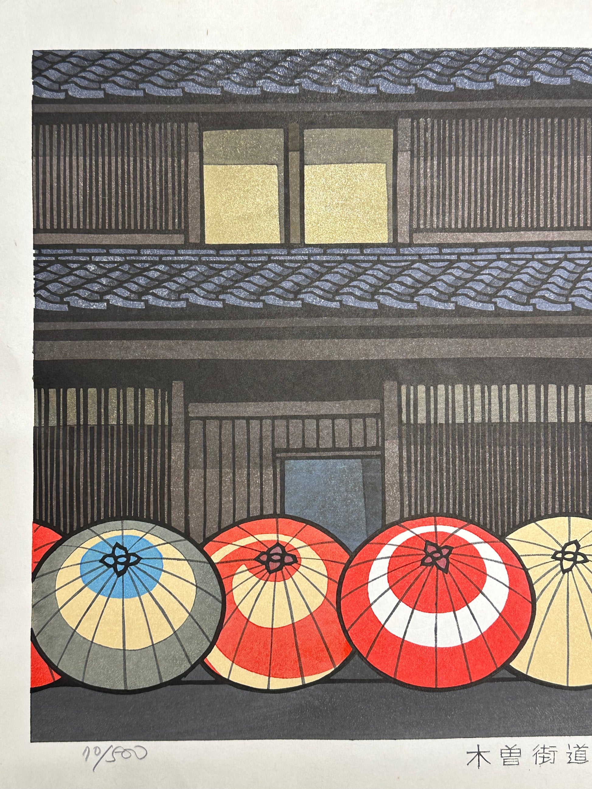 Rendered in Nishijima’s distinctive style of bold contours and careful bokashi (gradation), the composition captures the serene balance between craft and structure that defines Japan’s old townscapes. The umbrellas evoke both the artisan culture of the Kiso post towns and the graceful order of traditional life along the highway.
