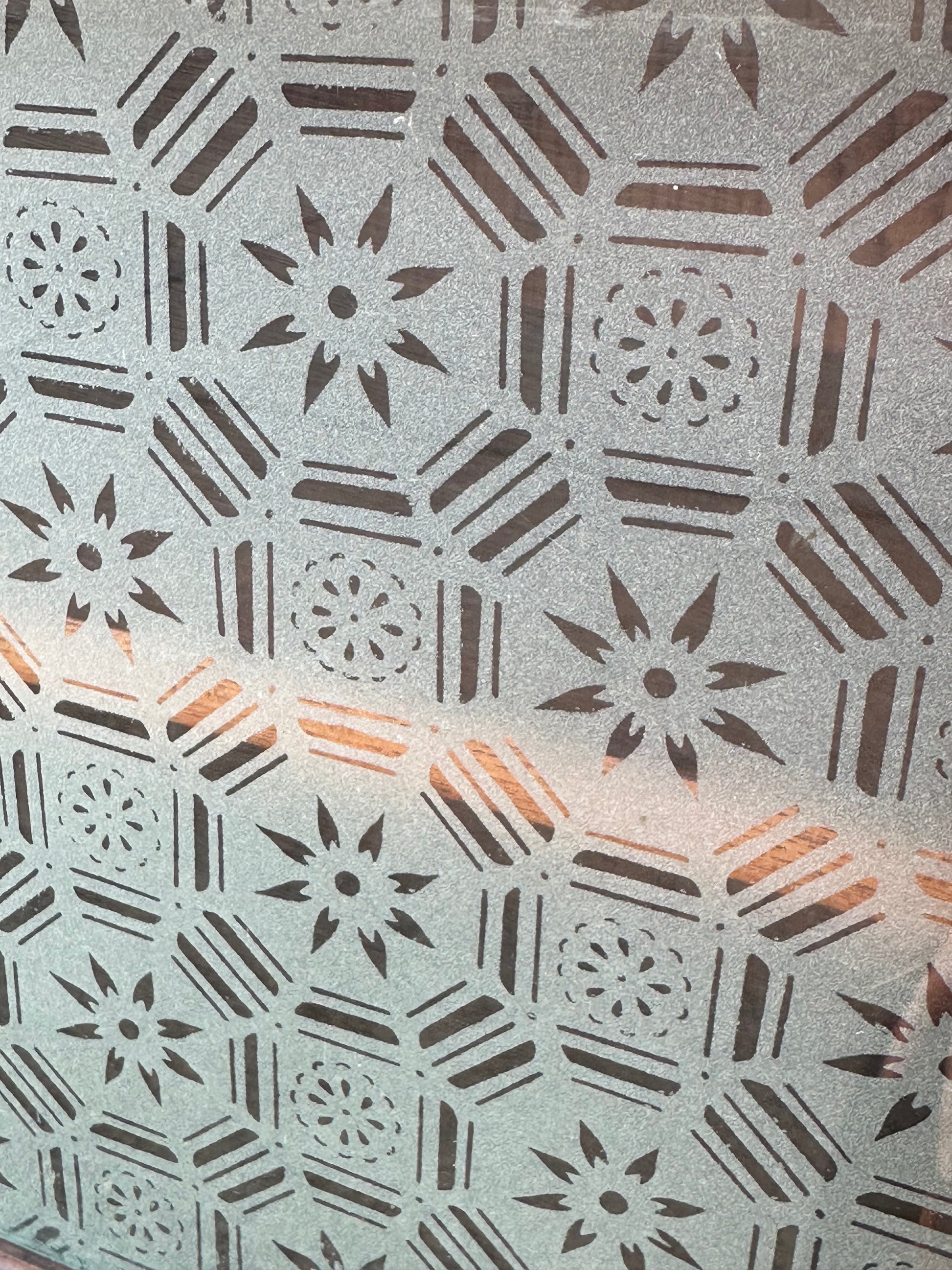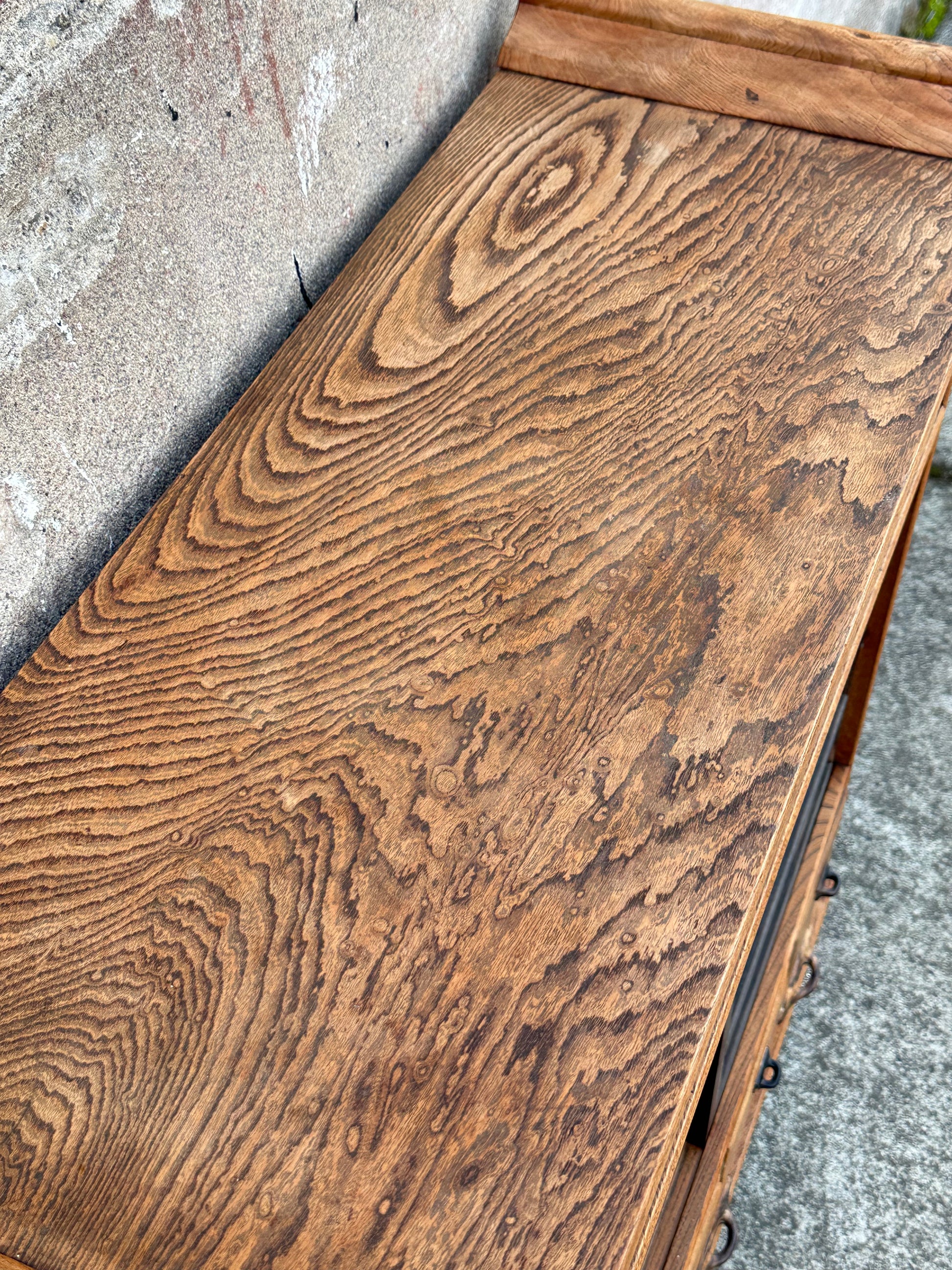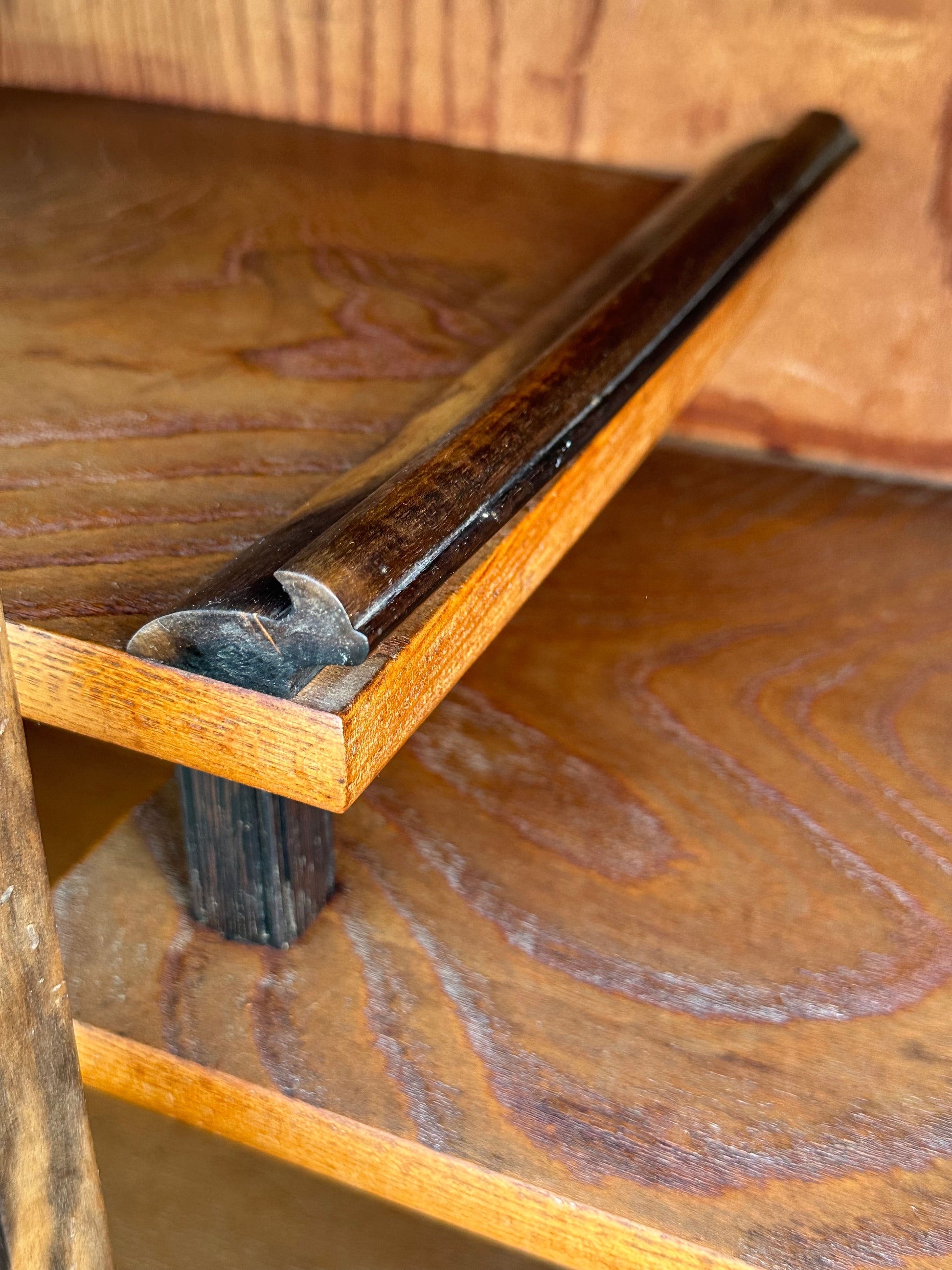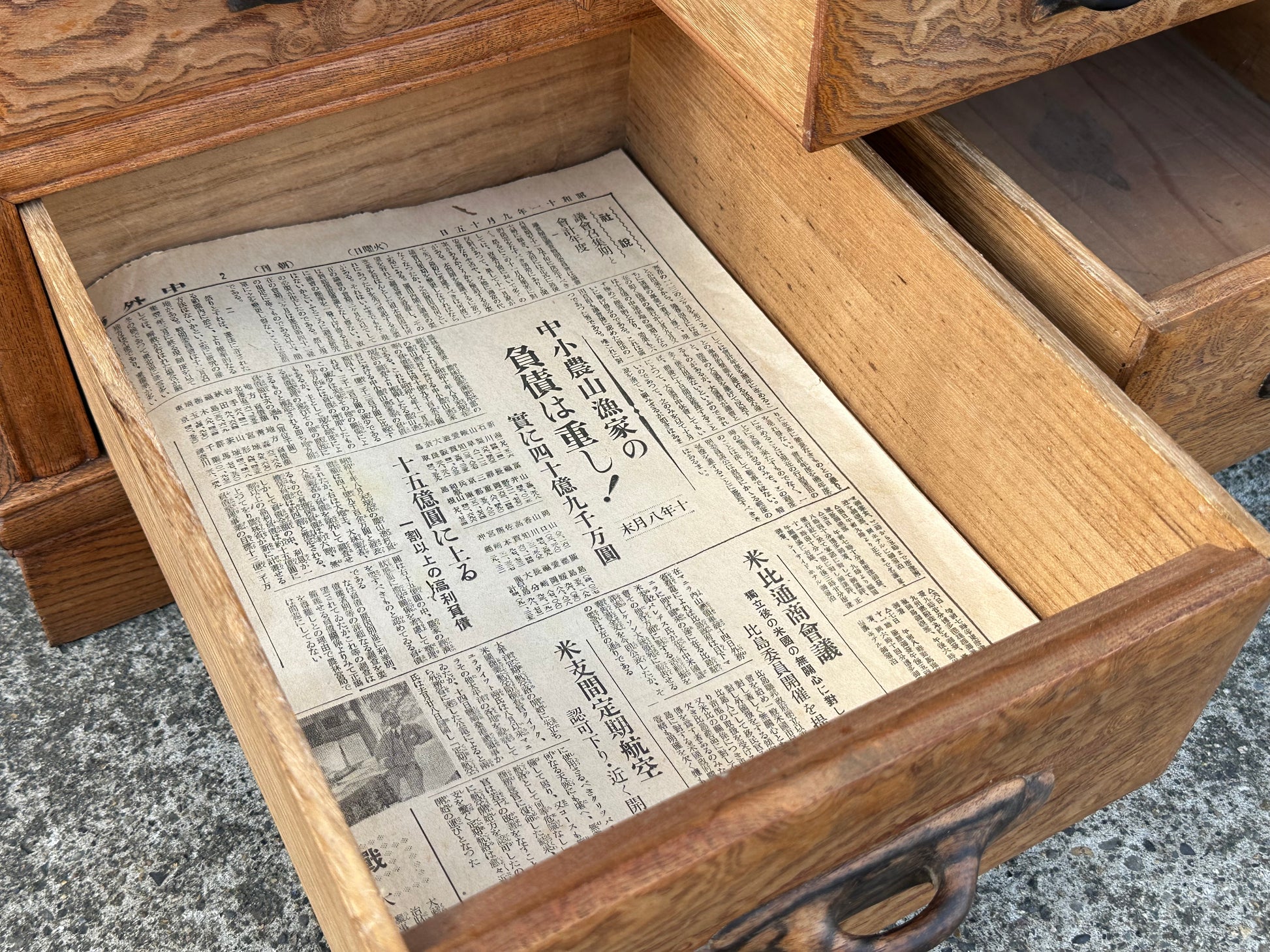 Estimated to date from the early Shōwa era, circa 1937, based on an original Japanese newspaper sheet discovered lining one of the lower drawers (included and retained), this cabinet would have been used in a merchant’s tea or household setting to store fine chadōgu (tea ceremony tools), ceramics, and daily items. The interior offers seven hand-joined drawers and sliding doors fitted with original translucent patterned glass in a traditional kōshi / kumiko-style design.