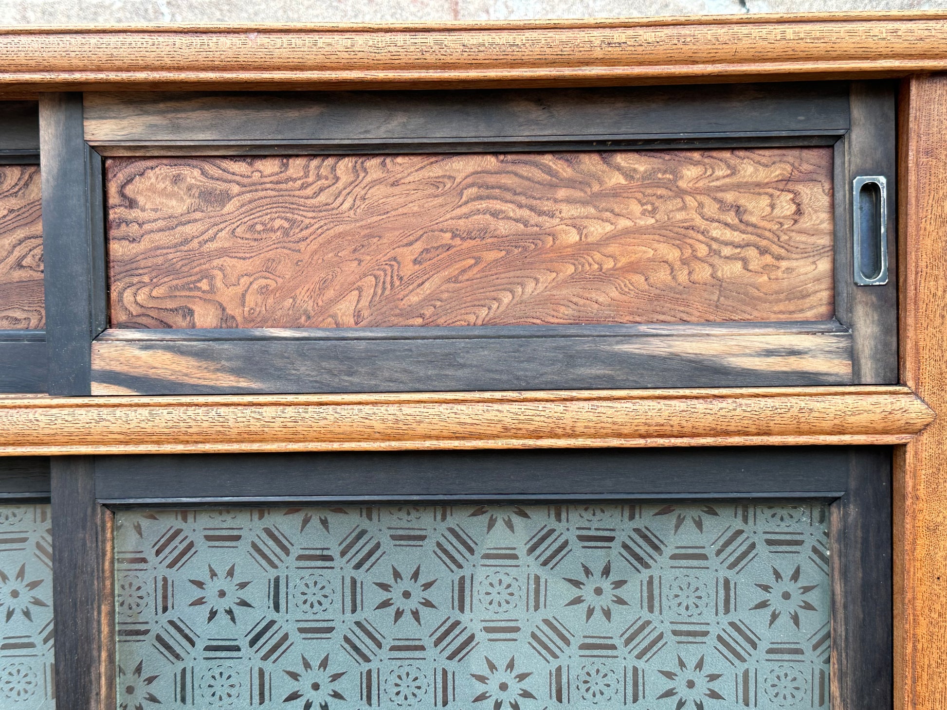 Materials: Keyaki (zelkova) body, Persimmon wood trim & pulls, glass sliding doors
