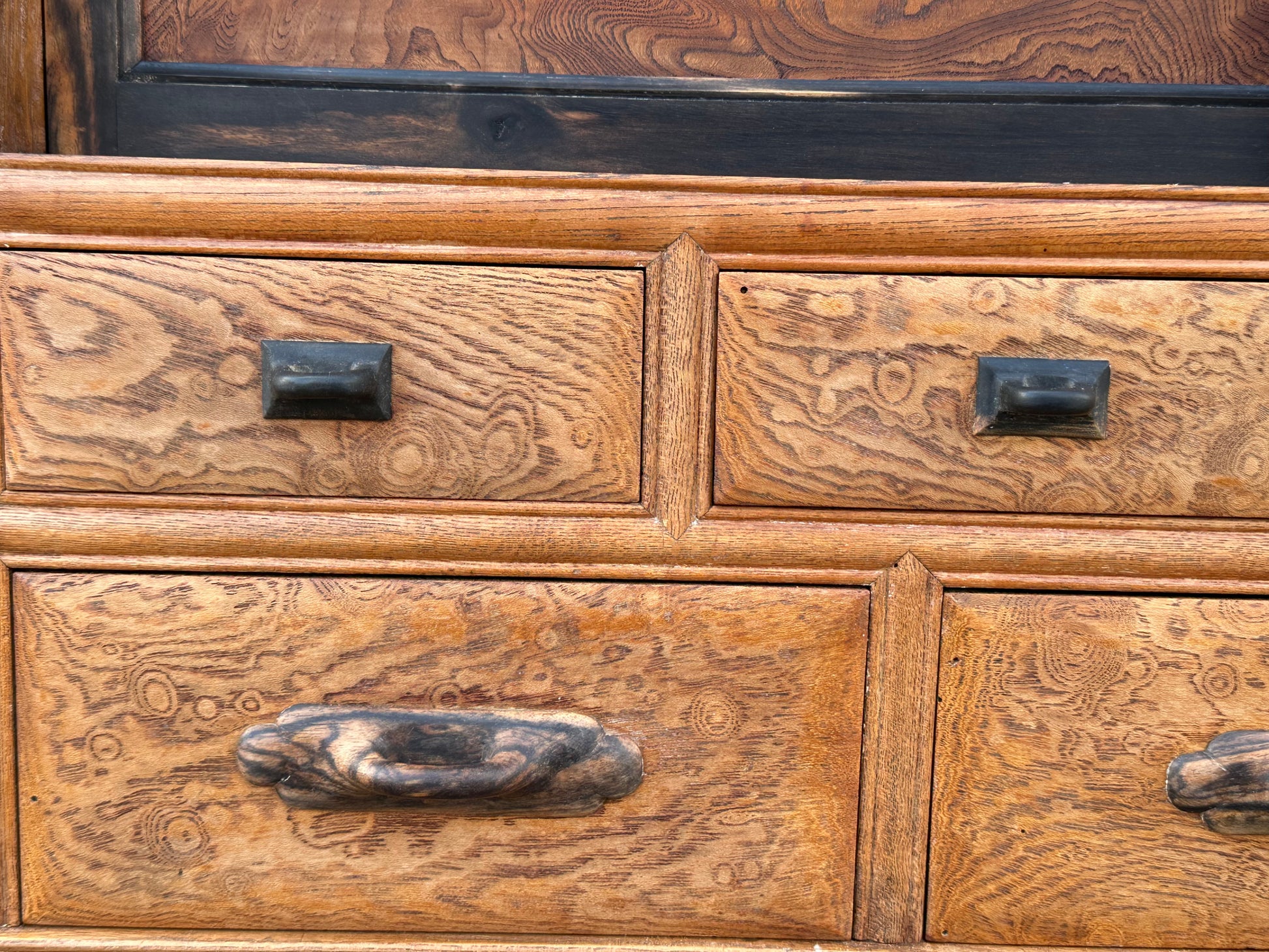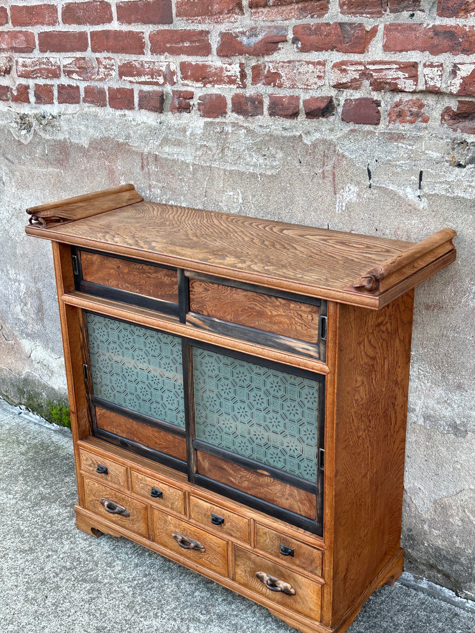 Rare Antique Japanese Keyaki Chadansu c1937 Cabinet Carved Crane & Turtle Finials Persimmon Trim 36"W