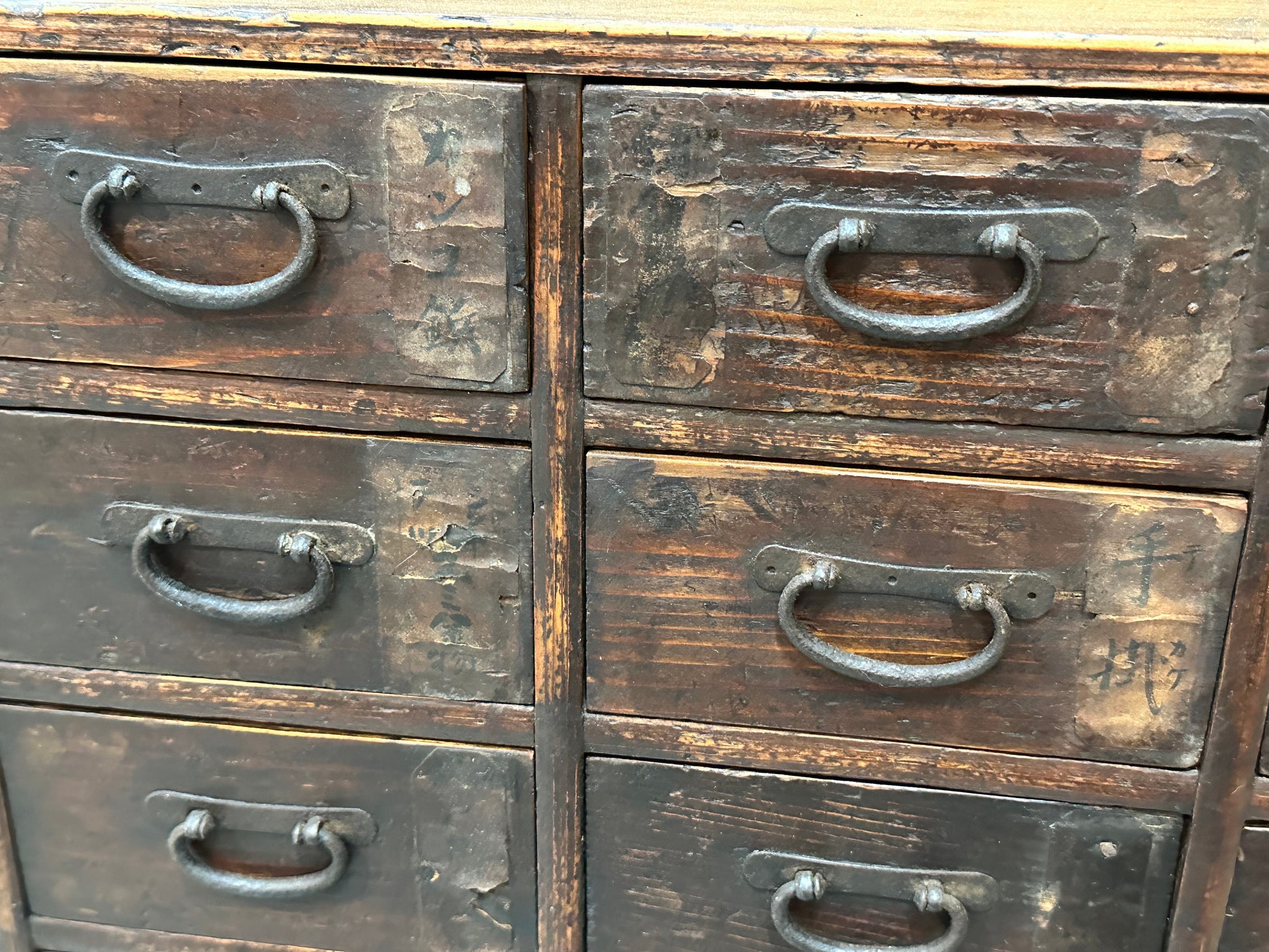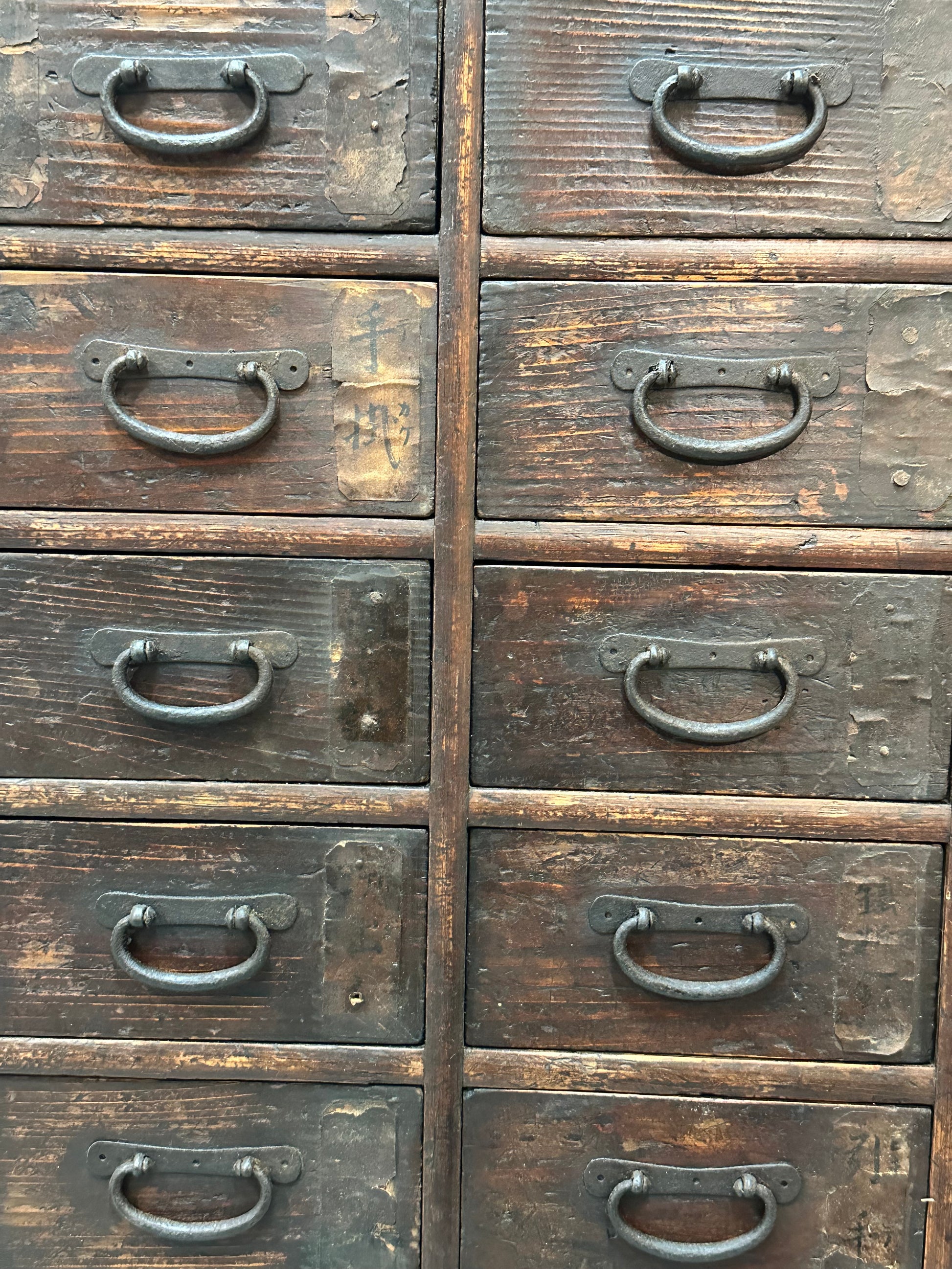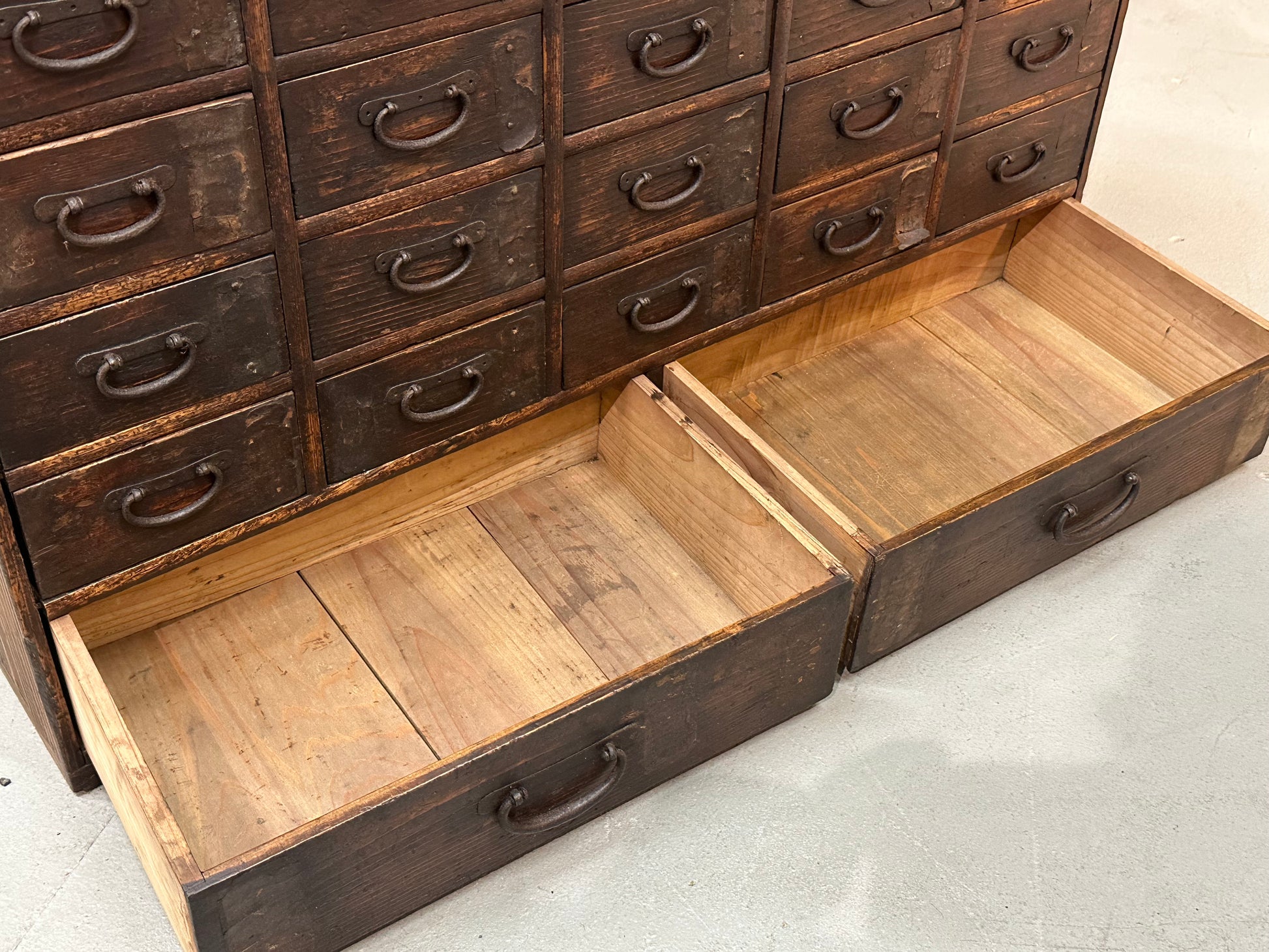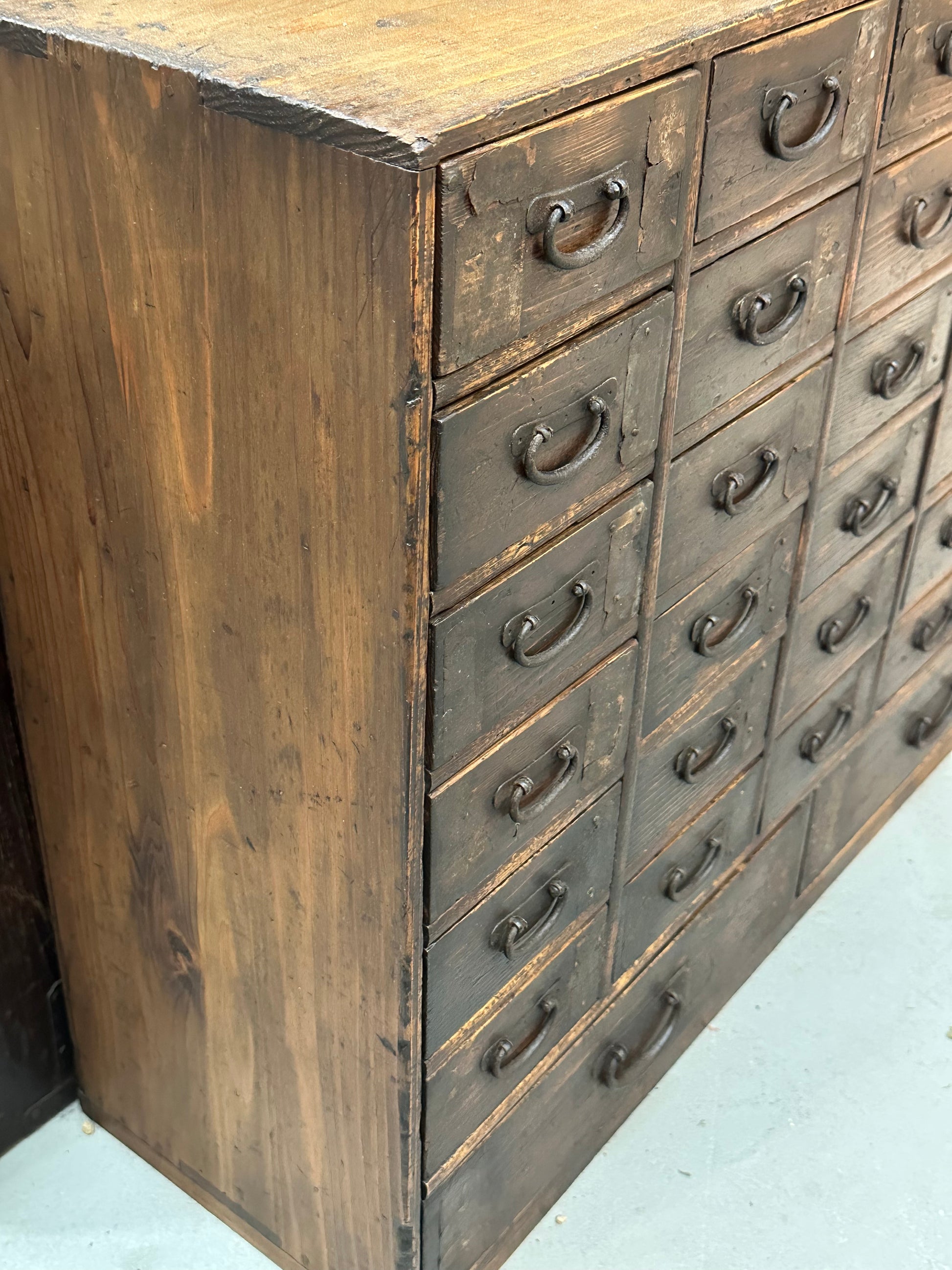 This late Edo period Kusuridansu (薬箪笥) is a traditional Japanese apothecary chest, originally used by herbalists and village medicine sellers to store and organize medicinal ingredients. The cabinet is constructed in solid softwood with a dense grid of small drawers, each fitted with original hand-forged iron pulls and backing plates, showing deep surface oxidation and long use. Most drawers retain faint inked kanji inventory marks on the original paper labels, a detail consistent with functional medical storage rather than domestic furniture. The interior drawers reveal lighter, unfinished wood with visible hand-cut joinery, while the exterior surfaces display layered wear, abrasions, and patina developed over nearly two centuries of daily handling. Two full-width base drawers provide larger storage, a typical feature of working kusuridansu intended for bulk herbs or tools.