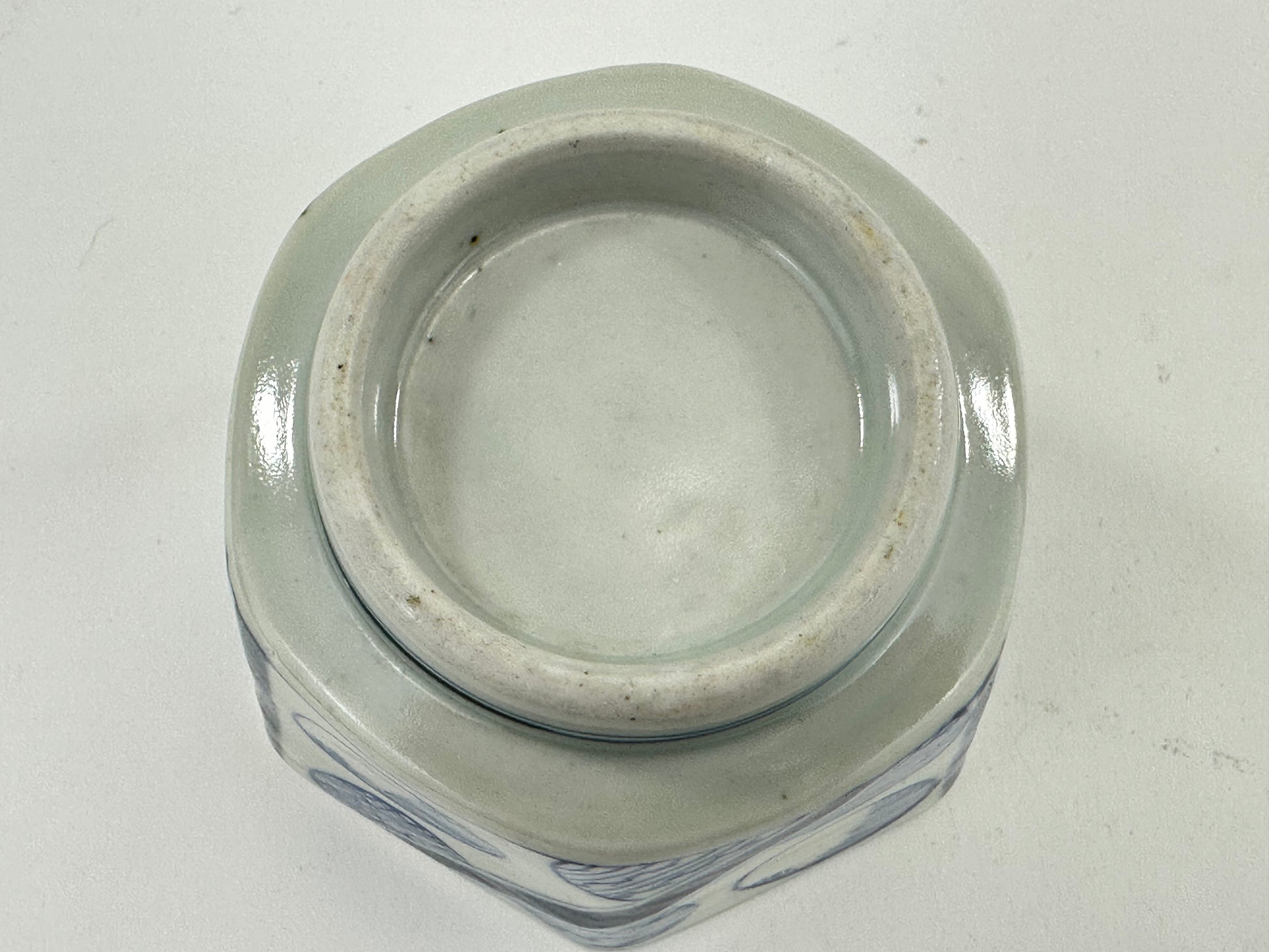 The unusual hexagonal form and playful pattern balance formal refinement with artistic spontaneity, making it a desirable piece for collectors of fine Japanese porcelain, tea utensils, or interior display.