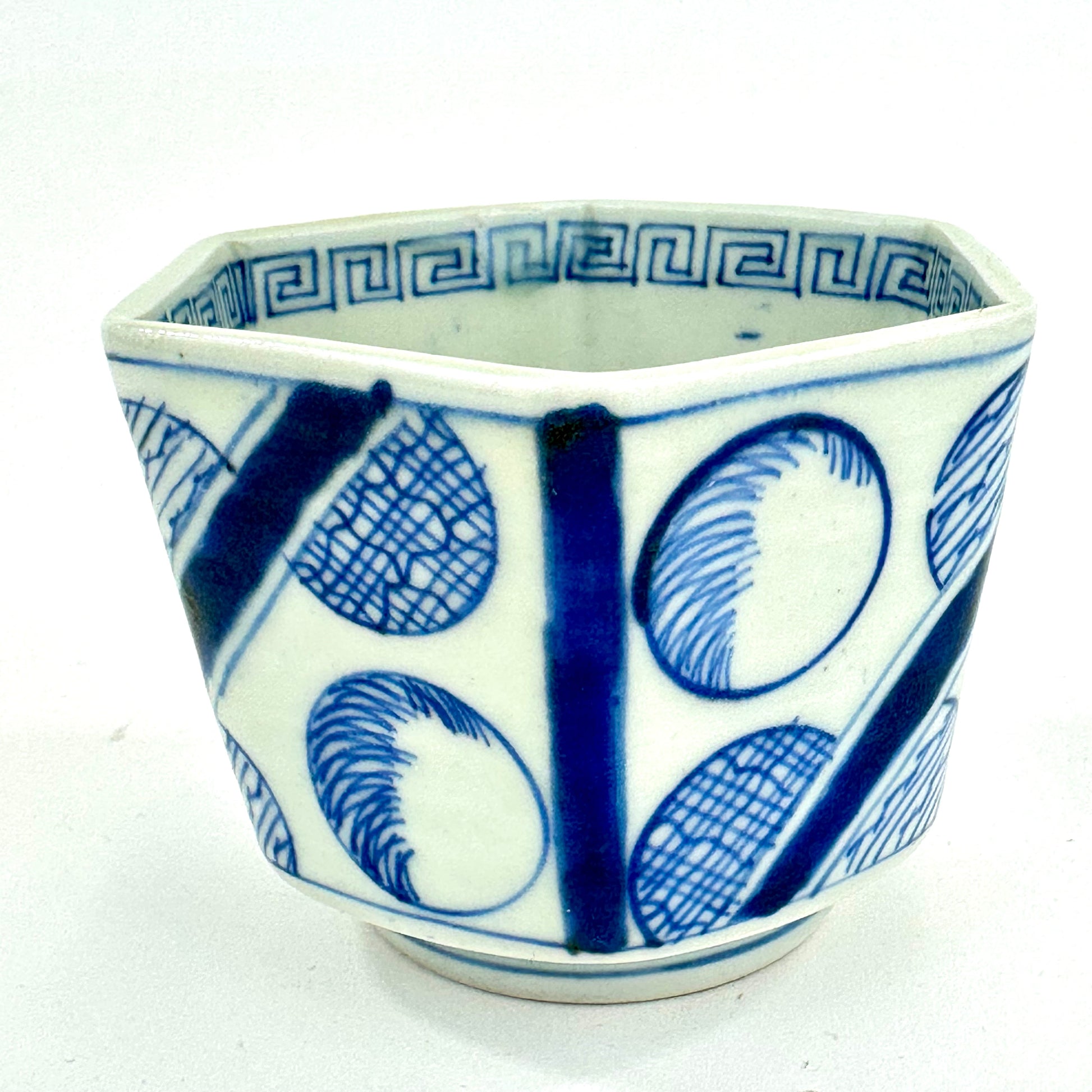 A finely hand-painted antique Japanese Arita / Imari blue-and-white porcelain cup, dating to the late Edo–early Meiji period (19th century). Formed in an elegant hexagonal shape, each facet decorated with alternating circular medallions in a variety of geometric patterns, intersected with bold diagonal brushwork.