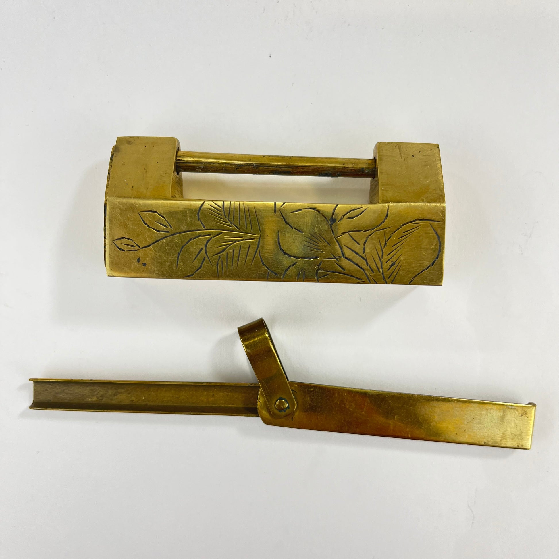 This is a vintage Chinese traditional brass lock & key for a chest or cabinet. It has all of its original patina. It is still operational with included key (see pictures).