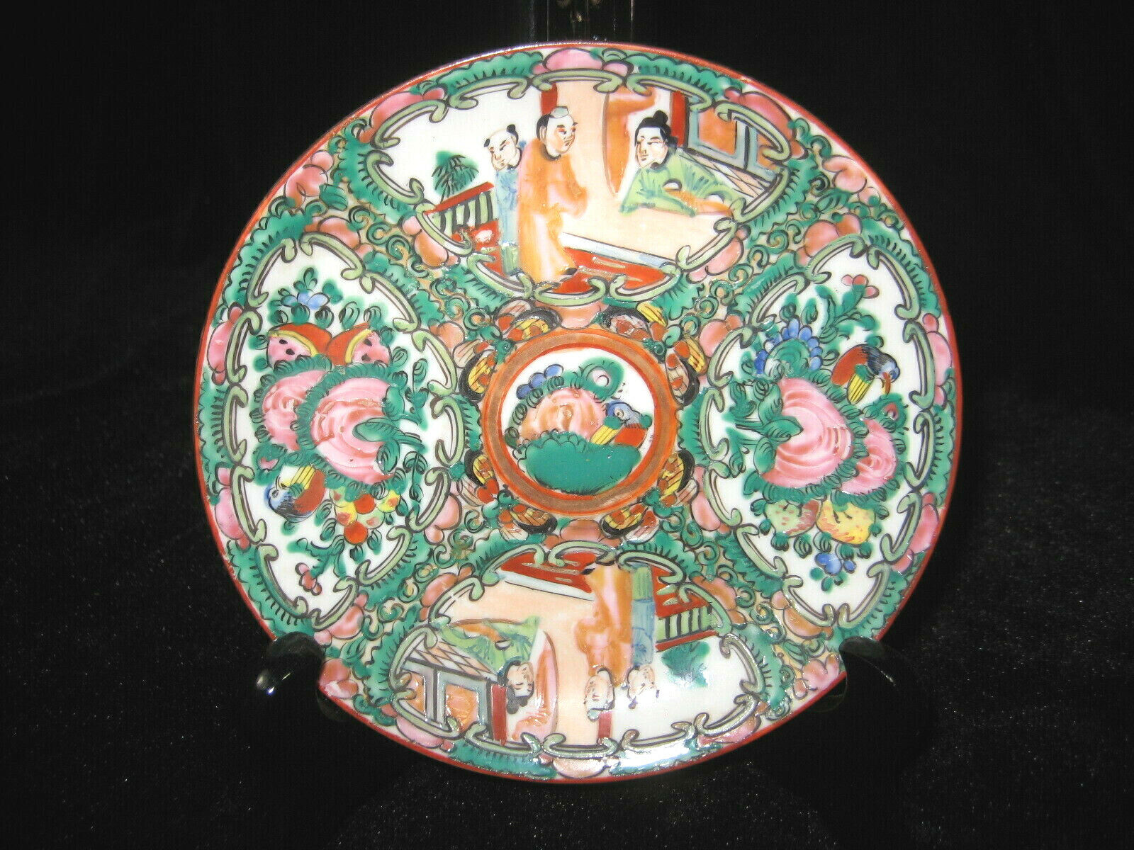 This is a vintage hand painted Chinese porcelain plate. This plate has a traditional design using flowers, birds and people in the motif. Marked on the back "Made in China".