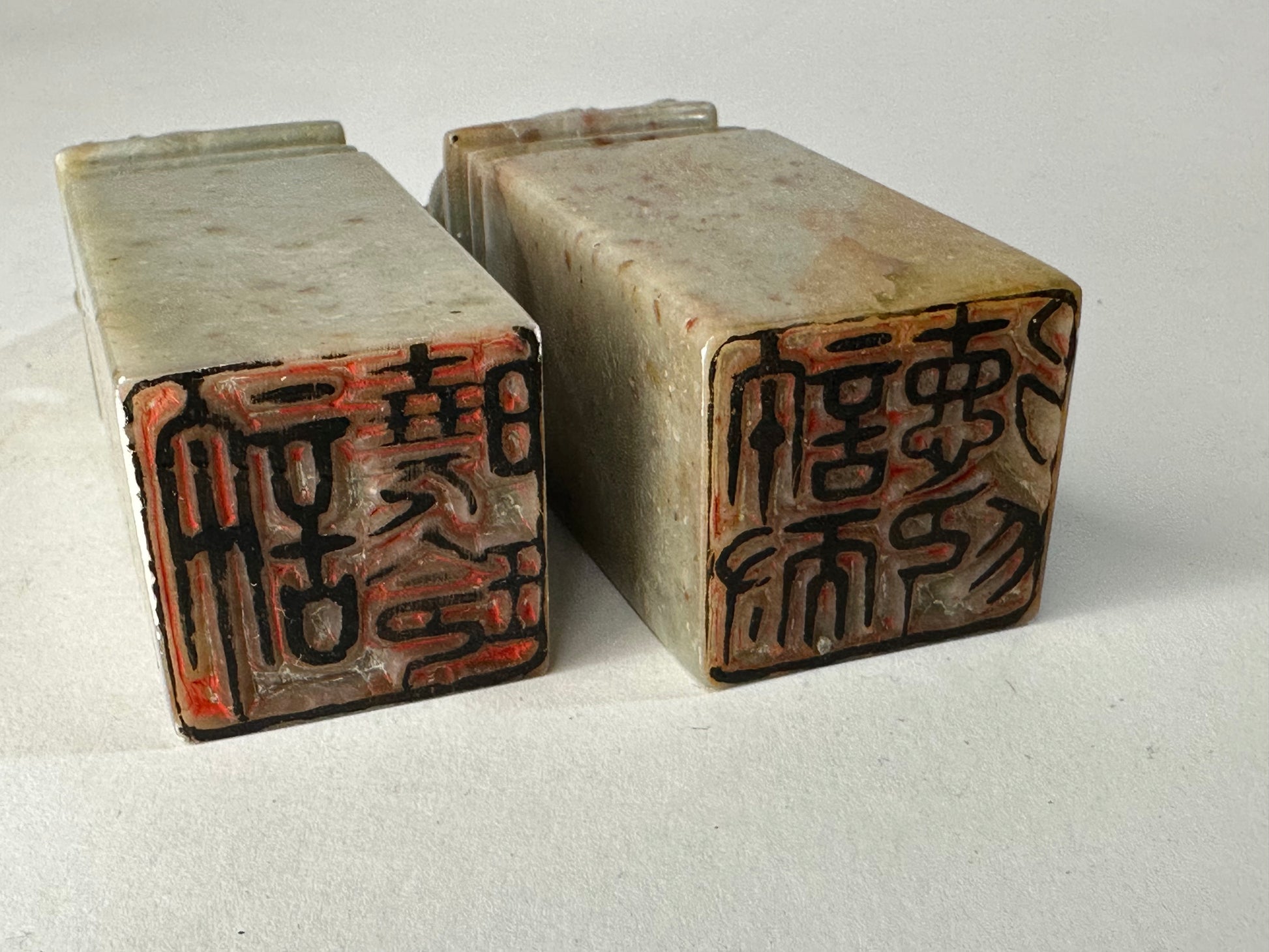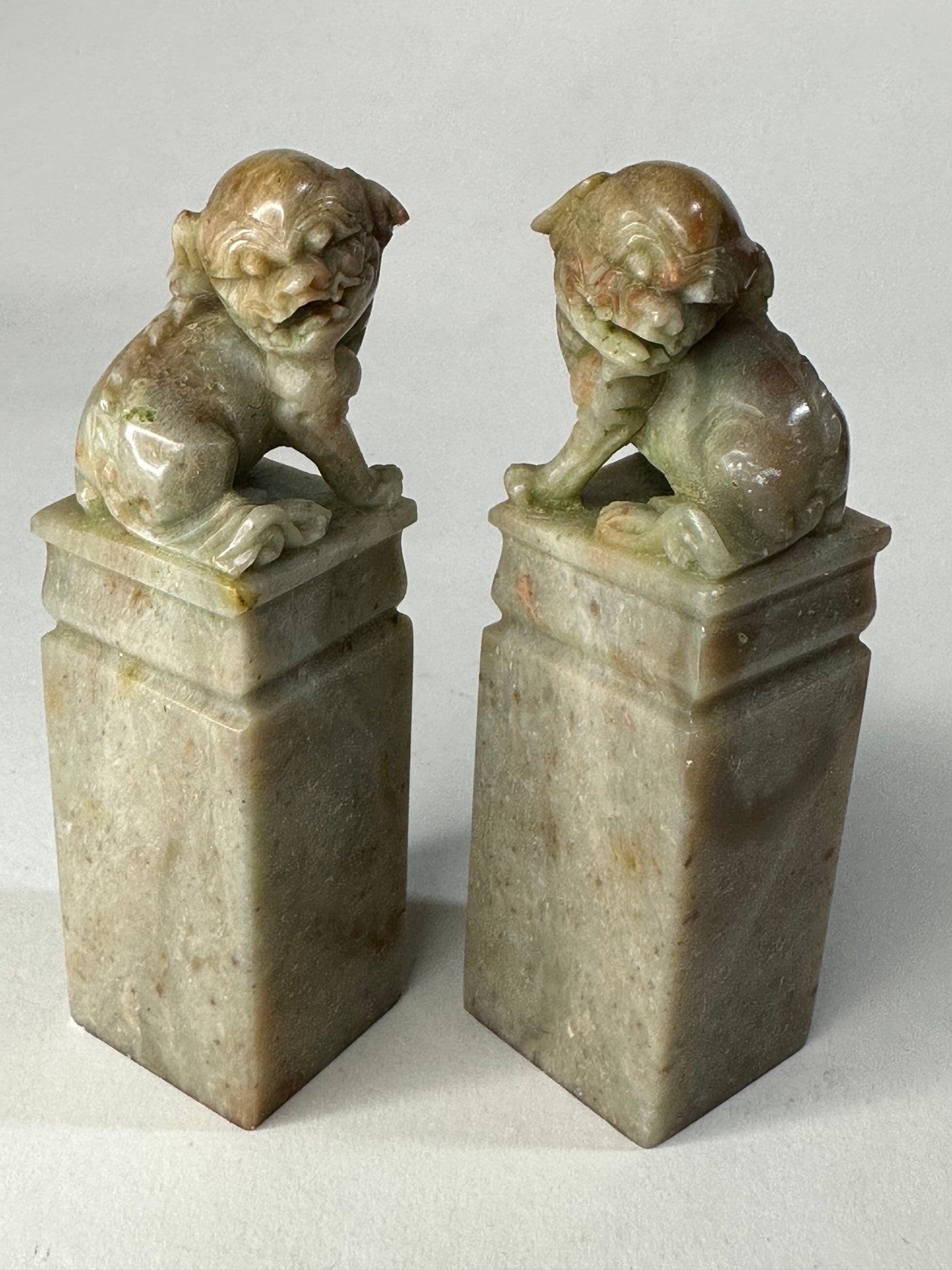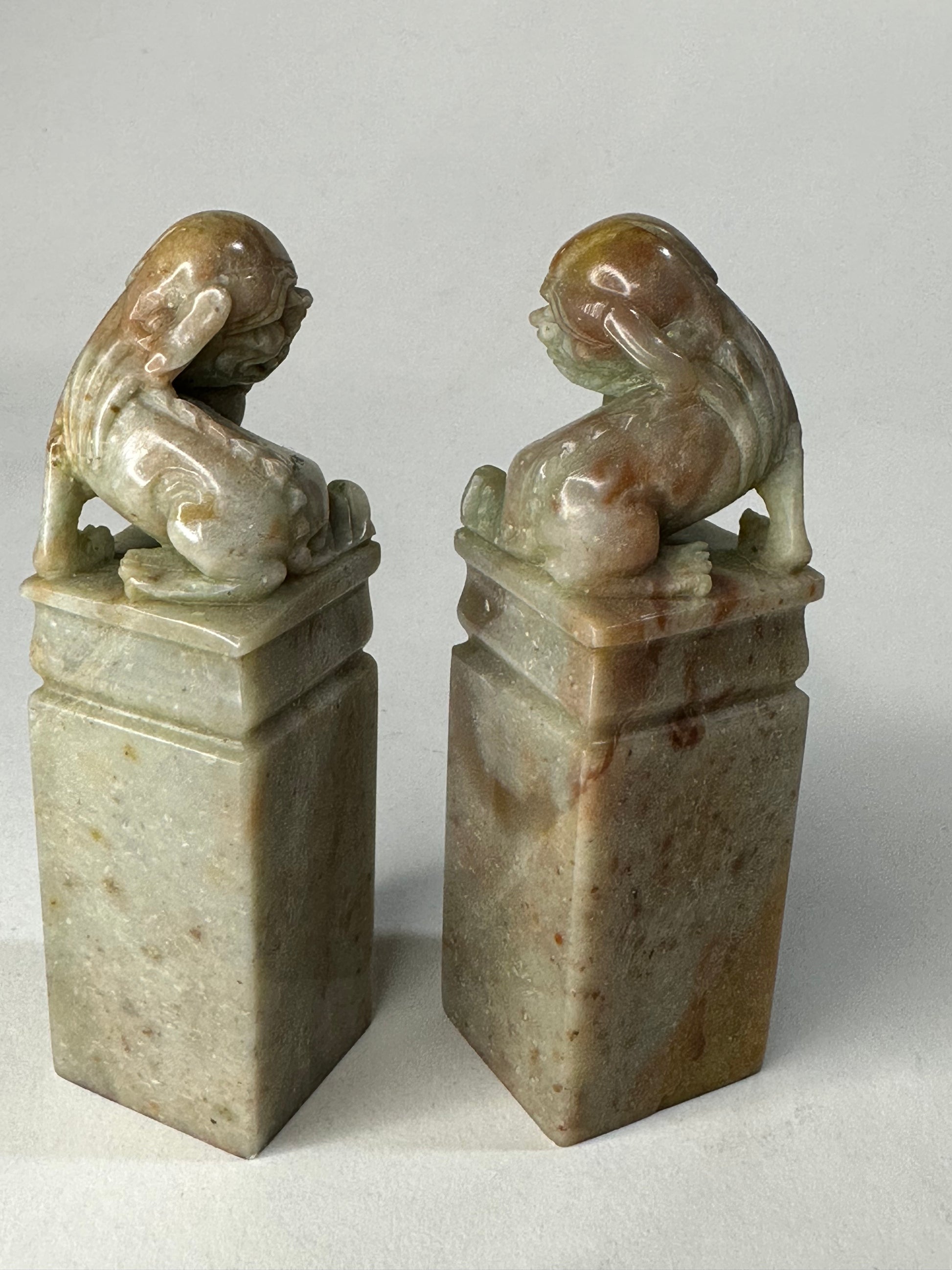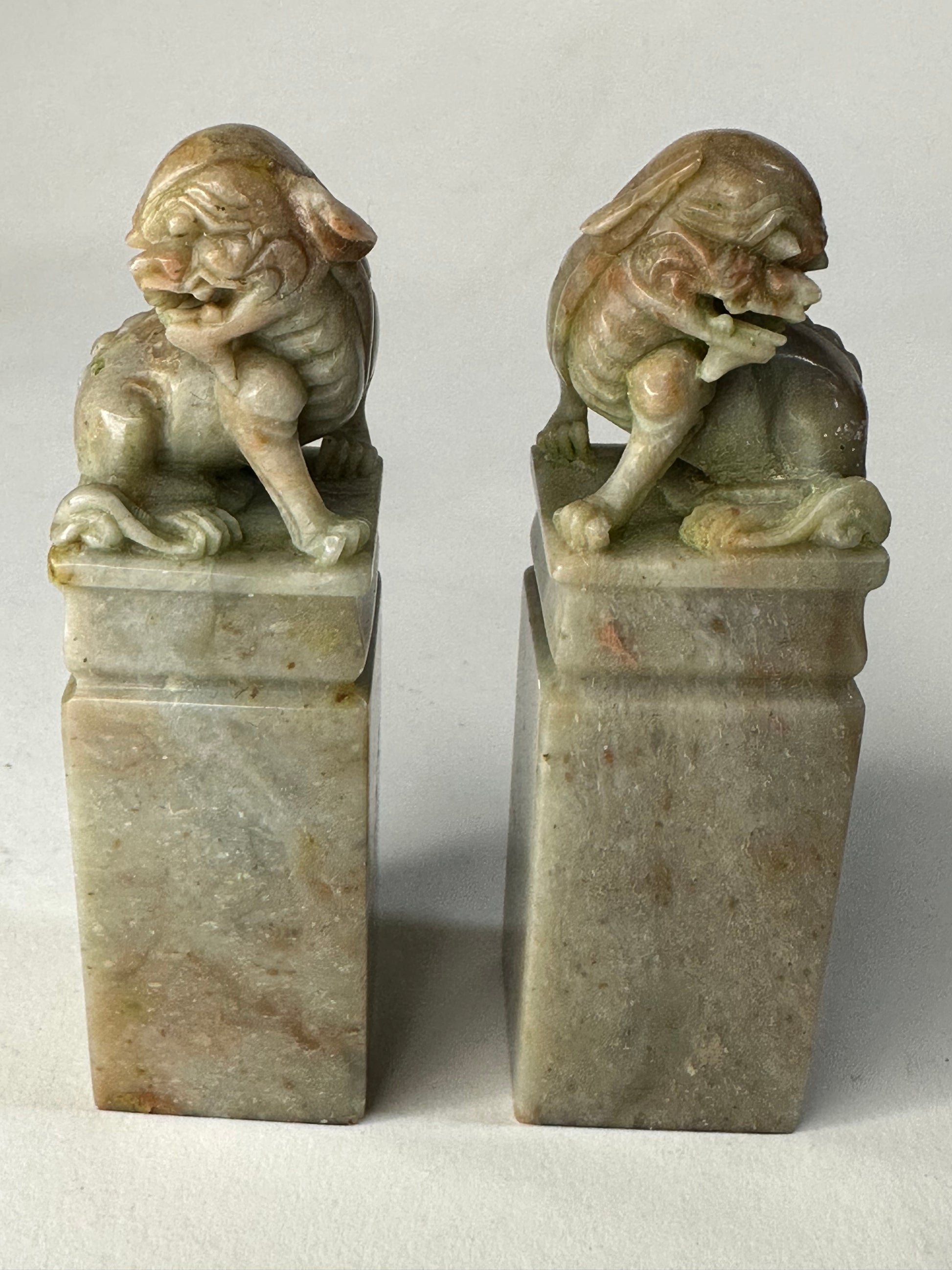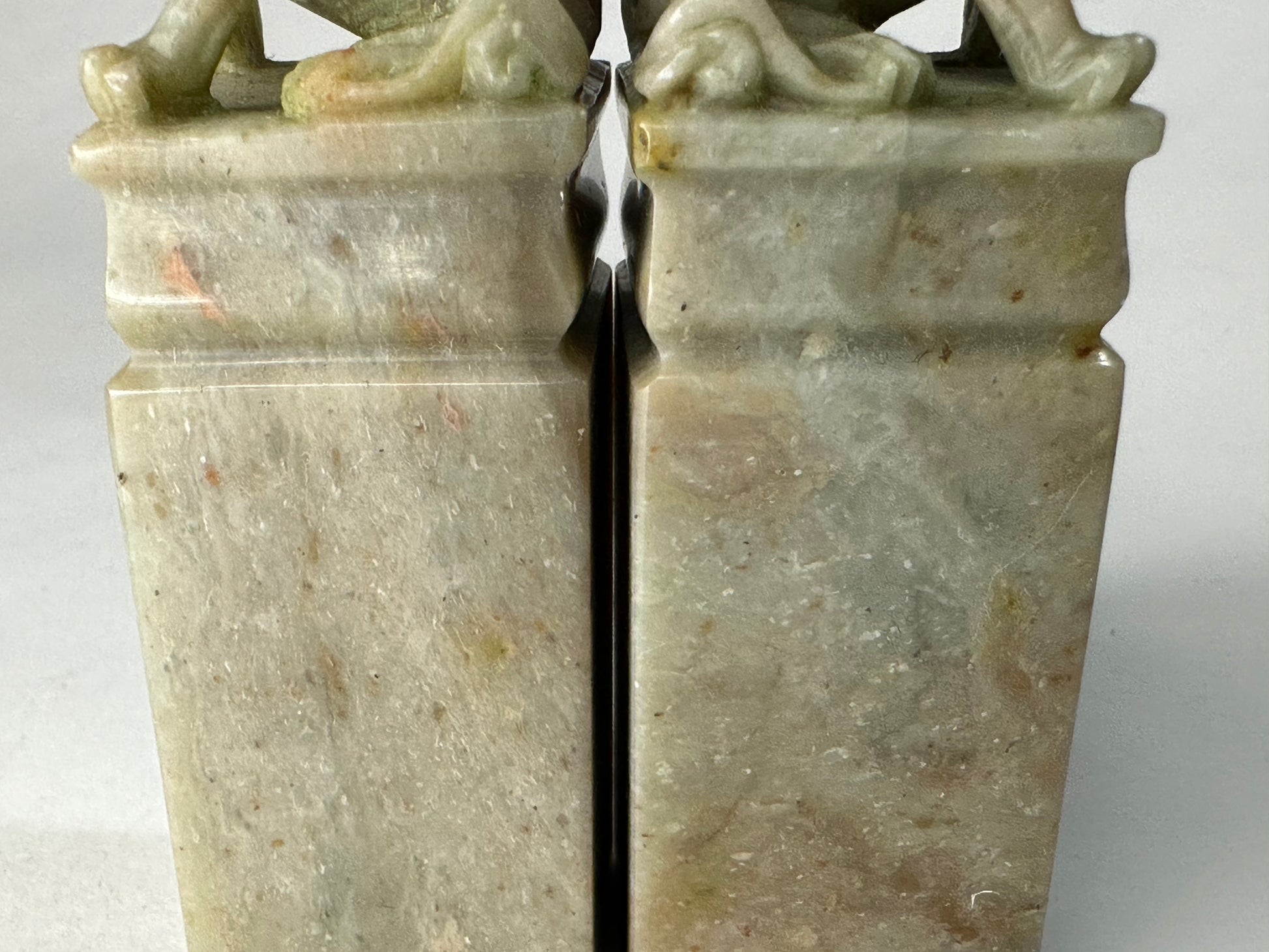 This is a pair of matching vintage Chinese marble stone name stamps. In Japan and China one does not sign, but rather stamp ones name with a chop or inkan like this one. These inkan have nicely carved names in Chinese Seal Script characters and hand carved foo-dog on top. The foo-dog carving is very well done.