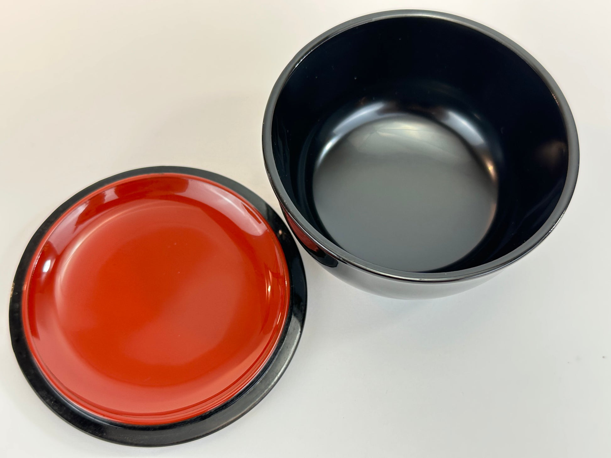 The lid is lift-off with a clean, even seam line. The underside of the lid is finished in red lacquer, creating a traditional black-and-red contrast. The interior is smoothly finished and clean, suitable for tea use. No signatures or inscriptions are visible.